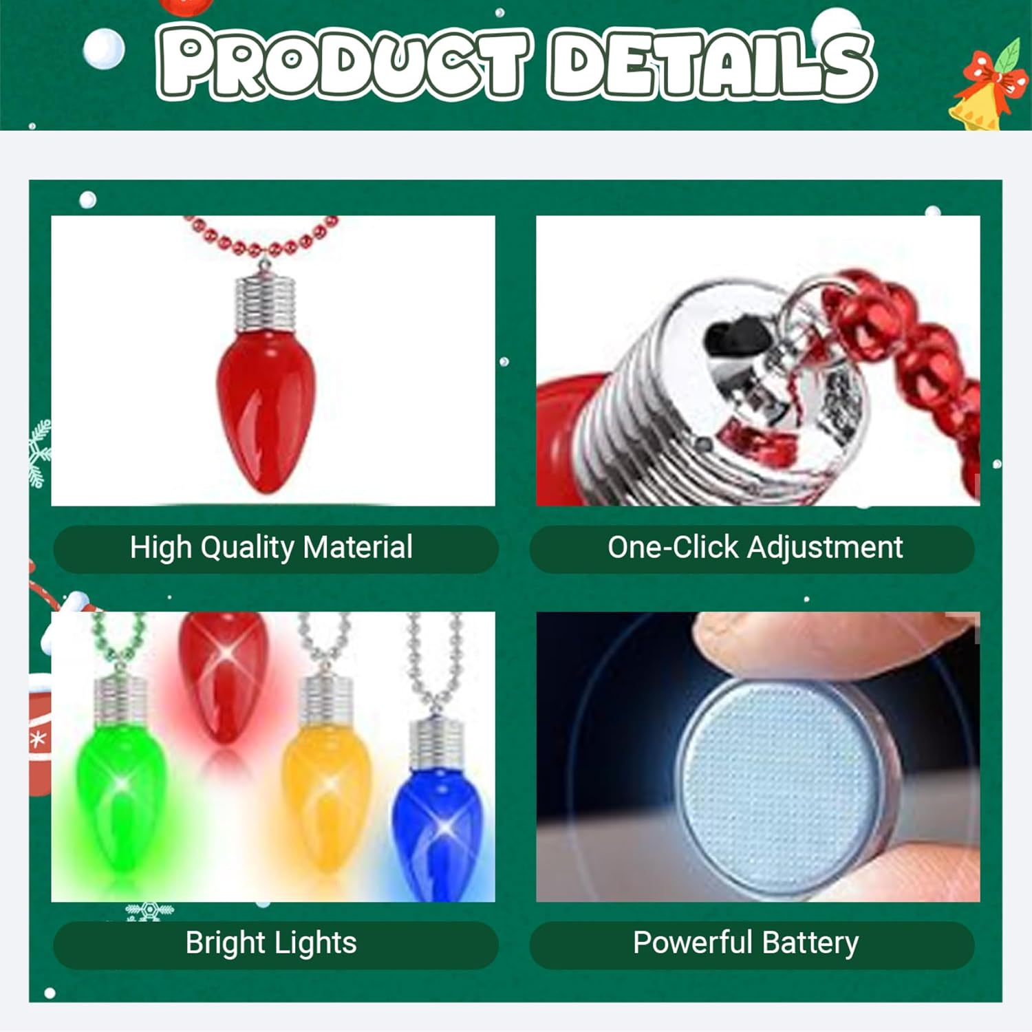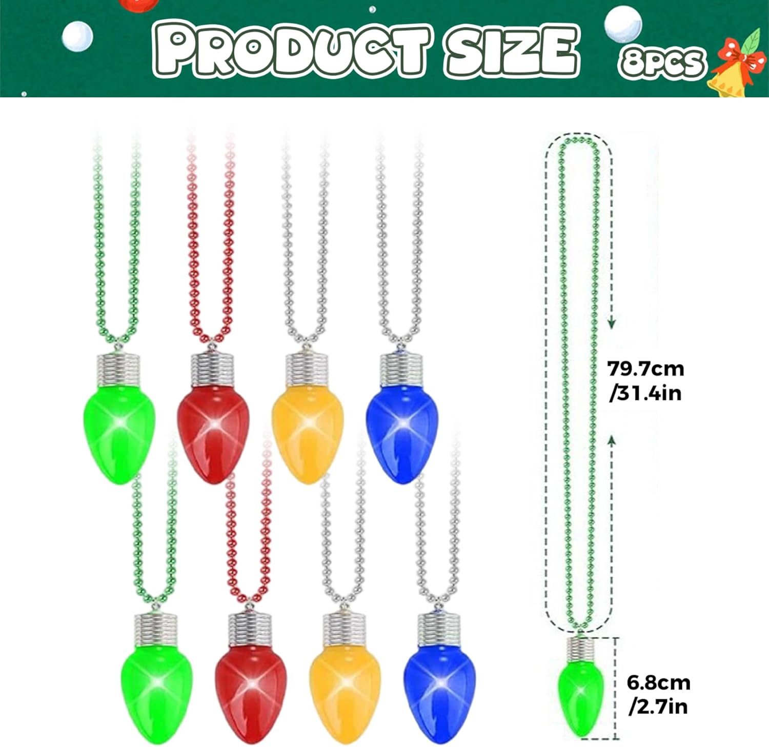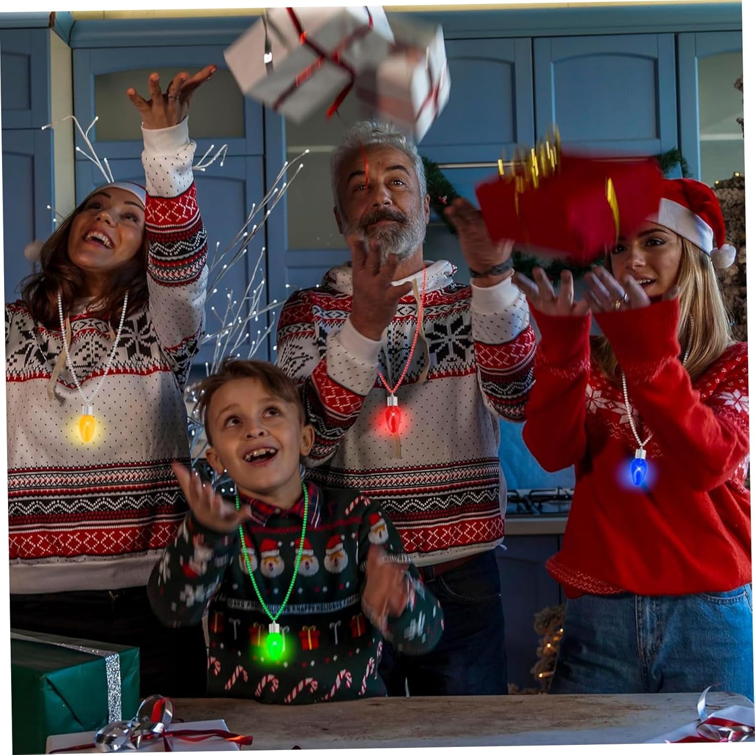 Confezione conveniente: include 8 pezzi, ideali per eventi di gruppo, gare di maglioni brutti e festeggiamenti di Capodanno, rendendo la preparazione della festa facile ed economica Accessorio versatile per le vacanze: perfetto per le feste di Natale, Capodanno ed eventi a tema, aggiunge allegria divertente e festosa al tuo outfit e allo stesso tempo aumenta lo spirito natalizio Illuminazione festiva: le perline verde brillante, gialle, rosse e blu creano un vibrante effetto di luce natalizia che valorizza qualsiasi outfit natalizio Design robusto: realizzato con materiali plastici di qualità per garantire un uso duraturo durante molteplici festività e feste Facile da indossare: collana dal design leggero e confortevole adatto a tutte le età, perfetta per un uso prolungato durante le riunioni festive o gli eventi festivi