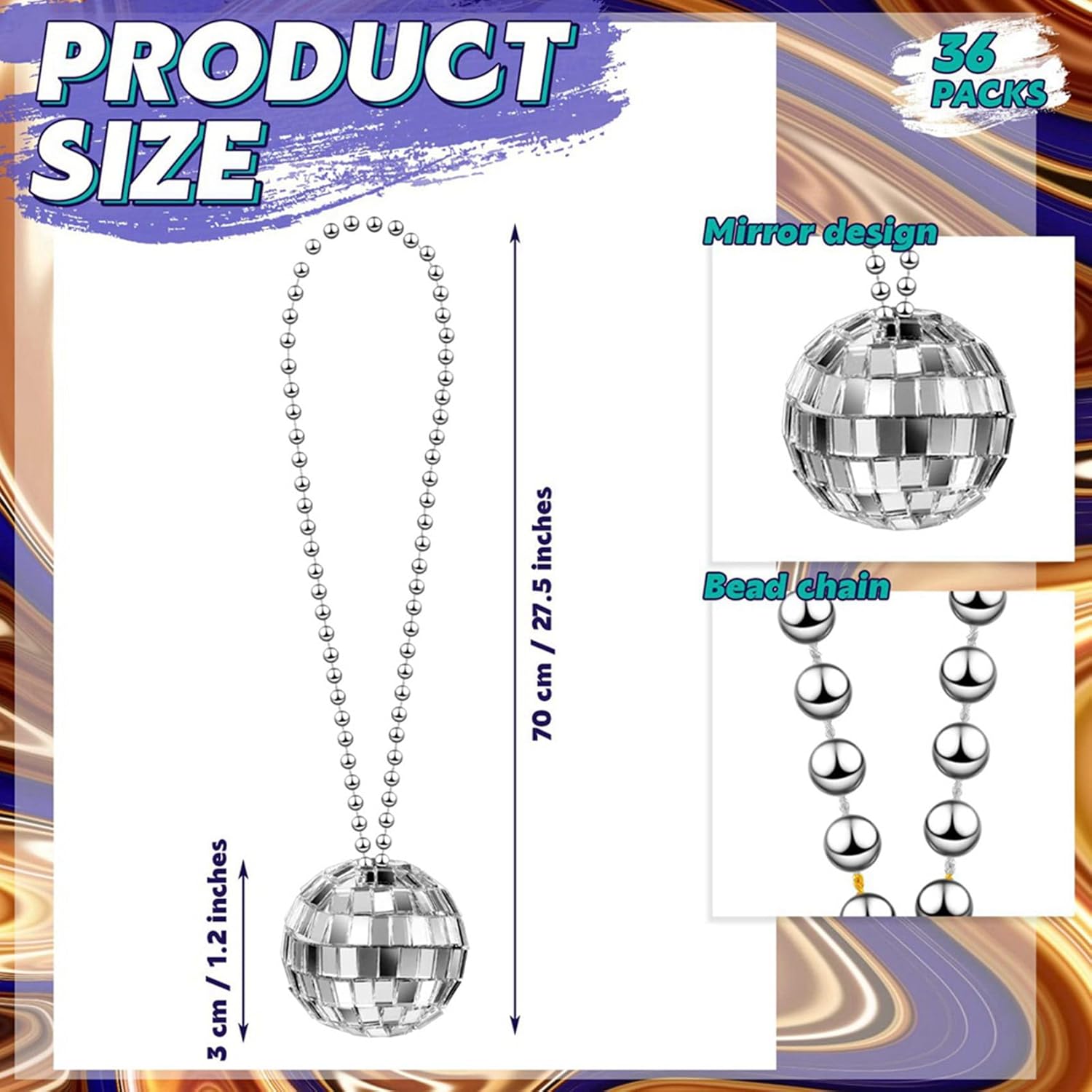 Immergiti nell'atmosfera anni '70 con il set di collane con palline da discoteca da 72 pezzi, progettato per aggiungere brillantezza e brio a qualsiasi festa o evento a tema anni '60 o '70. Questi accessori per costumi argentati, riflettenti e di tendenza assumono l'iconica estetica da discoteca e donano al tuo outfit lo scintillio necessario. Questa confezione da 72 collane con sfere da discoteca presenta un'accattivante finitura a specchio e riflette magnificamente la luce, abbagliando la stanza e creando un'eccellente atmosfera da discoteca anni '70. Il diametro di ciascuna sfera da discoteca di 1,18 garantisce il perfetto equilibrio tra impatto visivo e portabilità. Realizzate con cura per gli appassionati del retrò, queste collane con palline da discoteca non sono solo un divertente oggetto per le feste, ma anche emozionanti accessori per spettacoli teatrali che elettrizzeranno le tue esibizioni. Che tu stia partecipando a un evento a tema o pianificando uno spettacolo sul palco, le nostre collane con sfere da discoteca sono all'altezza del compito. Le collane da discoteca non sono solo visivamente sbalorditive, ma anche robuste e comode da indossare. Realizzati con materiali di altissima qualità, forniscono prestazioni di lunga durata garantendo al tempo stesso il comfort di chi li indossa. Preparati a festeggiare per tutto il tempo senza doverti preoccupare dell'usura. Le nostre collane con sfere da discoteca non sono solo accessori per costumi, ma grazie al loro aspetto unico sono ideali anche come regalo. L'estetica trendy e di ispirazione retrò, unita alla qualità premium e alla durata, lo rendono un regalo elegante e piacevole che apprezzeranno sia i tuoi cari che i tuoi cari.