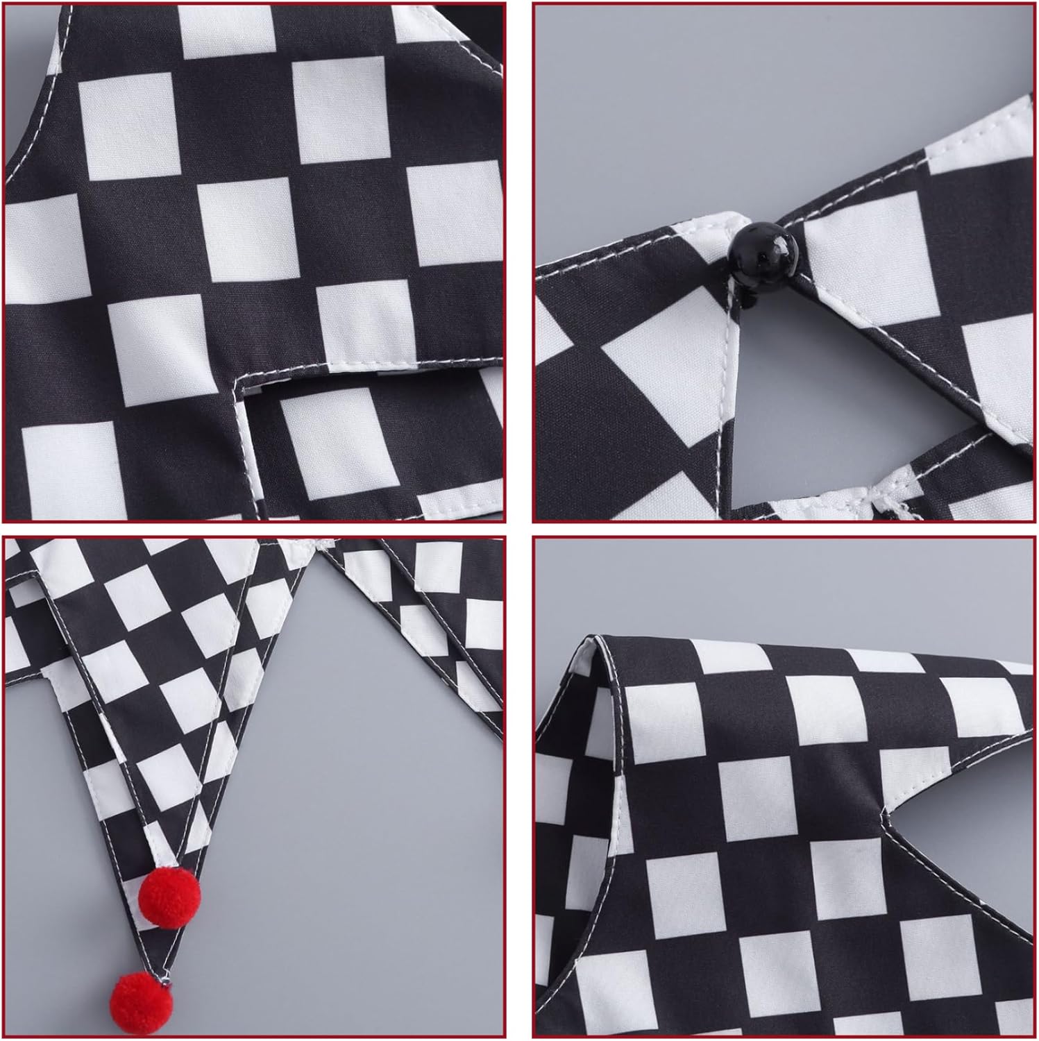 Accessorio versatile: abbina perfettamente a colletti da clown, cappelli da giullare e polsini per completare il tuo outfit da giullare per feste in maschera e spettacoli teatrali Artigianato stabile: cuciture e tessuto di qualità garantiscono un uso duraturo in molteplici eventi e stagioni Vestibilità comoda: realizzata con materiali leggeri e traspiranti, garantisce comfort per tutto il giorno durante Halloween, cosplay o feste in maschera Design accattivante: l'audace design a scacchiera migliora la visibilità e aggiunge fascino giocoso a qualsiasi costume, facendoti risaltare tra la folla Stile vintage: abbraccia l'estetica classica del giullare di corte con un elegante motivo a scacchiera che aggiunge autenticità al tuo costume