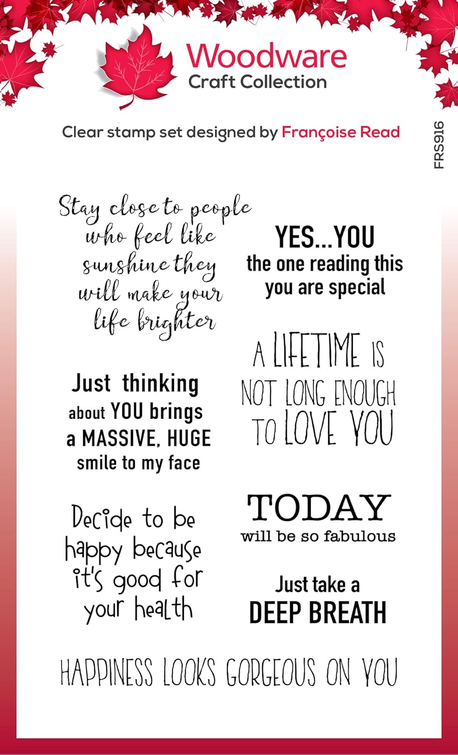 Progettato da Francoise Leggi parole felici per biglietti, diari e altro Set di 8 timbri Pronti per essere montati su un blocco acrilico Progettato e realizzato nel Regno Unito
