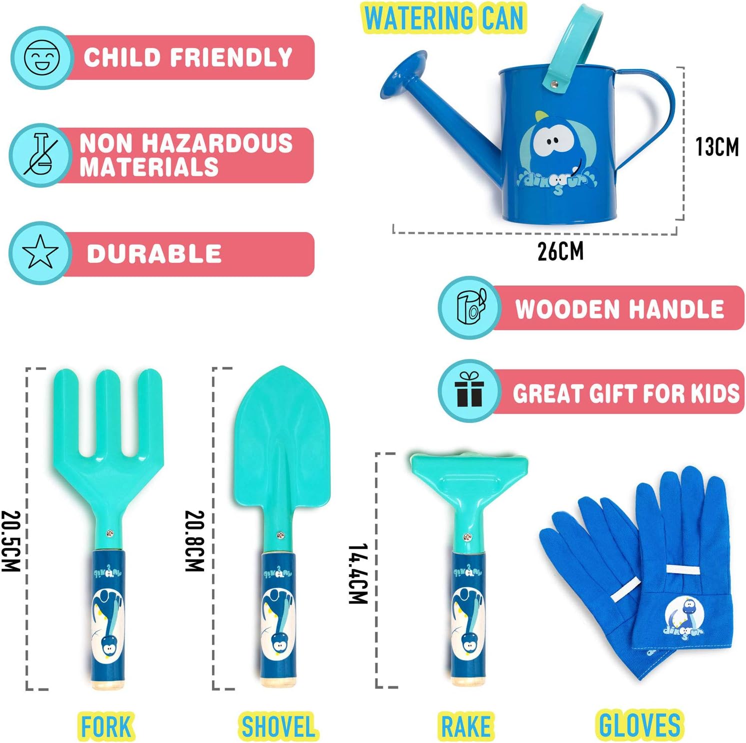 Sicurezza: la sicurezza è la cosa più importante. Ecco perché realizziamo questo set da giardino per bambini con materiali innocui, migliori e durevoli. I bordi degli attrezzi da giardino per bambini sono arrotondati e privi di sbavature per ferire i bambini. Appositamente progettati per i nostri giardinieri di rifiuti: tutti gli attrezzi da giardino per bambini sono a misura di bambino, perfetti per le mani dei bambini piccoli. Le maniglie sono lisce. Le teste sono in vero metallo, sono molto stabili e fanno divertire i bambini. Altro che semplice giardinaggio! Porta questo set di attrezzi da giardino per bambini in spiaggia, gioca nella sabbia, prepara dolci e costruisci castelli di sabbia. Imparare giocando: i bambini adorano esplorare la natura. Fango, semi, germogli, insetti e fiori fanno tutti parte dell'apprendimento quando possono giocare con te. Amano aiutare e imparare. Il tuo bambino adorerà dare una mano con questi simpatici attrezzi da giardinaggio per bambini, perfetti per le mani dei più piccoli. OTTIMO REGALO DA GIARDINO PER BAMBINI - Se stai cercando un regalo per bambini, non cercare oltre questo set da giardino per bambini. Viene fornito in una confezione regalo. Regali di giardinaggio perfetti per bambini per Natale, compleanni e come regalo per premi e incoraggiamento. Consigliato: supervisione di un adulto, consigliata dai 3 anni in su. Sosteniamo il nostro set di qualità premium. Qualunque problema incontri, puoi contattarci direttamente, ti aiuteremo a risolverlo.