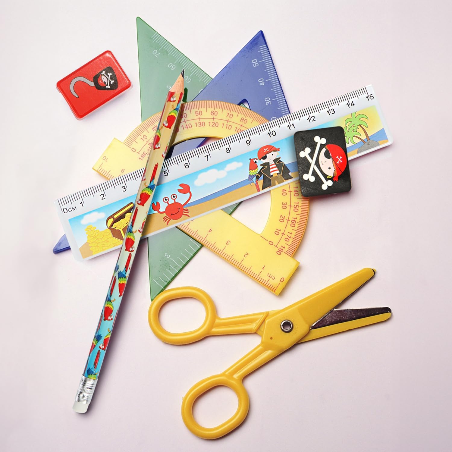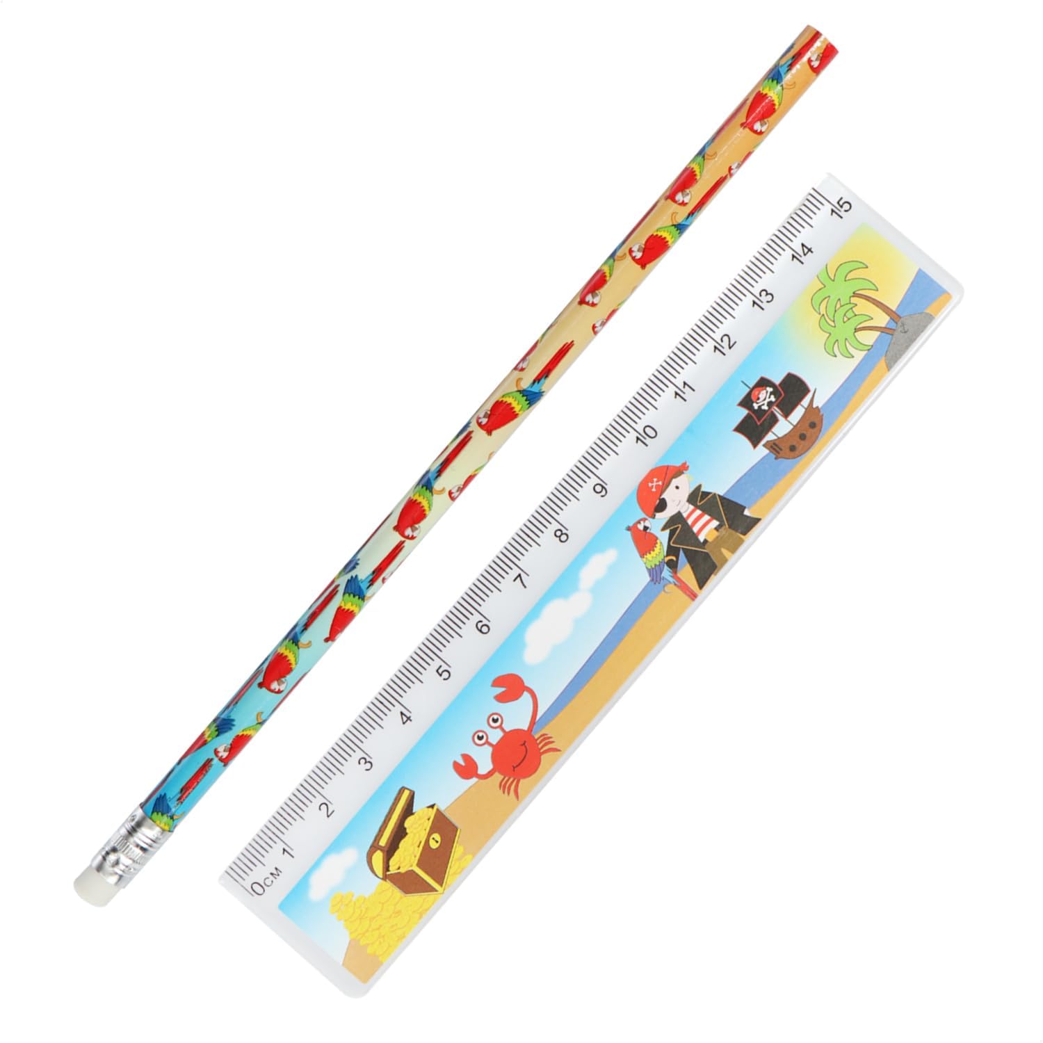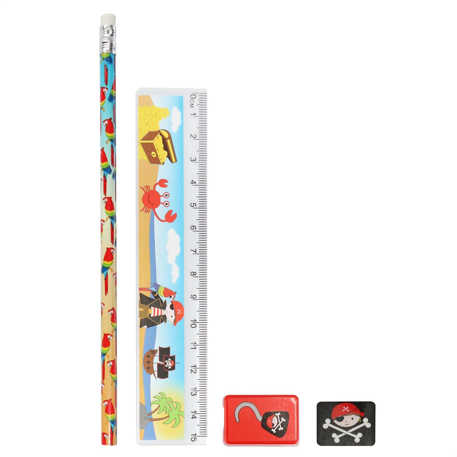INIZIO DELLA SCUOLA: con il suo design vivace, il set da scrittura è il compagno perfetto per l'inizio della scuola e si adatta facilmente a qualsiasi astuccio, astuccio per matite, cartella o zaino! PER PICCOLI PIRATI: Questo fantastico kit di scrittura con matita, righello, gomma e temperino in un fantastico look da pirata è perfetto per i piccoli avventurieri: ideale per la scuola, l'asilo e a casa! DESIGN DI ALTA QUALITÀ E COLORATO: realizzato in legno, plastica e metallo, il set di utensili da scrittura colpisce per la sua qualità duratura e per i motivi di pirati e pappagalli realizzati con cura! UTILIZZO VERSATILE: matite, righelli, temperini e gomme non sono solo perfetti per la scuola materna e la scuola, ma anche ottimi regalini per compleanni e feste a tema per bambini! CONTENUTO DELLA CONSEGNA: 12 matite, 12 righelli (15 cm), 12 temperini, 12 gomme // Materiale: legno, plastica, metallo // Colore: rosso, nero, bianco, multicolore // Motivo: pirata, pappagallo, granchio, forziere del tesoro