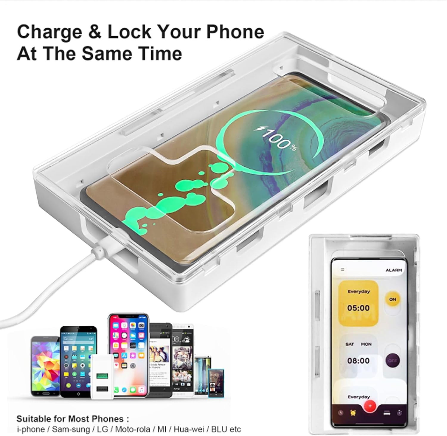 Controlla la dipendenza dal telefono: il telefono è completamente bloccato dalla cassaforte del telefono e non puoi aprirlo senza la chiave corrispondente, quindi non giocherai con il telefono per molto tempo. Non perdere cose importanti: realizzato in materiale ABS trasparente, il design trasparente ti consente di verificare le informazioni del tuo telefono in qualsiasi momento mentre lavori o studi, senza perdere importanza. Con un foro per il cavo di ricarica: il foro per il cavo di ricarica nella parte inferiore della custodia del telefono consente di caricare il telefono dopo averlo bloccato. C'è molto spazio all'interno della custodia del telefono per raffreddare il telefono durante la ricarica. Materiale di sicurezza: progettiamo la cassaforte del telefono con materiale ABS di alta qualità. La scatola ad alta resistenza non è facile da rompere, con un uso prolungato, non è necessario sostituirla. Compatibile con la maggior parte dei telefoni cellulari: le dimensioni della custodia di sicurezza del nostro telefono cellulare sono 19 x 10,5 x 2,5 cm (7,5 x 4,1 x 1 pollici), che può essere adatto per la maggior parte dei telefoni cellulari sul mercato.