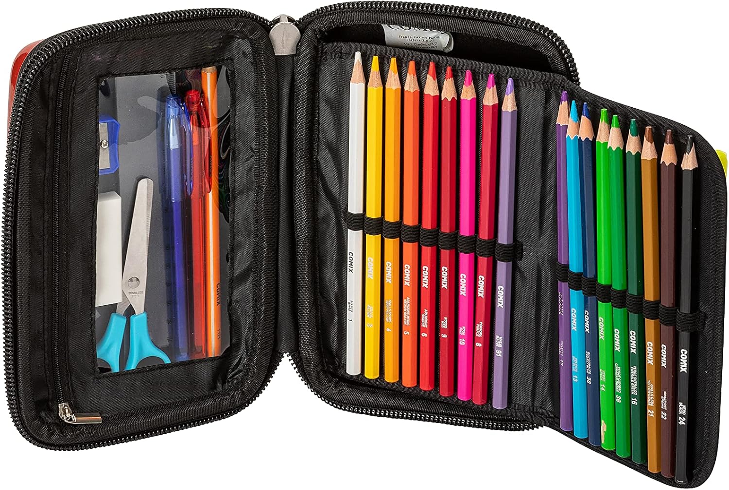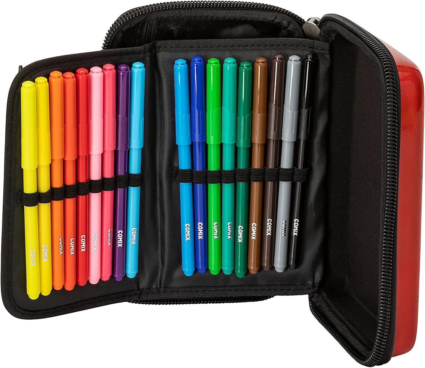 Chiusura principale con maxi zip. Con guscio rigido. Contiene: penna blu Comix, 18 matite colorate Comix, 18 pennarelli colorati Comix, matita Comix, gomma, righello, temperino, forbici. Tasca interna con chiusura zip e passanti elastici per organizzare al meglio il materiale scolastico.
