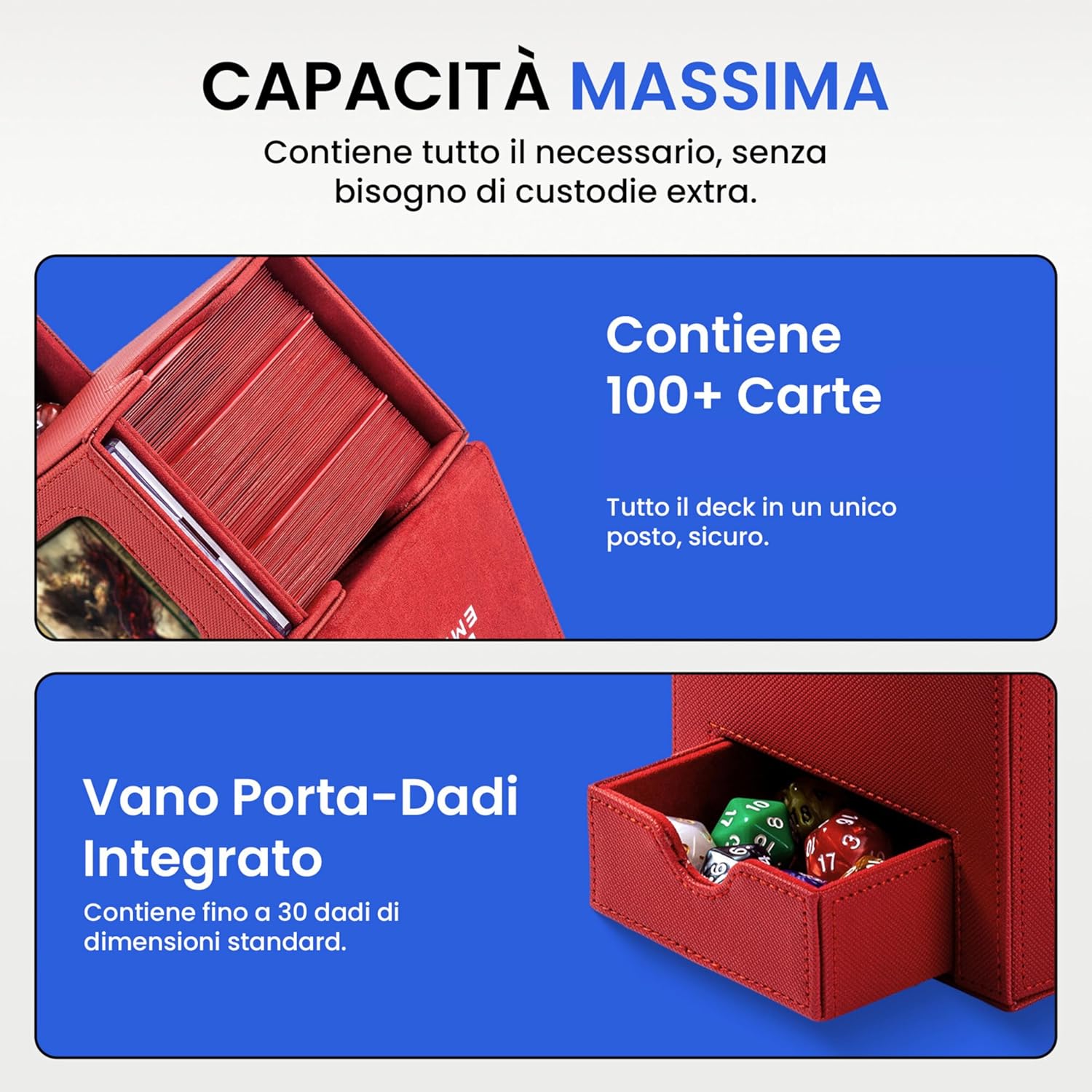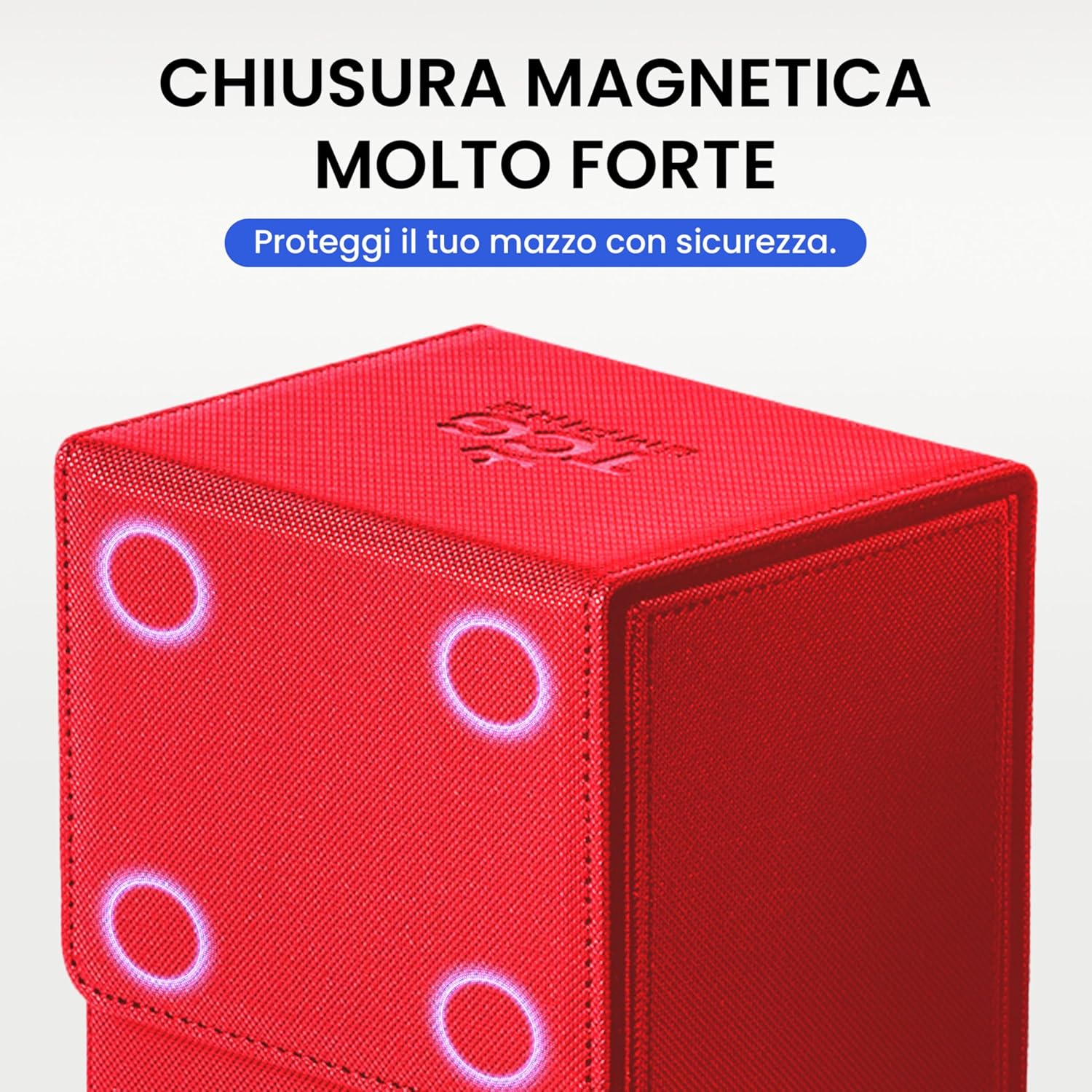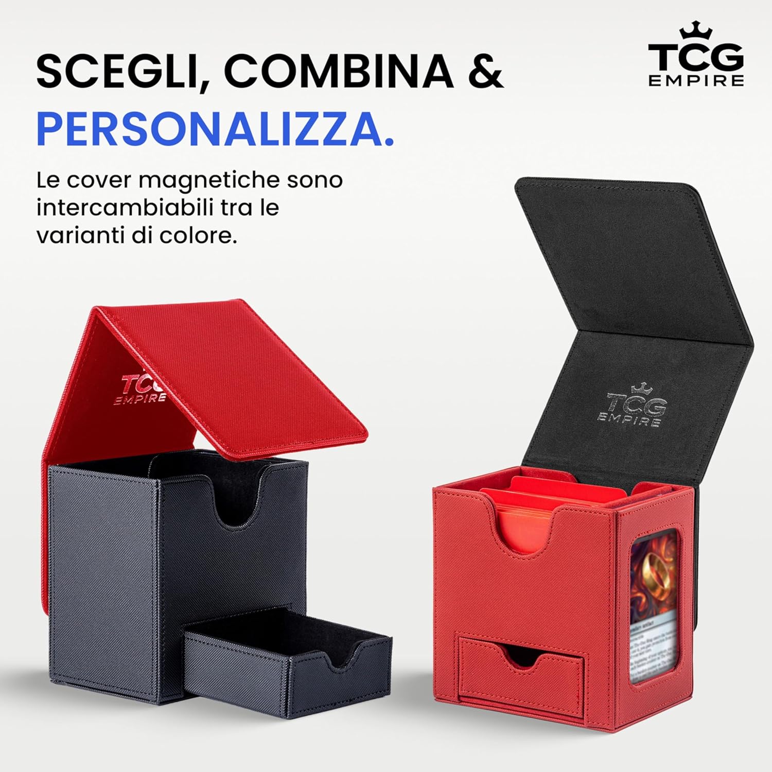 MOSTRA IL TUO STILE IN PARTITA Non è un semplice porta mazzo: è il modo migliore per esporre con orgoglio il tuo Commander o la tua carta preferita grazie alla finestra frontale e alla custodia magnetica inclusa. Gioca con eleganza e distinguiti fin dal primo turno. COVER STACCABILE = MASSIMA COMODITÀ IN PARTITA La cover magnetica removibile rende il tuo commander deck box ancora più pratico: risparmia spazio sul tavolo, tieni tutto a portata di mano e personalizza i colori scambiando le cover tra più porta porta deck. AMPIA CAPACITÀ Capace di contenere fino a 100 carte double-sleeve (usando inner sleeve) o 120 single-sleeve, con vassoio integrato per dadi e segnalini. Porta con te il necessario senza accessori extra. QUALITÀ PREMIUM E ROBUSTEZZA GARANTITA Realizzato con materiali di pregio, interno in microfibra e magneti ultra-resistenti, offre protezione e durata superiore. Niente cuciture deboli o chiusure scadenti: il tuo mazzo sarà sempre al sicuro in un deck box premium. UN BOX, TANTI GIOCHI Compatibile con tutti i TCG più amati: MTG, PKM, YGO e molti altri. Un unico box versatile, pronto a seguirti in ogni partita.