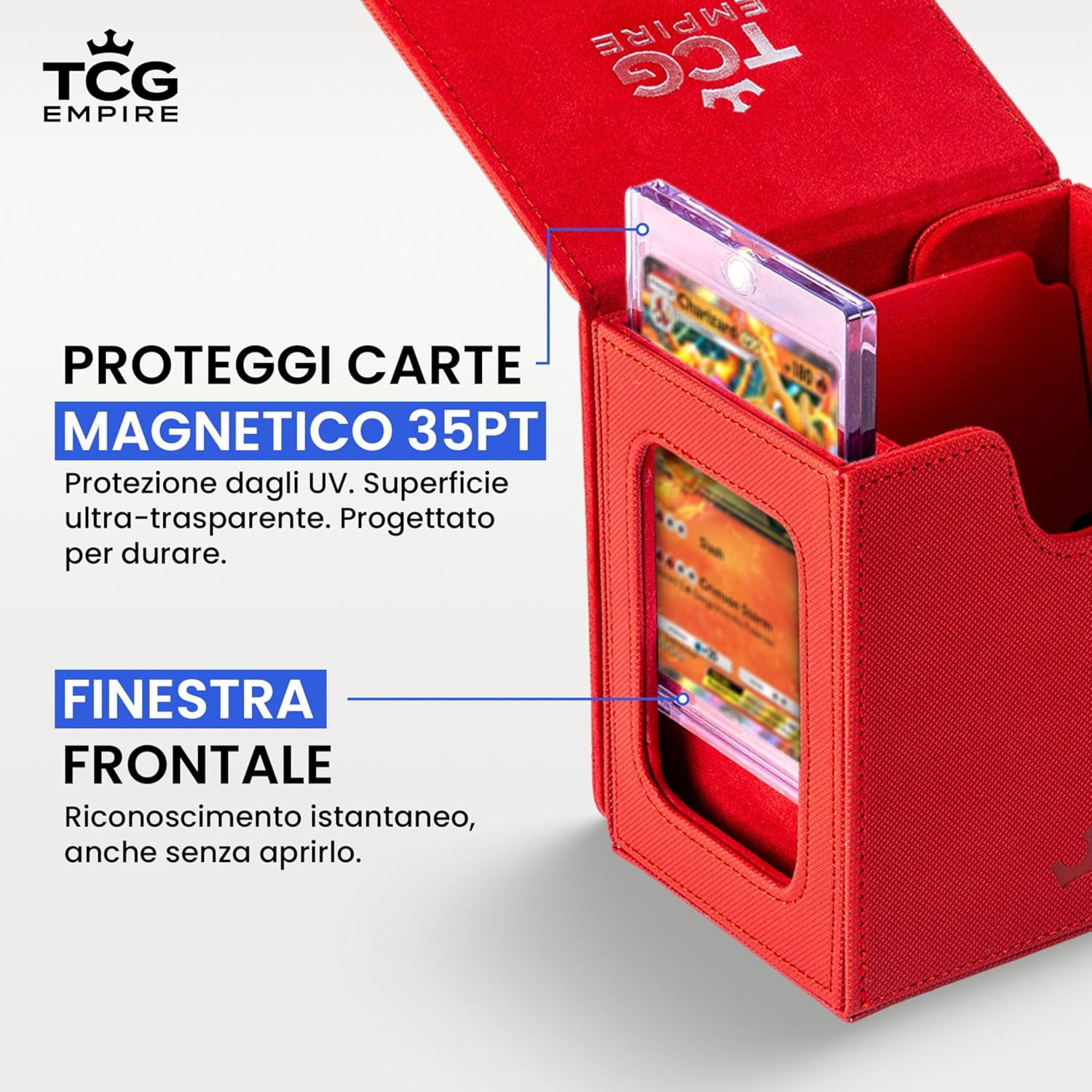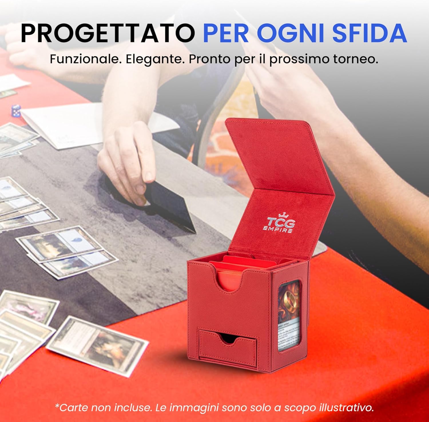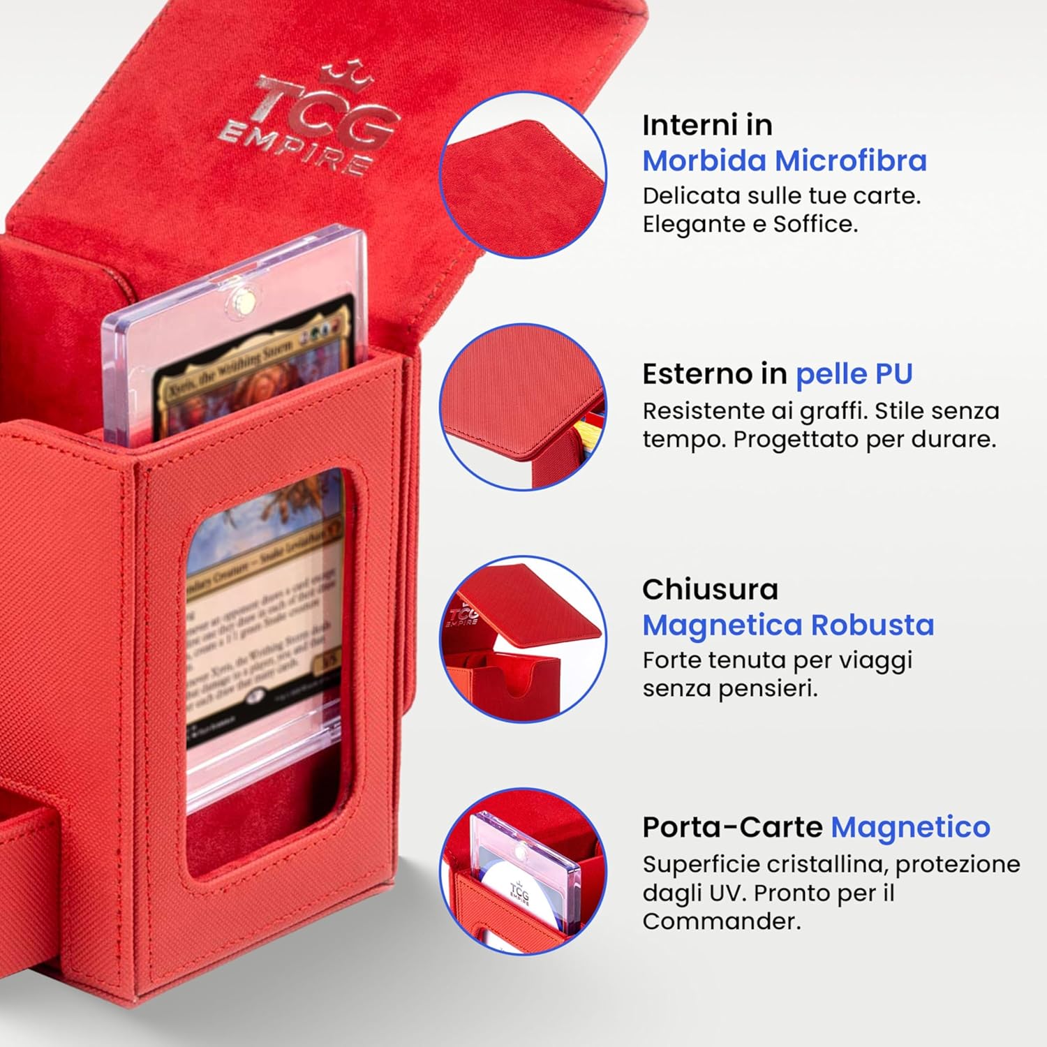 MOSTRA IL TUO STILE IN PARTITA Non è un semplice porta mazzo: è il modo migliore per esporre con orgoglio il tuo Commander o la tua carta preferita grazie alla finestra frontale e alla custodia magnetica inclusa. Gioca con eleganza e distinguiti fin dal primo turno. COVER STACCABILE = MASSIMA COMODITÀ IN PARTITA La cover magnetica removibile rende il tuo commander deck box ancora più pratico: risparmia spazio sul tavolo, tieni tutto a portata di mano e personalizza i colori scambiando le cover tra più porta porta deck. AMPIA CAPACITÀ Capace di contenere fino a 100 carte double-sleeve (usando inner sleeve) o 120 single-sleeve, con vassoio integrato per dadi e segnalini. Porta con te il necessario senza accessori extra. QUALITÀ PREMIUM E ROBUSTEZZA GARANTITA Realizzato con materiali di pregio, interno in microfibra e magneti ultra-resistenti, offre protezione e durata superiore. Niente cuciture deboli o chiusure scadenti: il tuo mazzo sarà sempre al sicuro in un deck box premium. UN BOX, TANTI GIOCHI Compatibile con tutti i TCG più amati: MTG, PKM, YGO e molti altri. Un unico box versatile, pronto a seguirti in ogni partita.