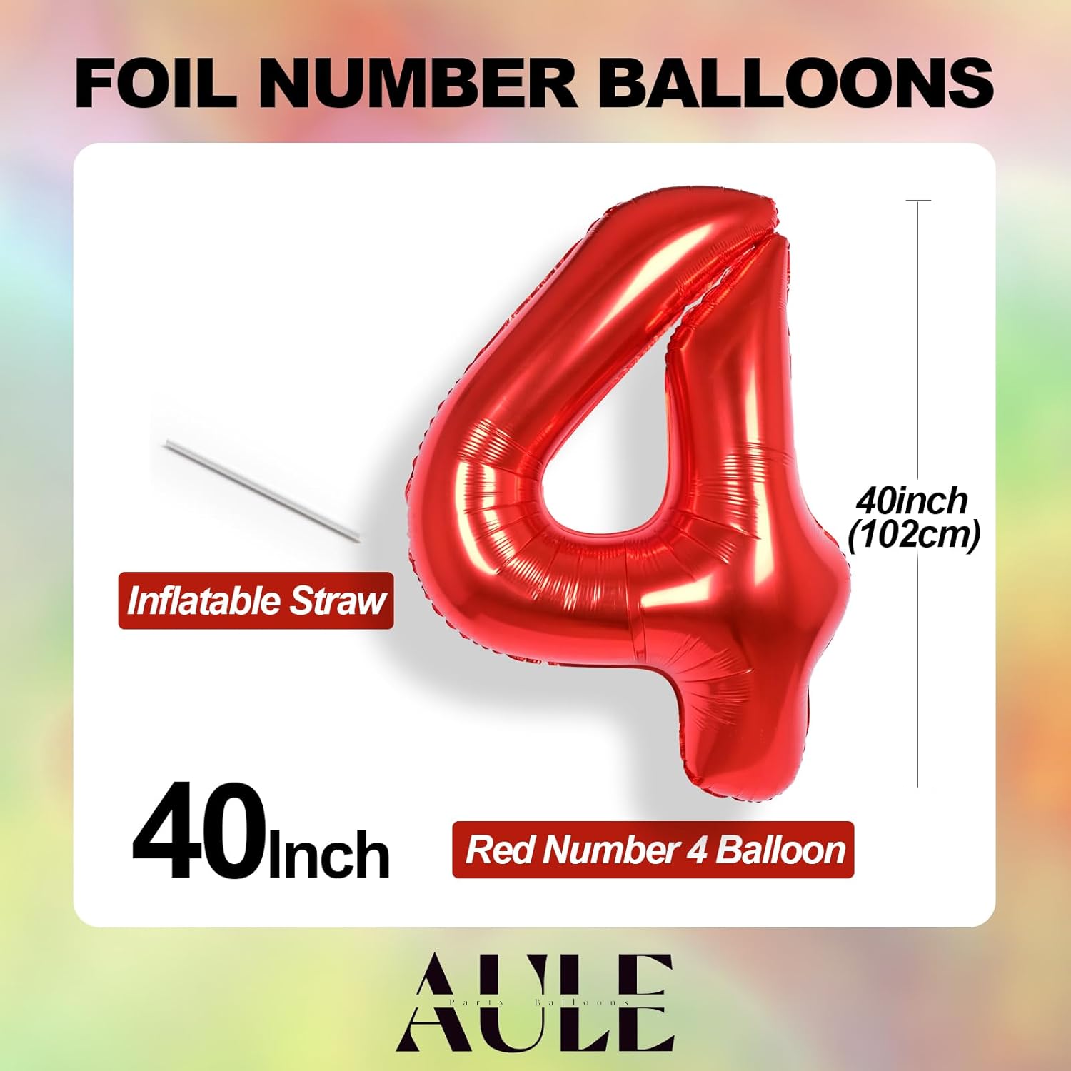 DIMENSIONI GRANDI - Ogni confezione contiene 1 palloncino con numeri rossi da 40 pollici con numeri 4 e 1 cannuccia, questi palloncini con numeri di colore classico renderanno la tua festa più sorprendente e unica MATERIALE PREMIUM - I nostri palloncini rossi con numero 4 sono realizzati in un foglio di alluminio di alta qualità, lucido, resistente e durevole, non facile da rompere e senza rischi di perdite FACILE DA USARE - Questo palloncino rosso con numero 4 è dotato di colla autosigillante all'interno del foro di gonfiaggio, prima di gonfiare, puoi utilizzare la cannuccia fornita per aprire il foro, si sigillano completamente pizzicando dopo il gonfiaggio AMPIA GAMMA DI APPLICAZIONI - Questi palloncini in foil rosso sono vivaci e perfetti per compleanni di ragazzi e ragazze, baby shower, matrimoni, anniversari e altre decorazioni per feste, puoi scegliere o combinare i numeri 0-9 per diverse occasioni SERVIZIO POST-VENDITA - Ci impegniamo a fornire il miglior servizio, se riscontri problemi durante l'uso, ti preghiamo di contattarci via e-mail, faremo del nostro meglio per risolvere il tuo problema