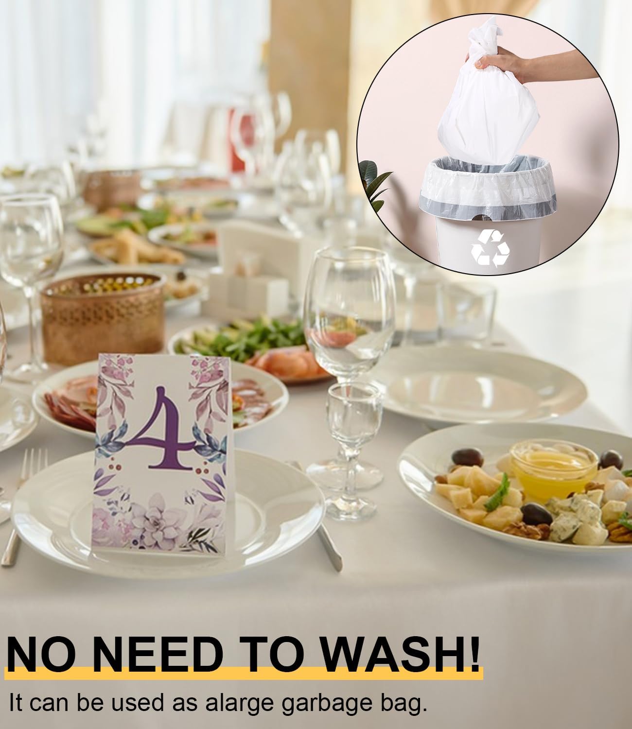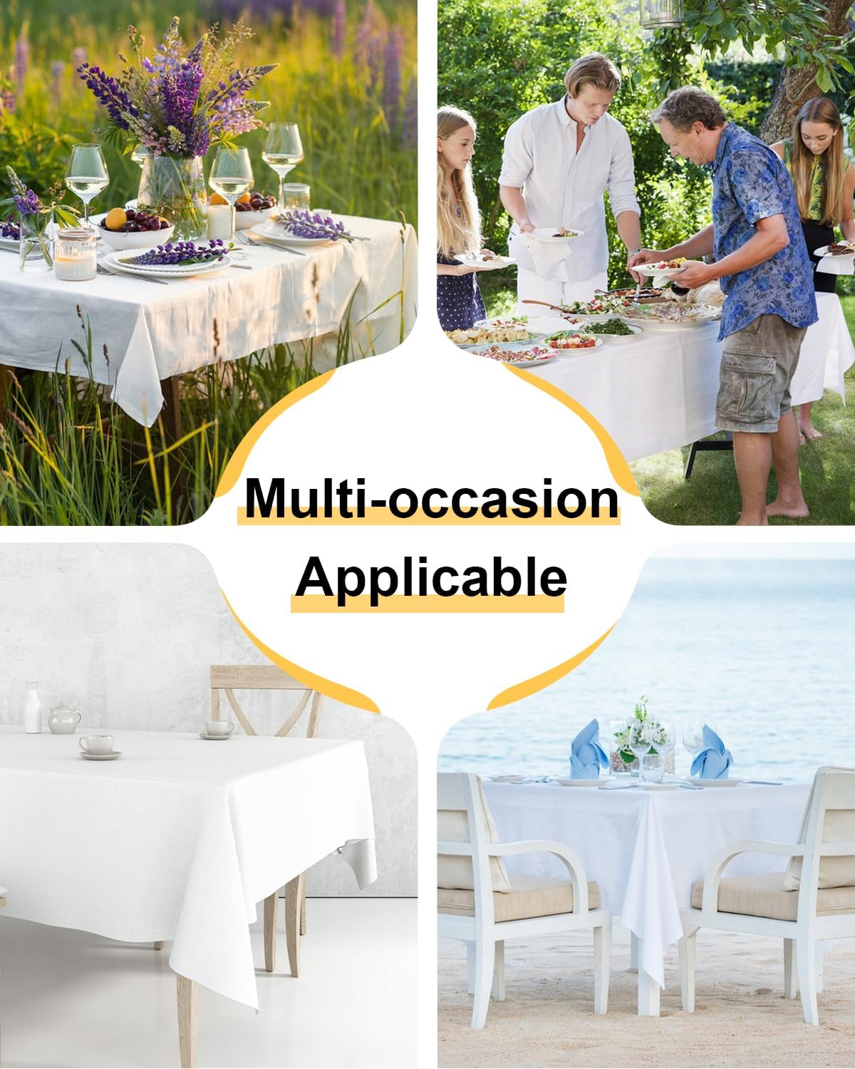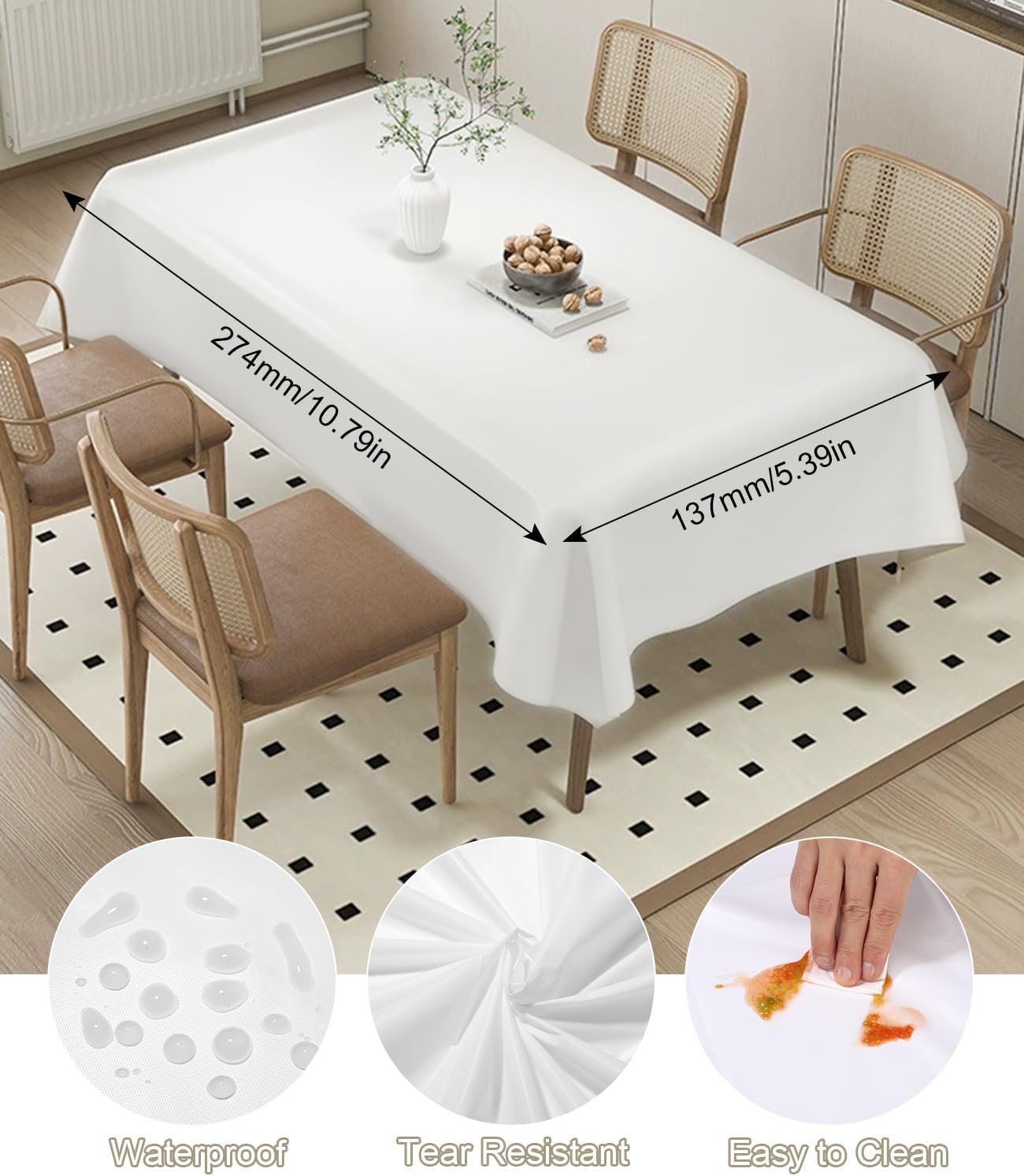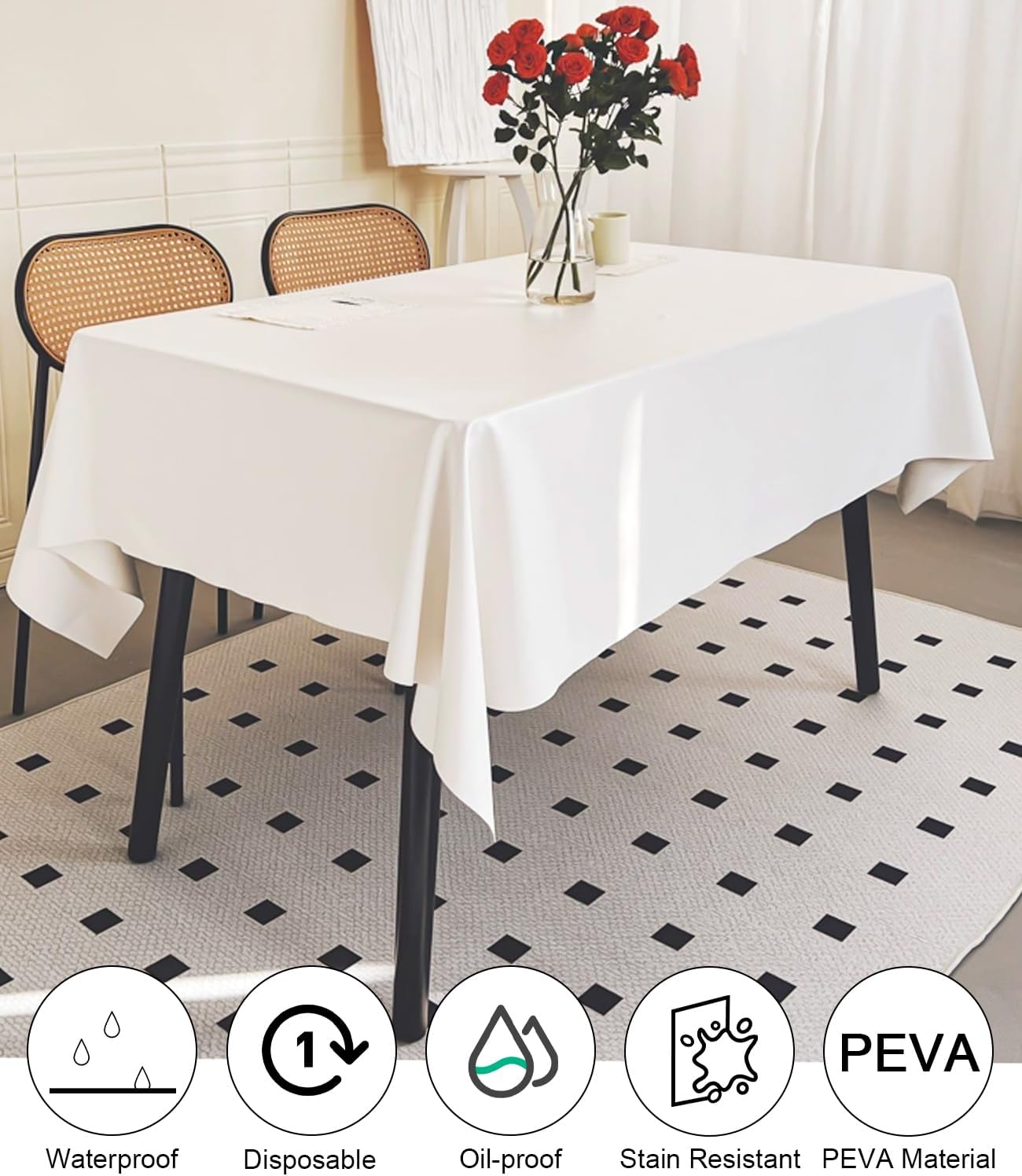 Tovaglie in PEVA ispessite: migliora la tua esperienza culinaria con la nostra confezione da 6 tovaglie in PEVA bianche che misurano 54" x 108". Queste tovaglie sono perfette per tavoli lunghi fino a 8 piedi, impermeabili e infrangibili, così puoi goderti la festa senza preoccupazioni. PULIZIA FACILE: goditi la tua festa senza doverti preoccupare della pulizia! Una volta terminato l'evento, arrotola semplicemente la tovaglia e gettala via come un grande sacco della spazzatura, così potrai dedicare più tempo a goderti l'evento e meno tempo a pulire. Resistente e pratico: questo set contiene 6 tovaglie per feste adatte a qualsiasi ambiente domestico. Perfetti per le famiglie con bambini, sono ottimi per tavoli da cucina, tavoli da pranzo, picnic ed eventi all'aperto, fornendo una solida protezione da schizzi e macchie. Leggera e portatile: la tovaglia è molto leggera e facile da trasportare e riporre. La tovaglia rettangolare può essere facilmente piegata in dimensioni compatte, aggiungendo un tocco di eleganza al tuo patio, giardino o area picnic. La tovaglia può mantenere il piano del tavolo pulito e ordinato e proteggerlo da eventuali danni. Ampiamente utilizzata e ad alta copertura: tovaglia per compleanno nel colore bianco più comune, che può coprire efficacemente qualsiasi tavolo mantenendolo pulito e ordinato. Perfetto per varie occasioni come feste, matrimoni, cene del Ringraziamento, barbecue e altri temi di eventi.