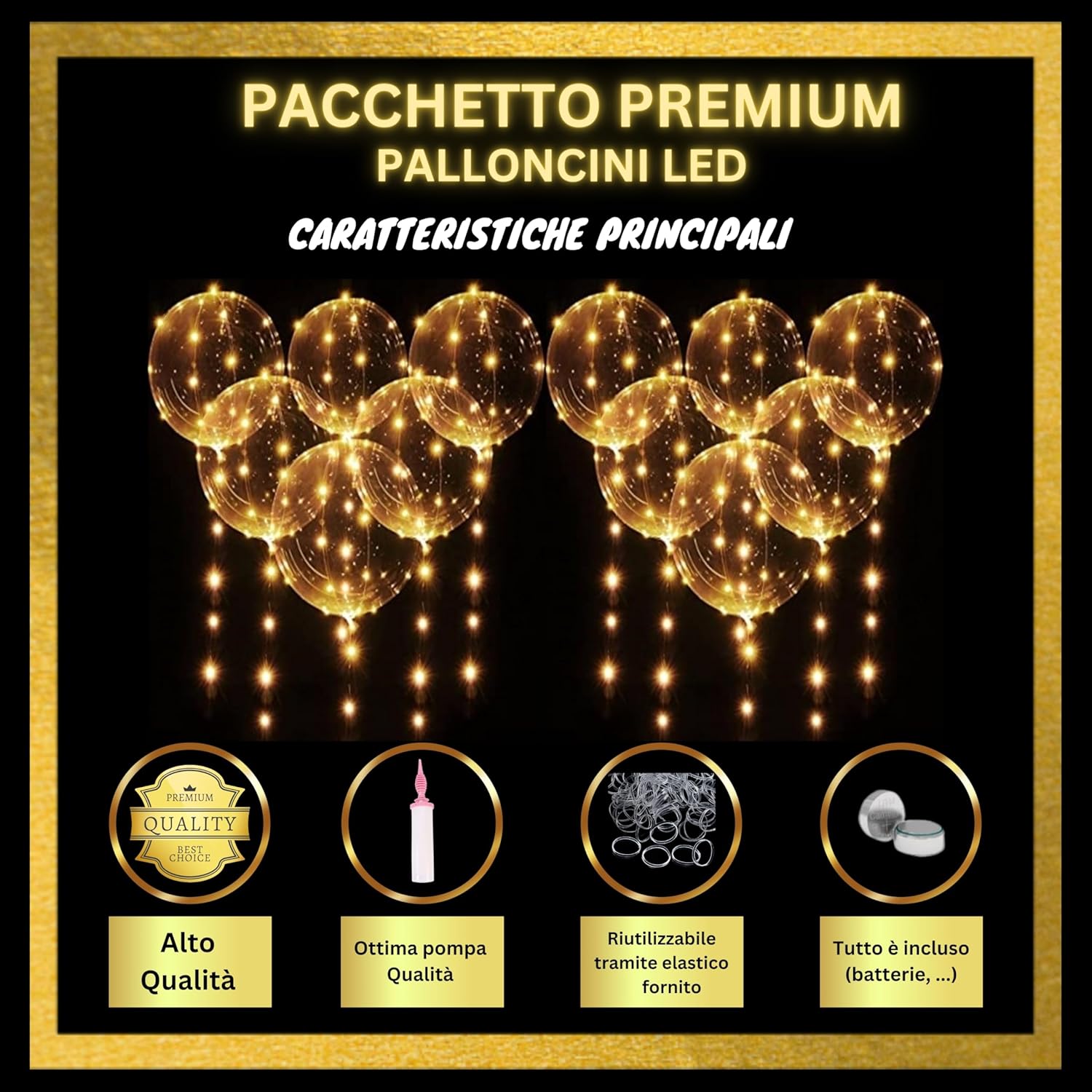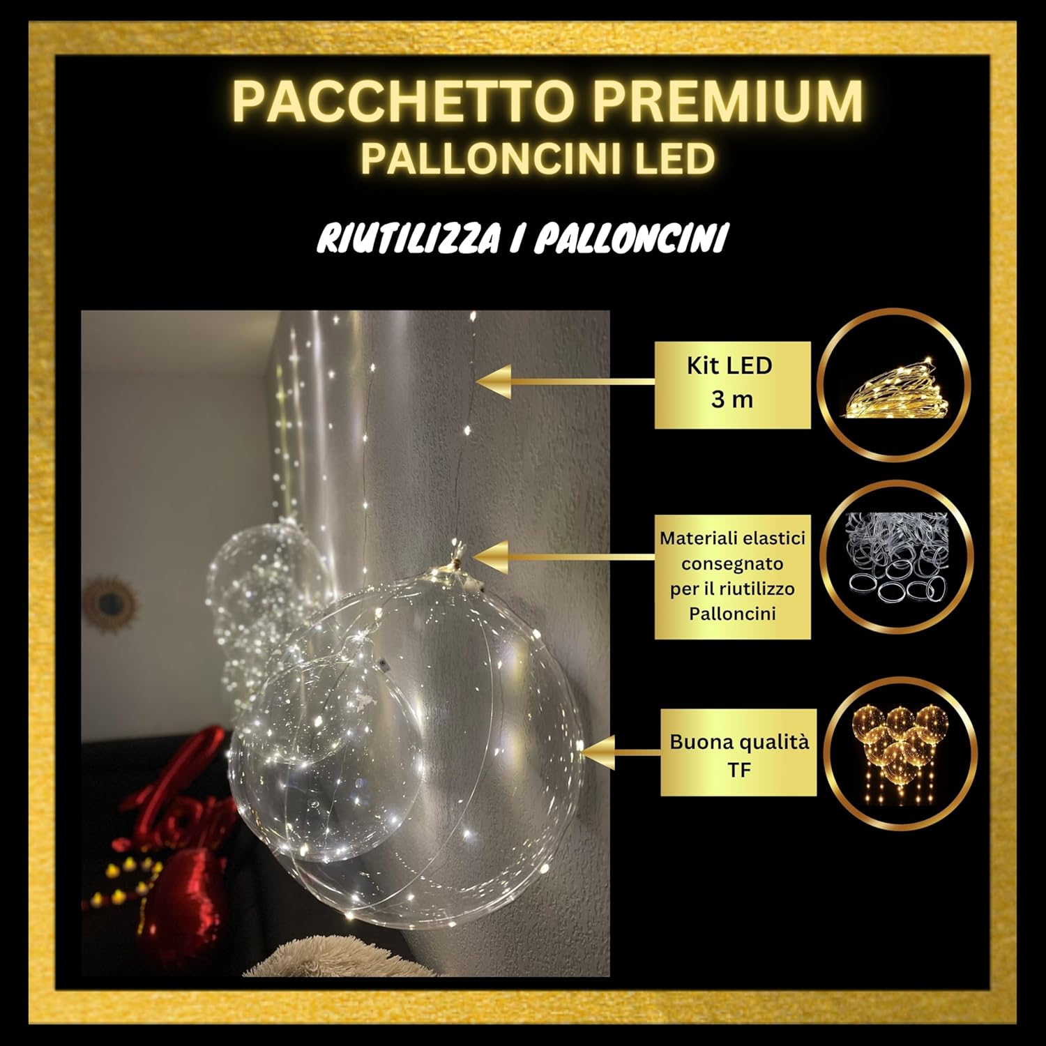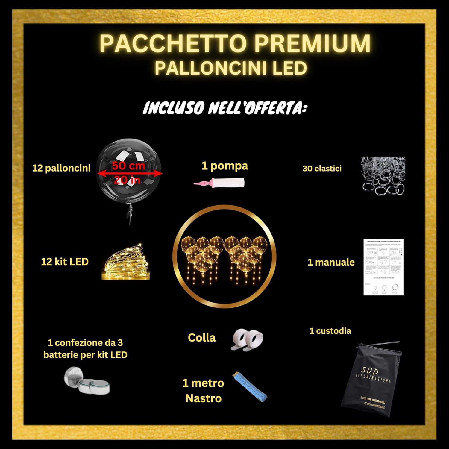 Attenzione: confezione da assemblare: prevedere di essere 1 o 2 persone e 1-2 ore per montare i 12 palloncini LED luminosi più facilmente. Ed è necessario utilizzare le istruzioni o il video di montaggio forniti perché sono necessari diversi passaggi per un risultato soddisfacente 💡 ⏳ Risparmiate tempo nella vostra ricerca di una decorazione perfetta per Natale, San Valentino, una splendida decorazione per matrimonio, un fantastico compleanno, o per creare una ghirlanda luminosa nel vostro negozio. ⏳ Incolpisci i tuoi cari con bellissimi palloncini luminosi di qualità, trasparenti e rotondi con LED molto luminosi di colore Oro! Compatibile con elio per un effetto più bello. 1 Risparmia con questo pacchetto unico di palloncino luminoso a LED totalmente riutilizzabile per altre decorazioni o altri eventi (ogni elemento è riutilizzabile, vedi contenuto della confezione qui sotto) Contenuto della confezione: 12 palloncini trasparenti rotondi da 50 cm riutilizzabili, di qualità TF, elastici per chiudere palloncini, pompa ad aria di alta qualità, 12 kit LED color oro da 3 metri ciascuno (3 modalità: lampeggiamento rapido, lento, fisso), batterie LR44/AG13 incluse, colla bifacciale, nastro metro e borsa di stoccaggio riutilizzabile. د Facile da montare con le istruzioni in dotazione: ogni palloncino trasparente è da gonfiare da soli e i LED sono da fissare su ogni palloncino con i punti di colla inclusi. Molti suggerimenti e idee sono forniti per un'installazione di successo e per realizzare altre decorazioni con lo stesso pacchetto! Contare da 1 a 2 persone per assemblare tutto con facilità. 🌟 ☑ Nessuna sorpresa o nessun elemento mancante con questa offerta unica di palloncini LED luminosi: tutto ciò di cui hai bisogno è incluso in questa confezione. Solo l'elio è da acquistare separatamente se necessario. ☑ Ricordi e foto indimenticabili in particolare sui social network sia con la sua metà per San Valentino, sia con i propri cari realizzando una bella decorazione per la tavola di nozze o per Natale, o per stupire i clienti per la decorazione di una vetrina del negozio