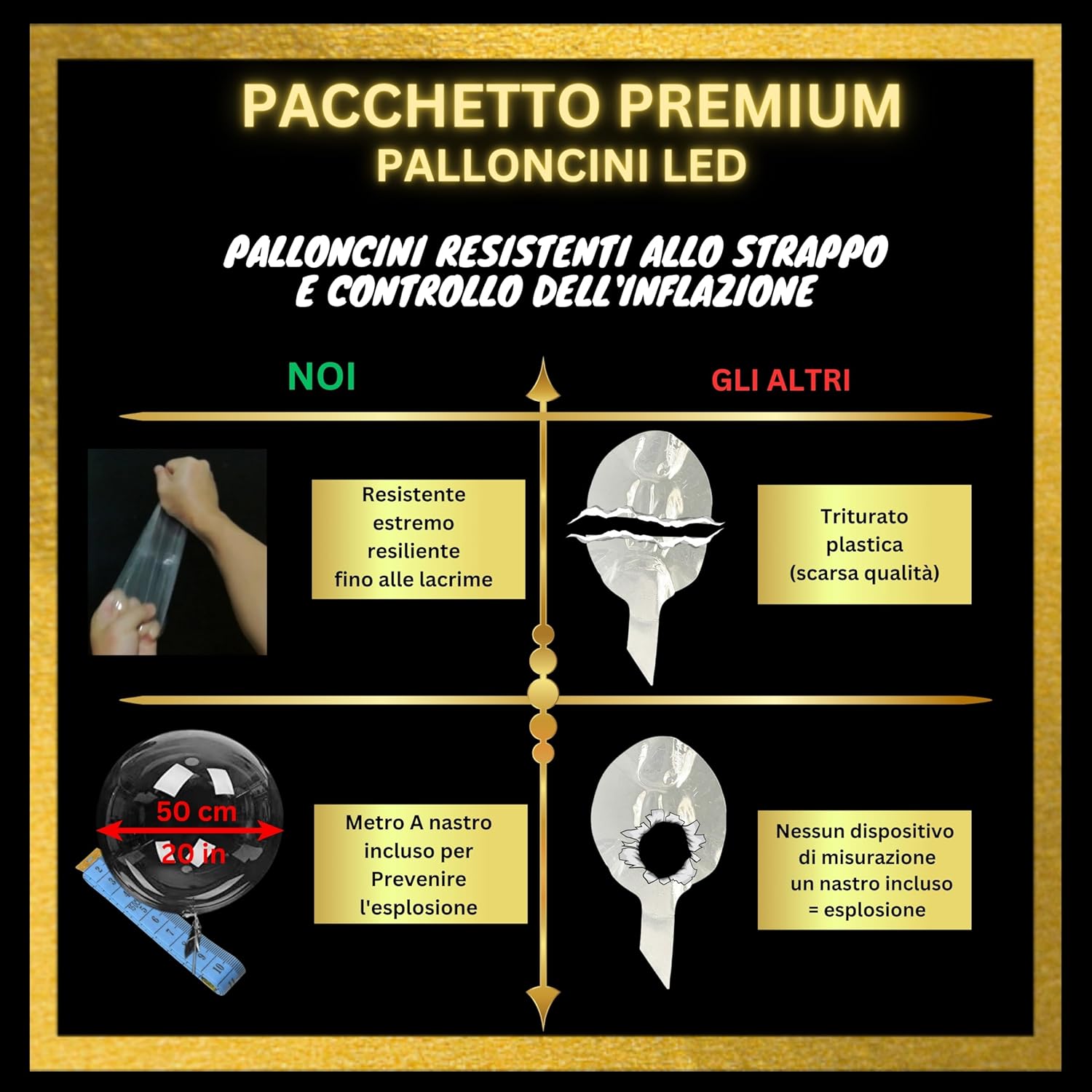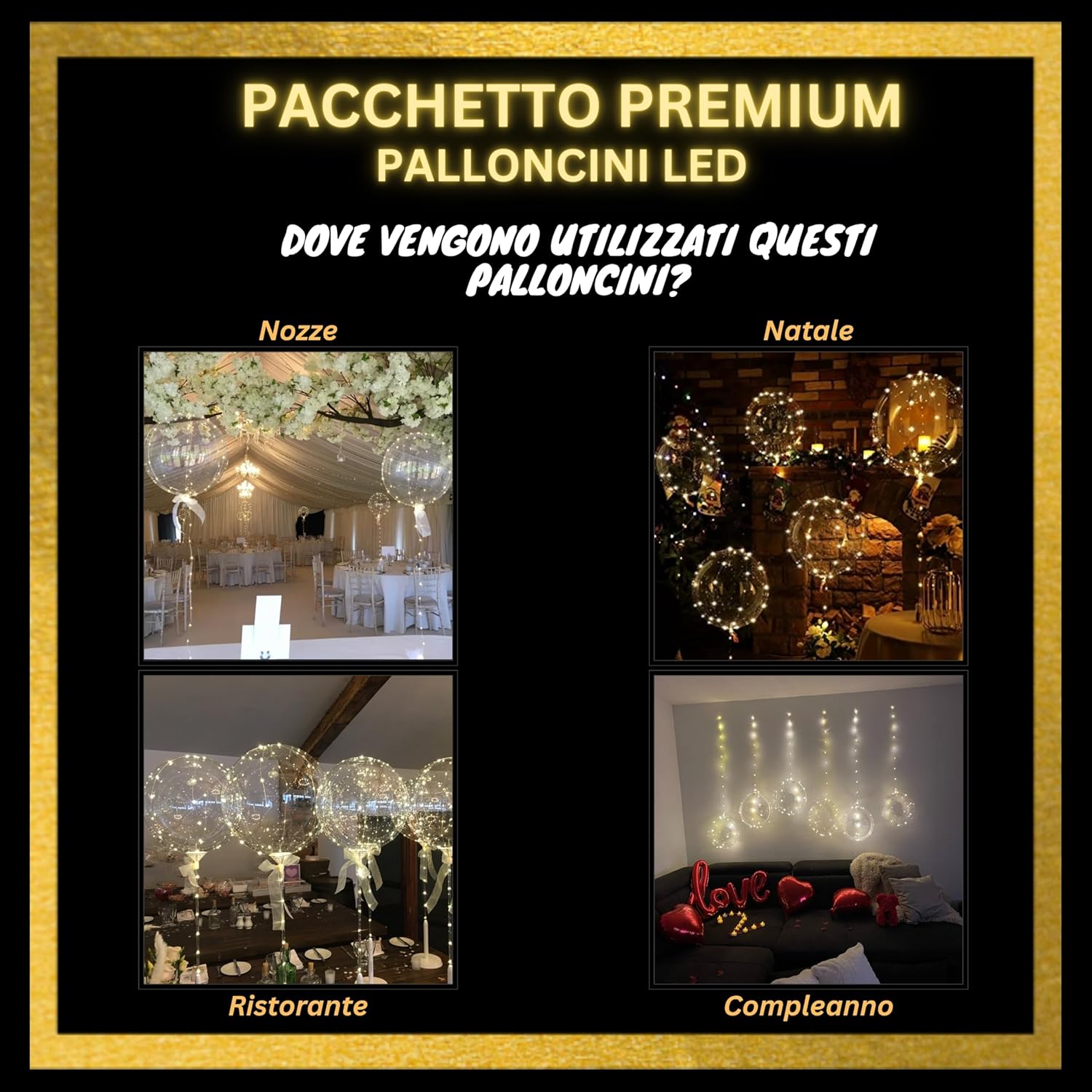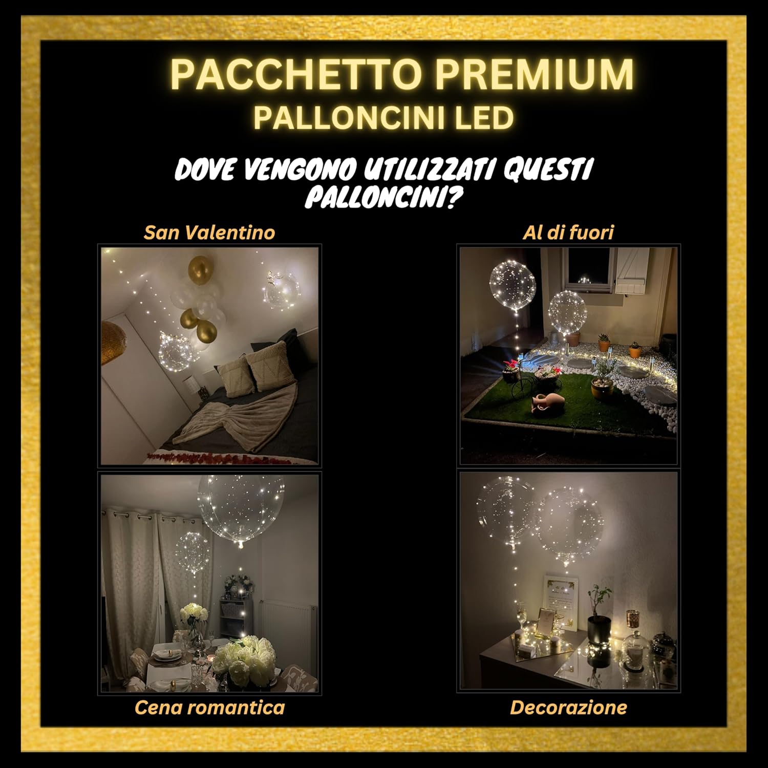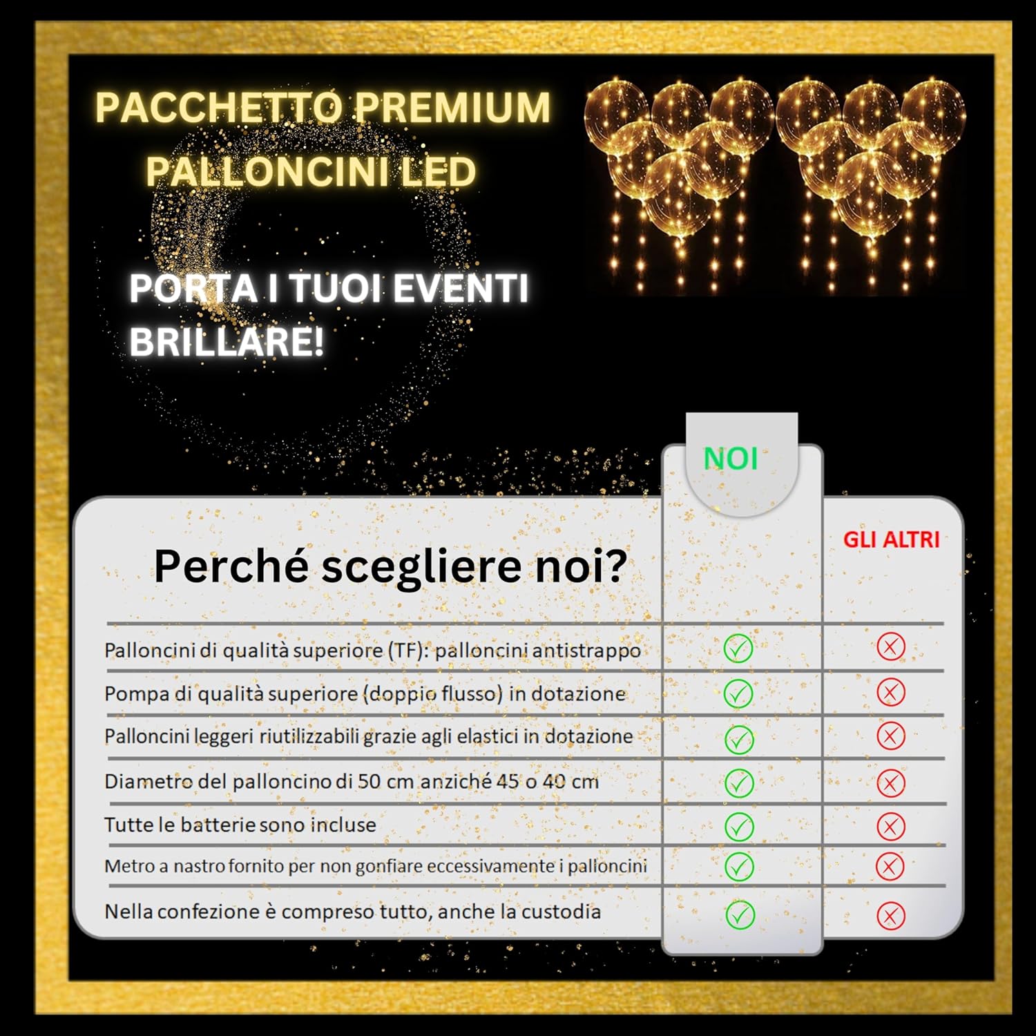 Attenzione: confezione da assemblare: prevedere di essere 1 o 2 persone e 1-2 ore per montare i 12 palloncini LED luminosi più facilmente. Ed è necessario utilizzare le istruzioni o il video di montaggio forniti perché sono necessari diversi passaggi per un risultato soddisfacente 💡 ⏳ Risparmiate tempo nella vostra ricerca di una decorazione perfetta per Natale, San Valentino, una splendida decorazione per matrimonio, un fantastico compleanno, o per creare una ghirlanda luminosa nel vostro negozio. ⏳ Incolpisci i tuoi cari con bellissimi palloncini luminosi di qualità, trasparenti e rotondi con LED molto luminosi di colore Oro! Compatibile con elio per un effetto più bello. 1 Risparmia con questo pacchetto unico di palloncino luminoso a LED totalmente riutilizzabile per altre decorazioni o altri eventi (ogni elemento è riutilizzabile, vedi contenuto della confezione qui sotto) Contenuto della confezione: 12 palloncini trasparenti rotondi da 50 cm riutilizzabili, di qualità TF, elastici per chiudere palloncini, pompa ad aria di alta qualità, 12 kit LED color oro da 3 metri ciascuno (3 modalità: lampeggiamento rapido, lento, fisso), batterie LR44/AG13 incluse, colla bifacciale, nastro metro e borsa di stoccaggio riutilizzabile. د Facile da montare con le istruzioni in dotazione: ogni palloncino trasparente è da gonfiare da soli e i LED sono da fissare su ogni palloncino con i punti di colla inclusi. Molti suggerimenti e idee sono forniti per un'installazione di successo e per realizzare altre decorazioni con lo stesso pacchetto! Contare da 1 a 2 persone per assemblare tutto con facilità. 🌟 ☑ Nessuna sorpresa o nessun elemento mancante con questa offerta unica di palloncini LED luminosi: tutto ciò di cui hai bisogno è incluso in questa confezione. Solo l'elio è da acquistare separatamente se necessario. ☑ Ricordi e foto indimenticabili in particolare sui social network sia con la sua metà per San Valentino, sia con i propri cari realizzando una bella decorazione per la tavola di nozze o per Natale, o per stupire i clienti per la decorazione di una vetrina del negozio