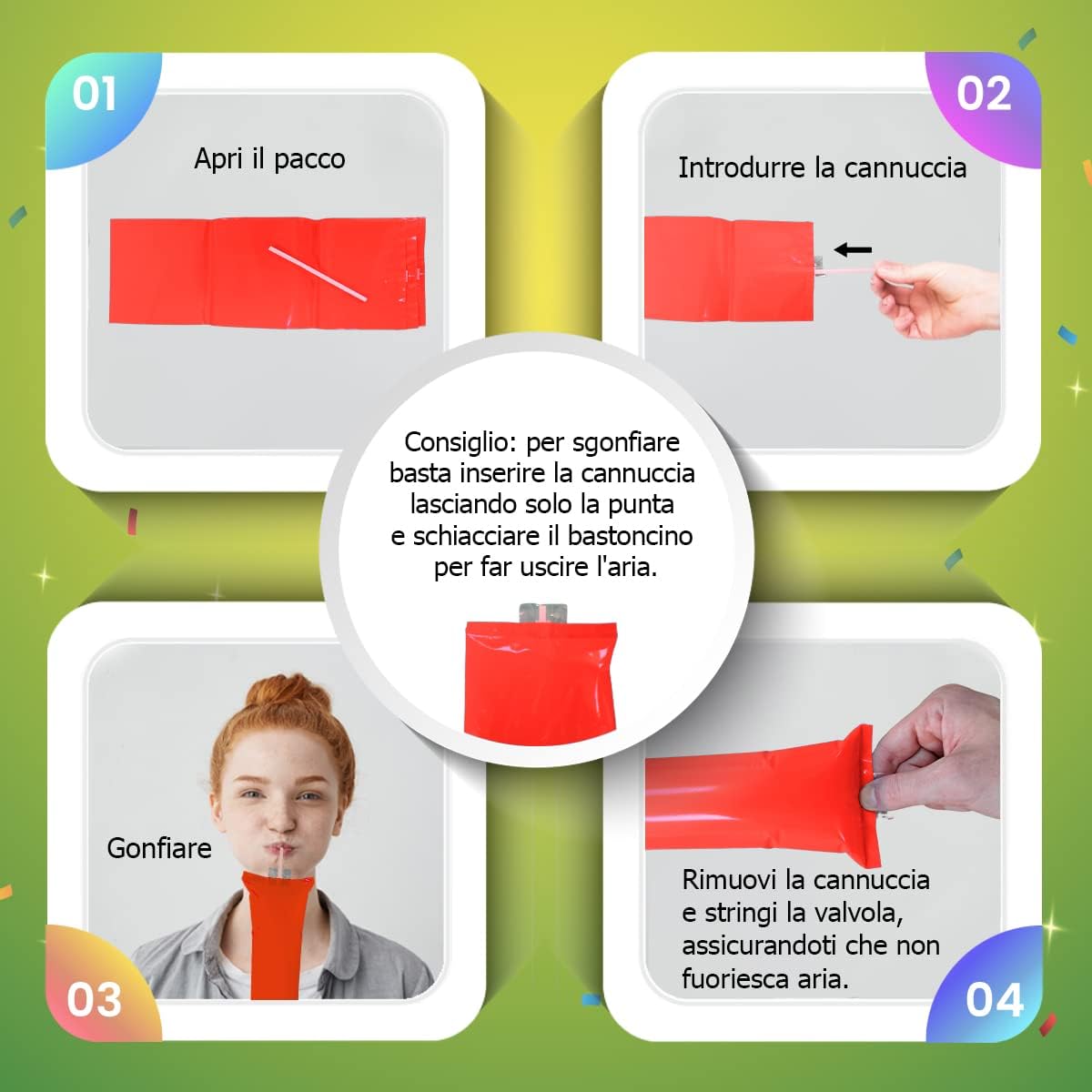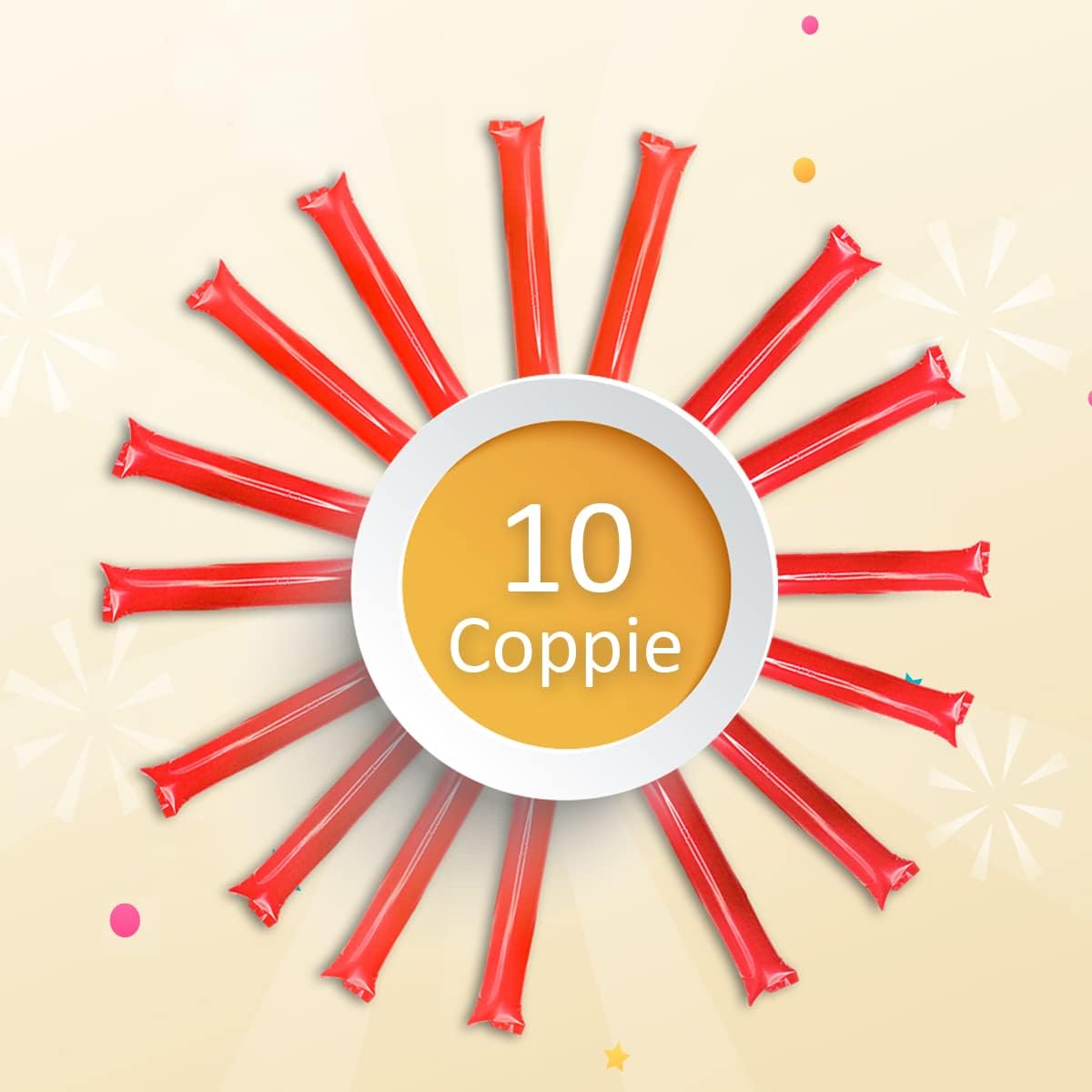 💥 PACK DA 10 UNITÀ: MASSIMO IMPATTO E RUMORE: Ricevi 20 battitori gonfiabili (10 paia) ideali per creare un effetto uditivo e visivo massivo. Questi bastoni rumorosi per l'animazione sono il cotillon essenziale per qualsiasi celebrazione, festa o raduno con grande affluenza di pubblico. ⚽ IL MIGLIOR ACCESSORIO PER L'ANIMAZIONE SPORTIVA: Dai un'atmosfera esplosiva a qualsiasi partita di calcio, competizione, manifestazione o evento. Sono un'alternativa divertente e sicura a vuvuzela e trombette, perfetti per fare il tifo per la tua squadra o il protagonista. ♻️ MATERIALE RIUTILIZZABILE E FACILE DA TRASPORTARE: Realizzati in plastica resistente adatta ad essere riutilizzata innumerevoli volte. Ogni paio include la propria cannuccia per gonfiare e sgonfiare facilmente. Il loro design leggero e piatto permette di trasportarli e conservarli in modo compatto. 🎉 COTI-LLON IDEALE PER OGNI TIPO DI FESTA: Questi accessori da cotillon sono versatili e garantiscono il divertimento in compleanni, addii al celibato/nubilato, comunioni, pinate, matrimoni, Capodanno o concerti. Aggiungi colore, emozione e atmosfera festiva a qualsiasi evento. ✅ DIMENSIONI PERFETTE E RESISTENTI ALL'ACQUA: Con una misura ideale di 10 x 60 cm (larghezza x lunghezza), sono facili da impugnare sia dagli adulti che dai bambini (di età superiore ai 3 anni). Il loro materiale resistente all'acqua assicura che la festa non si fermi, anche in caso di pioggia.