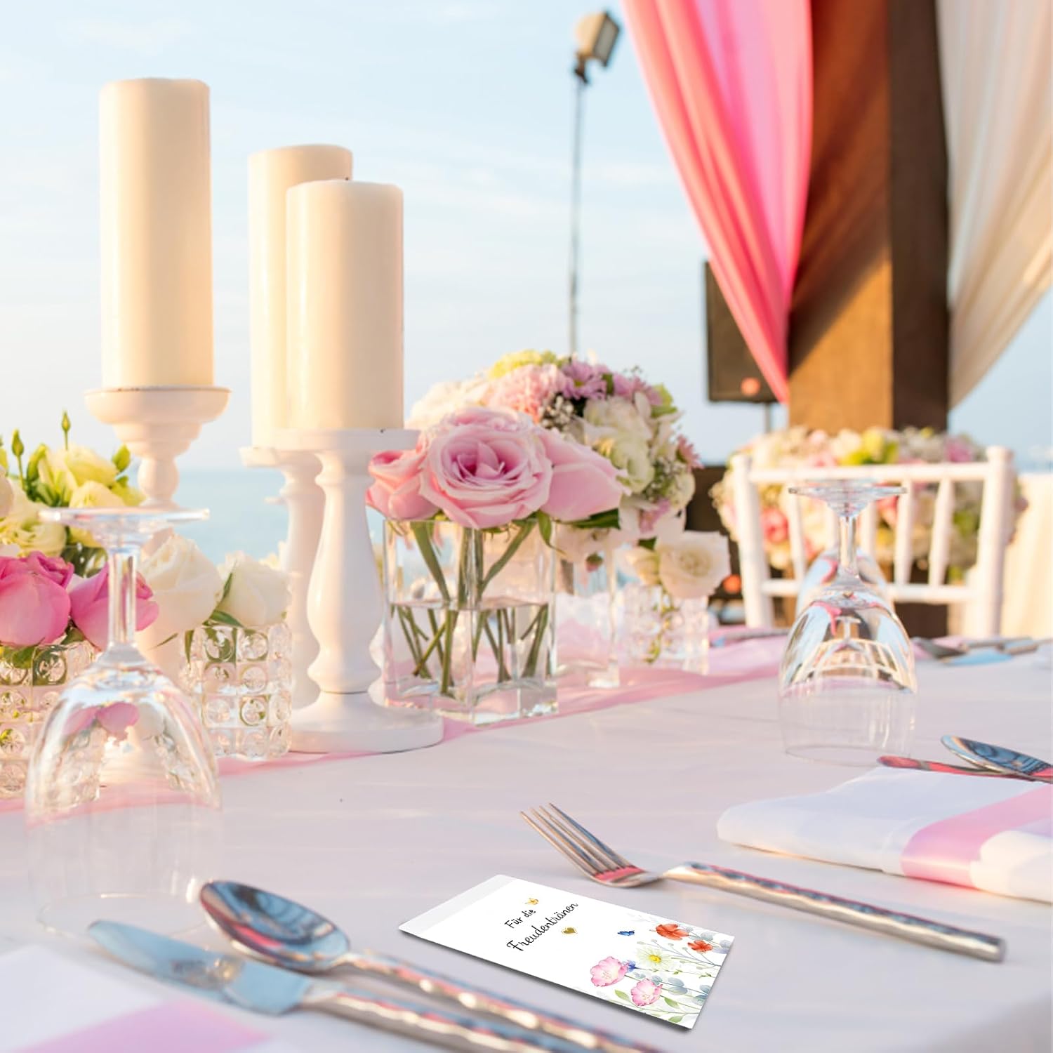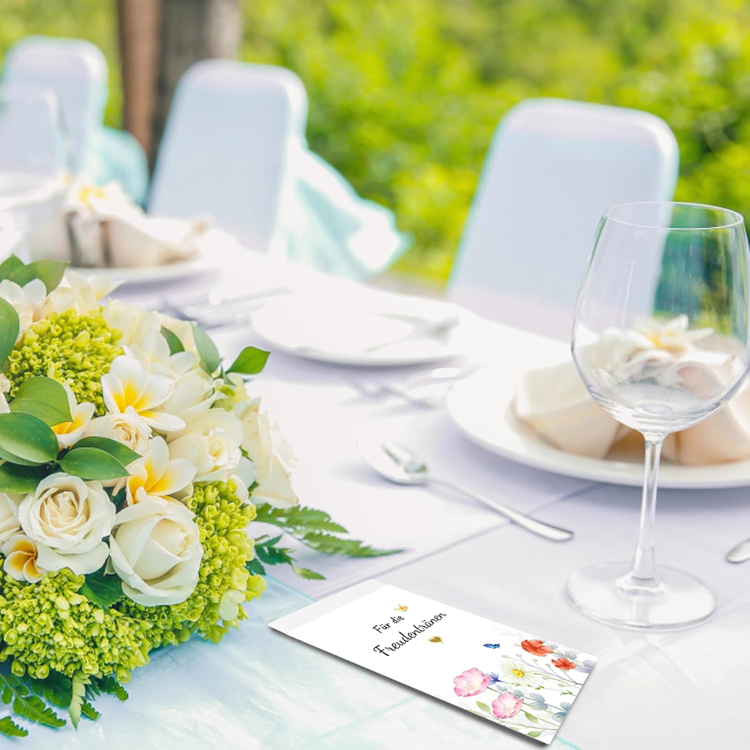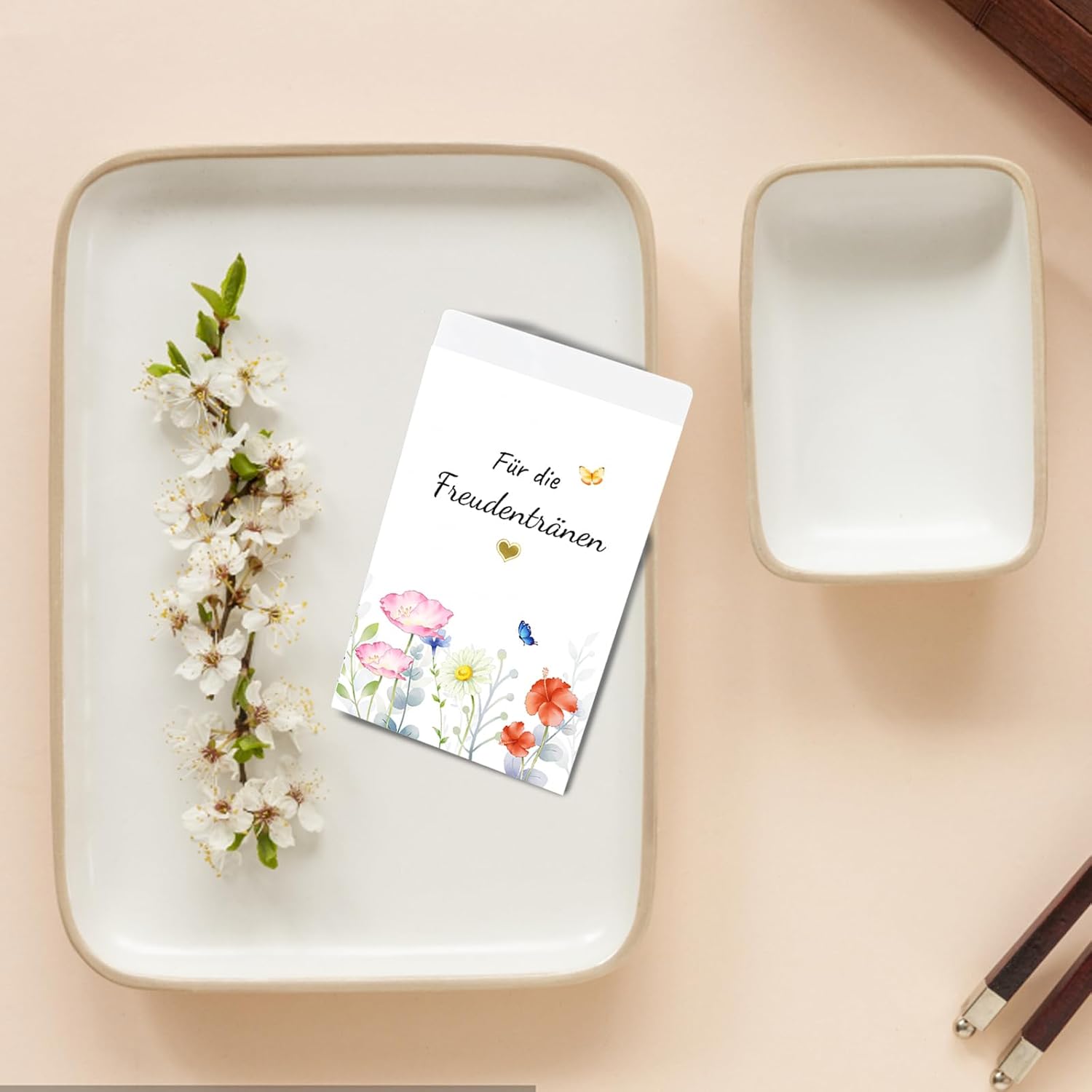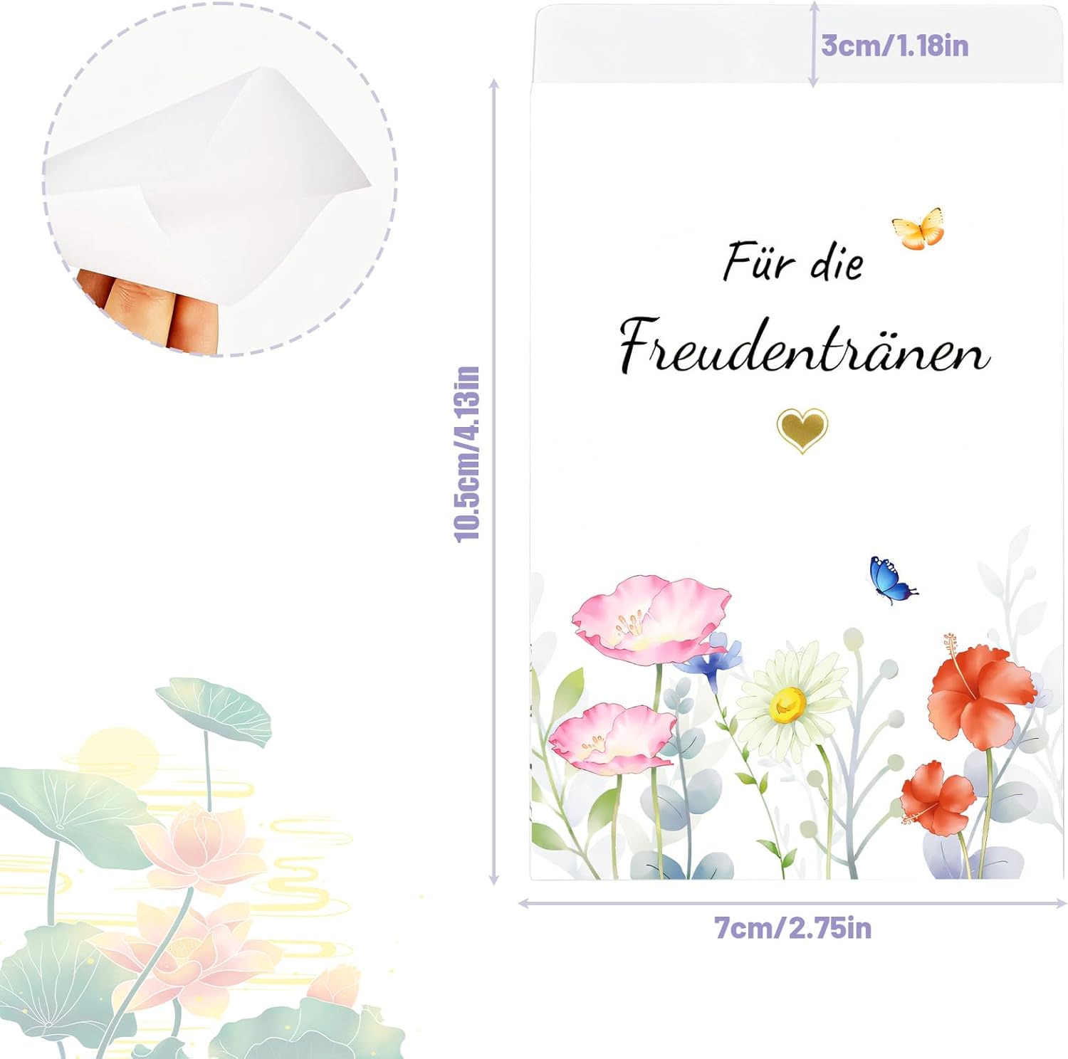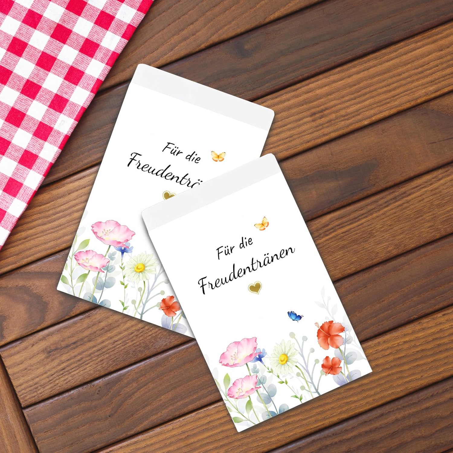 Contenuto della confezione: riceverete 100 squisiti fazzoletti da matrimonio, perfetti per le lacrime di gioia del matrimonio. Materiale premium: i nostri fazzoletti nuziali sono realizzati in carta kraft ecologica di alta qualità. Inodore, liscio e robusto con una stampa chiara: ideale per i matrimoni felici. Misura adatta: con una dimensione di 7 cm x 10,5 cm i nostri fazzoletti sono la dimensione ideale per tutte le occasioni. Un accessorio perfetto per i matrimoni con fazzoletti Ampia gamma di applicazioni: sono ideali come decorazione per tavole nuziali, buste per regali in denaro o confezioni per piccole bomboniere - fazzoletti da sposa perfetti per le lacrime di gioia al matrimonio Design affascinante: i motivi floreali stampati con cura conferiscono ai nostri fazzoletti da matrimonio un aspetto magico e aumentano l'atmosfera romantica ad ogni matrimonio per le lacrime di gioia