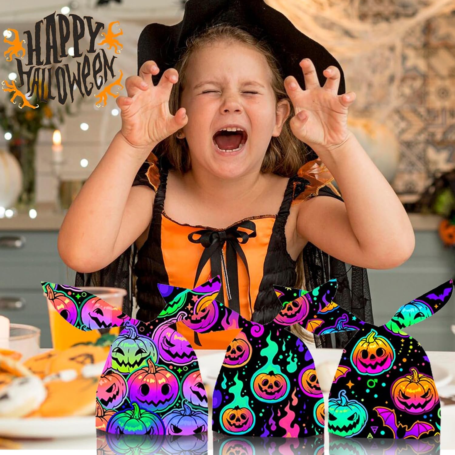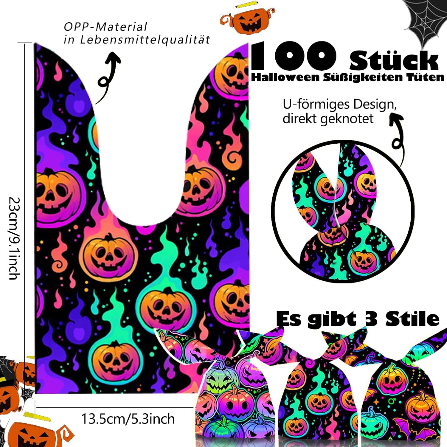Simpatico design a orecchie di coniglio: i sacchetti di caramelle hanno un simpatico design a orecchie di coniglio sulla parte superiore, motivo trasparente. Non solo è carino, è anche molto pratico. Può essere facilmente legato direttamente con un nodo per stringere il sacchetto regalo. È facile da trasportare e sarà al centro dell'attenzione in qualsiasi festa di Halloween o dolcetto o scherzetto. Materiale di alta qualità: questa borsa di Halloween è realizzata in materiale di polipropilene orientato (OPP) di alta qualità, che è durevole, robusto e non tossico e può essere riutilizzato. Abbastanza sicuro, adatto per conservare biscotti, caramelle o altri alimenti, adatto per conservare caramelle o snack. Interessante decorazione di Halloween: 3 diversi tipi di sacchetti di caramelle alla zucca, disegni spettrali di Halloween rendono le caramelle o l'acido più dolci e migliorano immediatamente l'atmosfera delle tue feste ed eventi per illuminare la tua festa di Halloween! Set di sacchetti di caramelle di Halloween: sacchetti di caramelle di coniglio zucca da 100 pezzi, dimensioni di 23 x 14 cm (9 x 5,5 pollici), ideali per mettere regali e dolci di Halloween. Ampiamente usato nelle feste di Halloween. Facile da usare: la parte superiore dei sacchetti per dolcetti di Halloween è a forma di U, che li rende facili da legare e non sono necessari lacci aggiuntivi, risparmiando tempo ed energia.