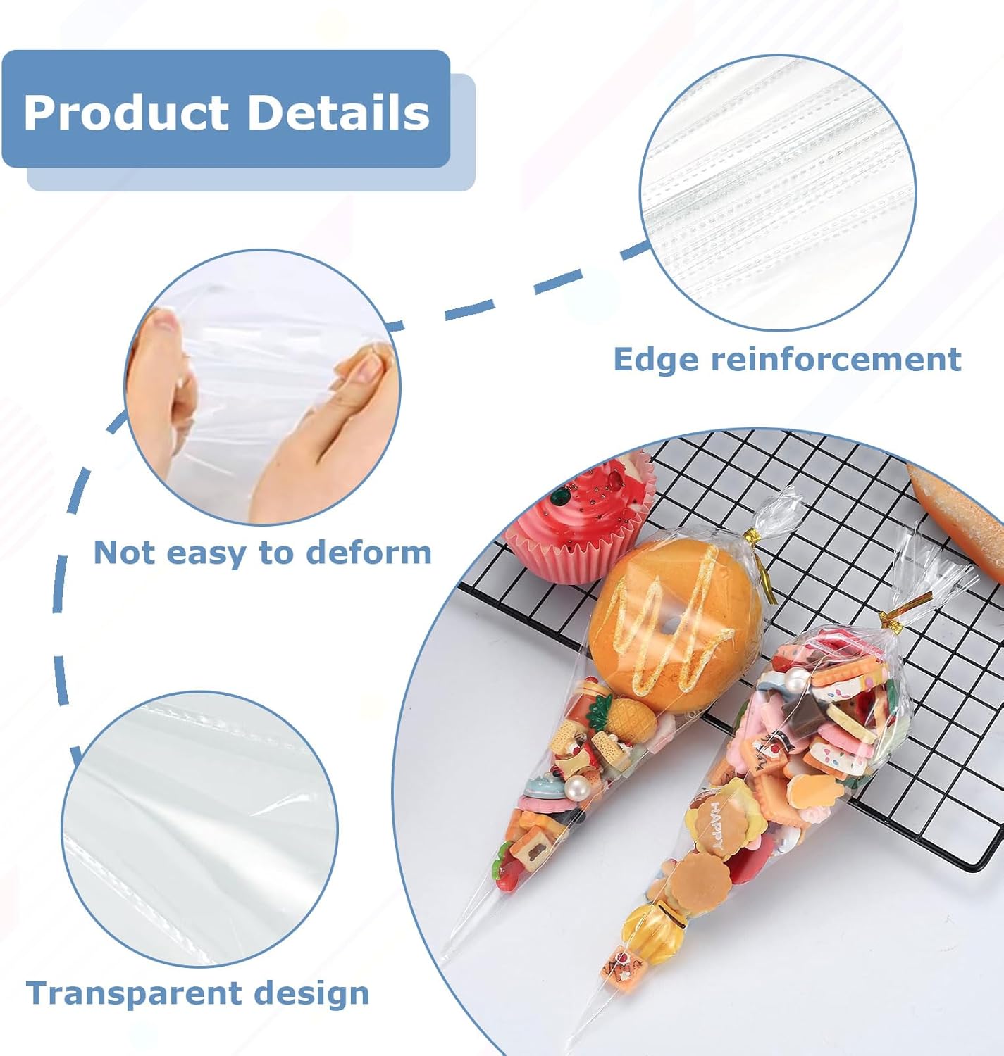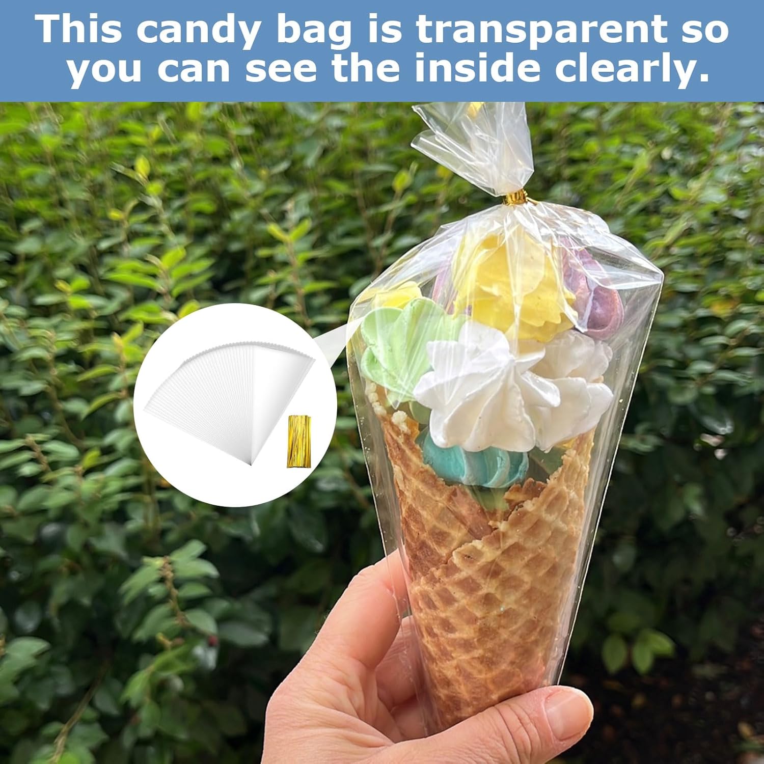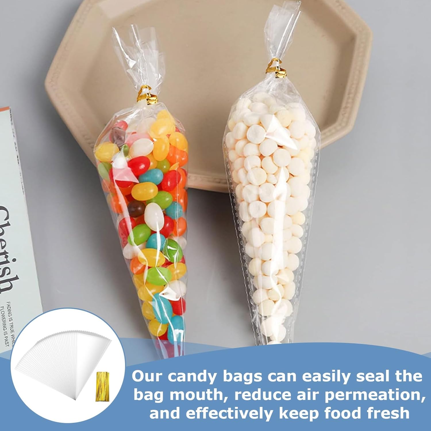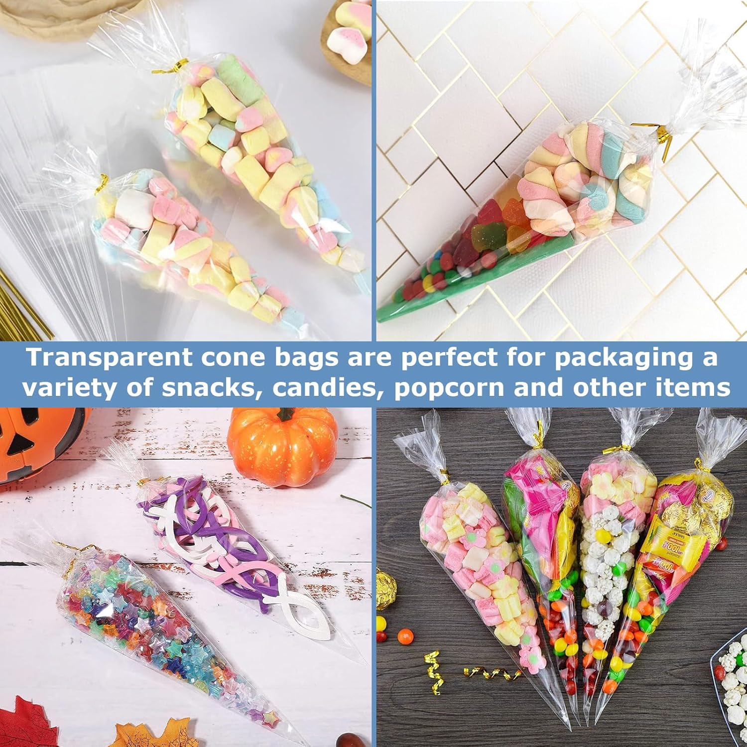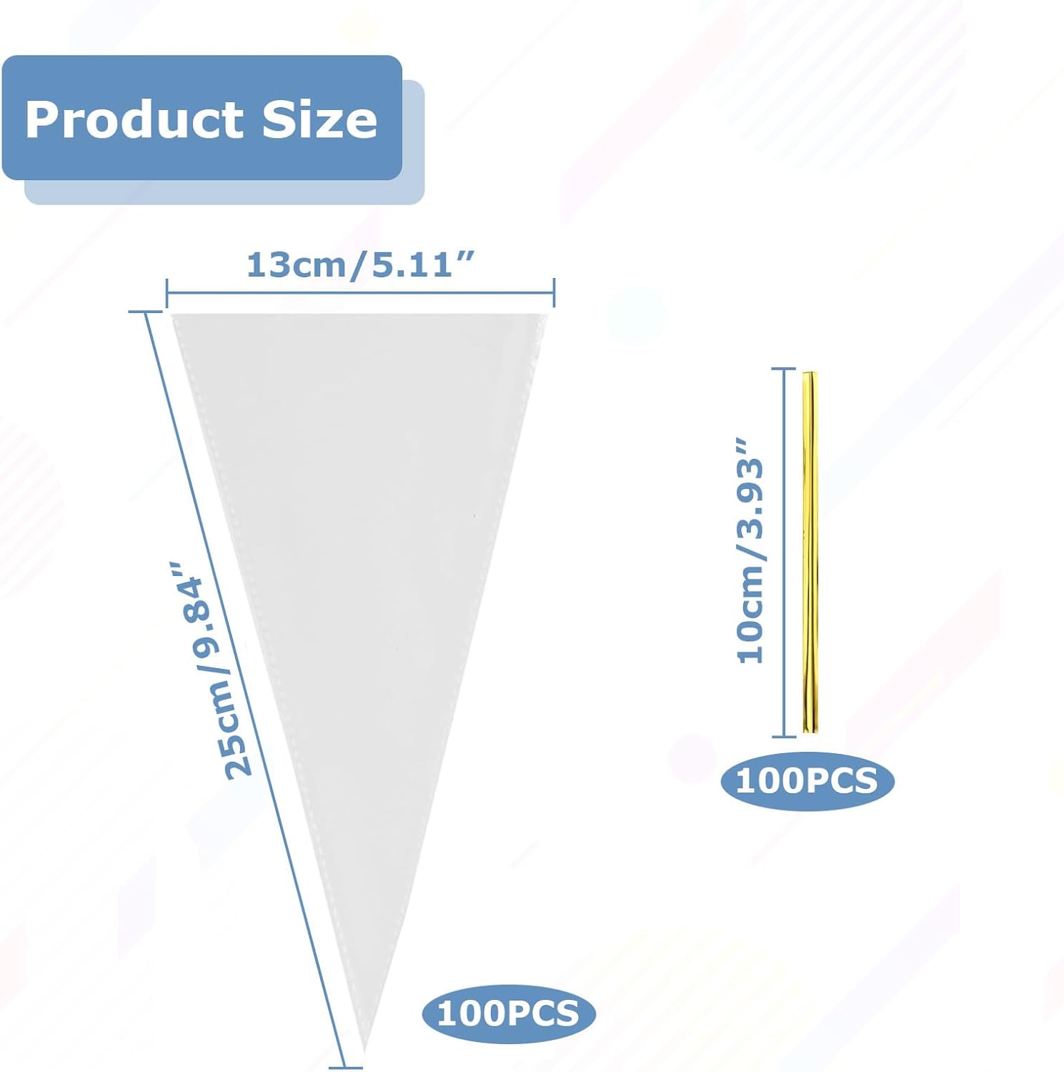 Specifiche del prodotto: Riceverai 100 sacchetti di caramelle + 100 nastri colorati. Le dimensioni della borsa trasparente sono ca. 13 x 25 cm (L x L) e il nastro è di ca. 10 centimetri di lunghezza. La quantità è sufficiente per rendere la tua festa completamente soddisfatta. Materiale robusto: i sacchetti di caramelle a cono sono realizzati in materiale Opp di alta qualità, che è robusto e durevole, sicuro e sano, ecologico e biologico e può entrare in contatto diretto con il cibo, in modo da poter confezionare in sicurezza biscotti, snack, piccoli regali, ecc. Come sac à poche: questo cono ha una forma triangolare. E bambini. Stranamente, è stata una giornata meravigliosa per l'artigianato. Decorazione: dopo aver messo gli oggetti nei sacchetti di caramelle, legare saldamente il sacchetto con una fascetta. Puoi modellare la bocca come desideri per la decorazione. Le cravatte colorate servono come decorazione. Tavolo da pranzo. Le tasche decorative aggiungono un tocco elegante agli oggetti all'interno. Elevata trasparenza: questo sacchetto a cono trasparente è completamente trasparente, puoi riconoscere rapidamente gli oggetti in esso contenuti e può ospitare una varietà di alimenti come torte, biscotti, biscotti, caramelle, cioccolato, piccoli premi, ecc. Puoi usarlo come pacchetti regalo per Natale, matrimoni, feste di compleanno e altri festival.