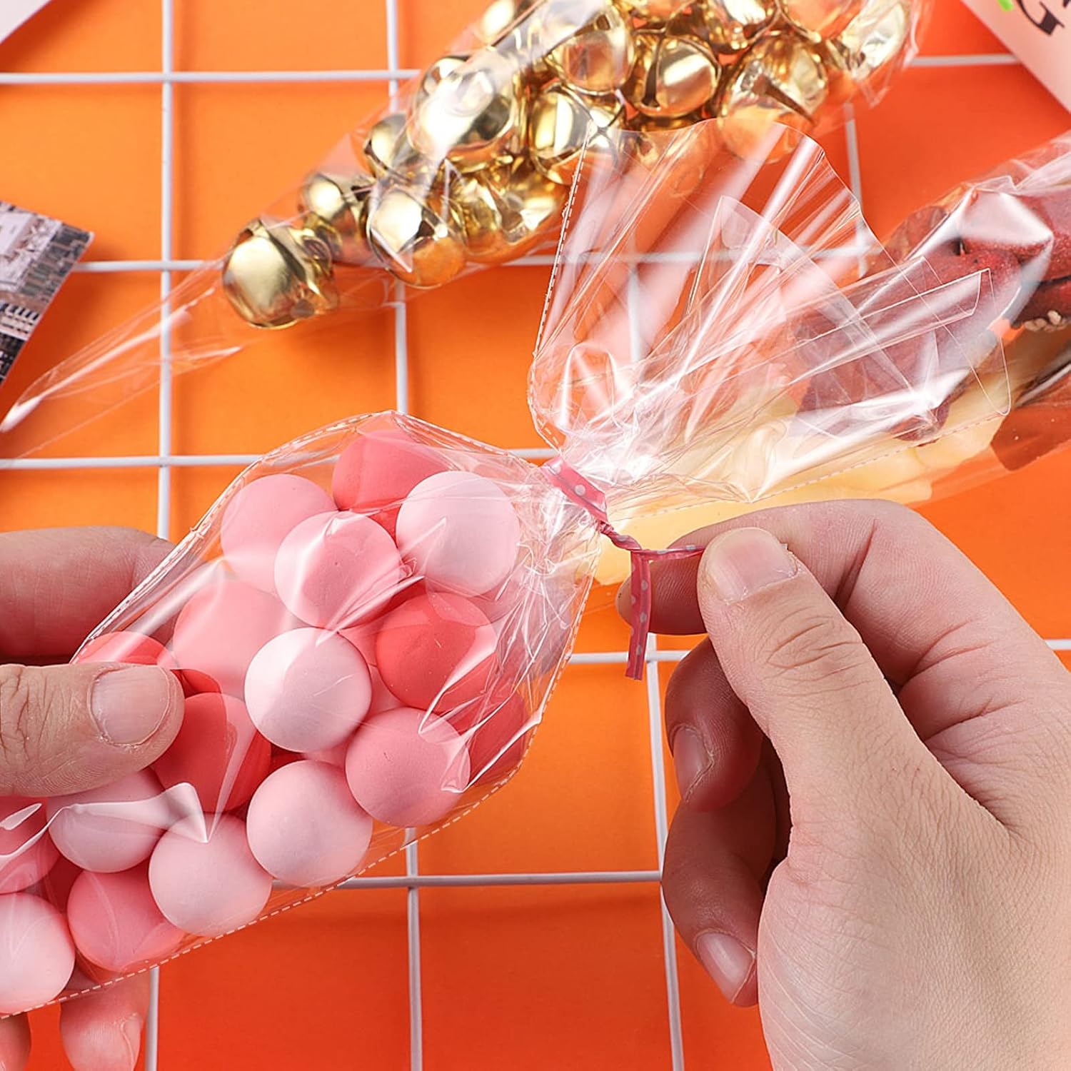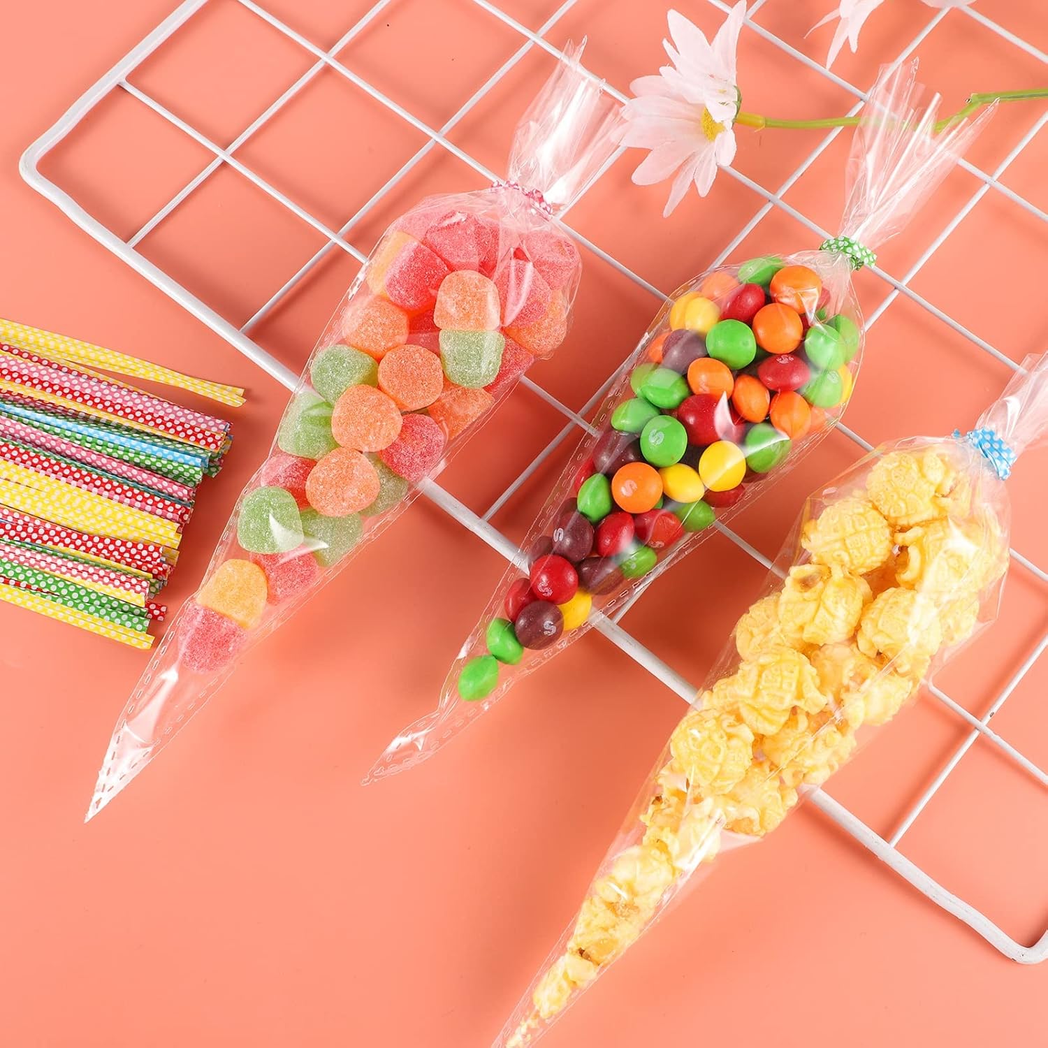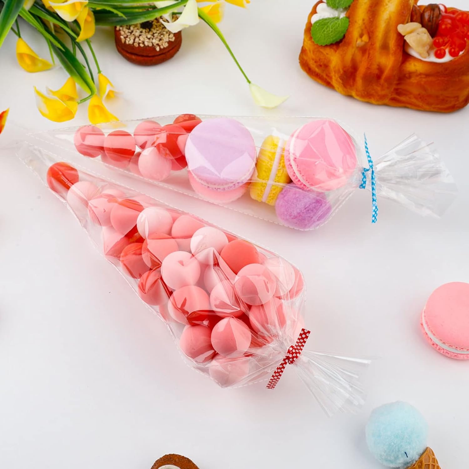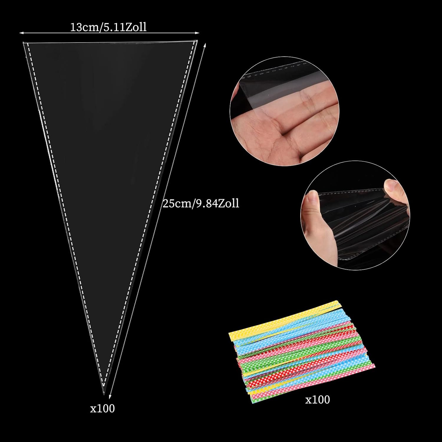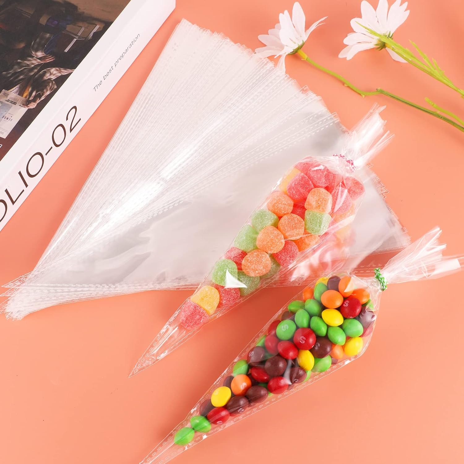 CONFEZIONE - Il set contiene 100 sacchetti di caramelle conici trasparenti che misurano 13 x 25 cm e 100 fascette, sufficienti per le tue necessità quotidiane. SICURO - I sacchetti di caramelle natalizie sono realizzati in materiale OPP, resistente, resistente agli strappi, non facile da rompere e può entrare in contatto diretto con il cibo. TRASPARENTE - Questa borsa trasparente a punta ha un design trasparente, che offre una visione interna chiara, che può trovare rapidamente gli oggetti ed è più comoda. SIGILLATURA - Le fascette sono legate ai sacchetti trasparenti per sigillare, ridurre le infiltrazioni d'aria e preservare efficacemente la freschezza del cibo. APPLICAZIONE - I sacchetti di cellophane natalizi sono adatti per feste di compleanno, matrimoni, Natale e possono essere utilizzati per conservare caramelle, cioccolato, popcorn, ecc.