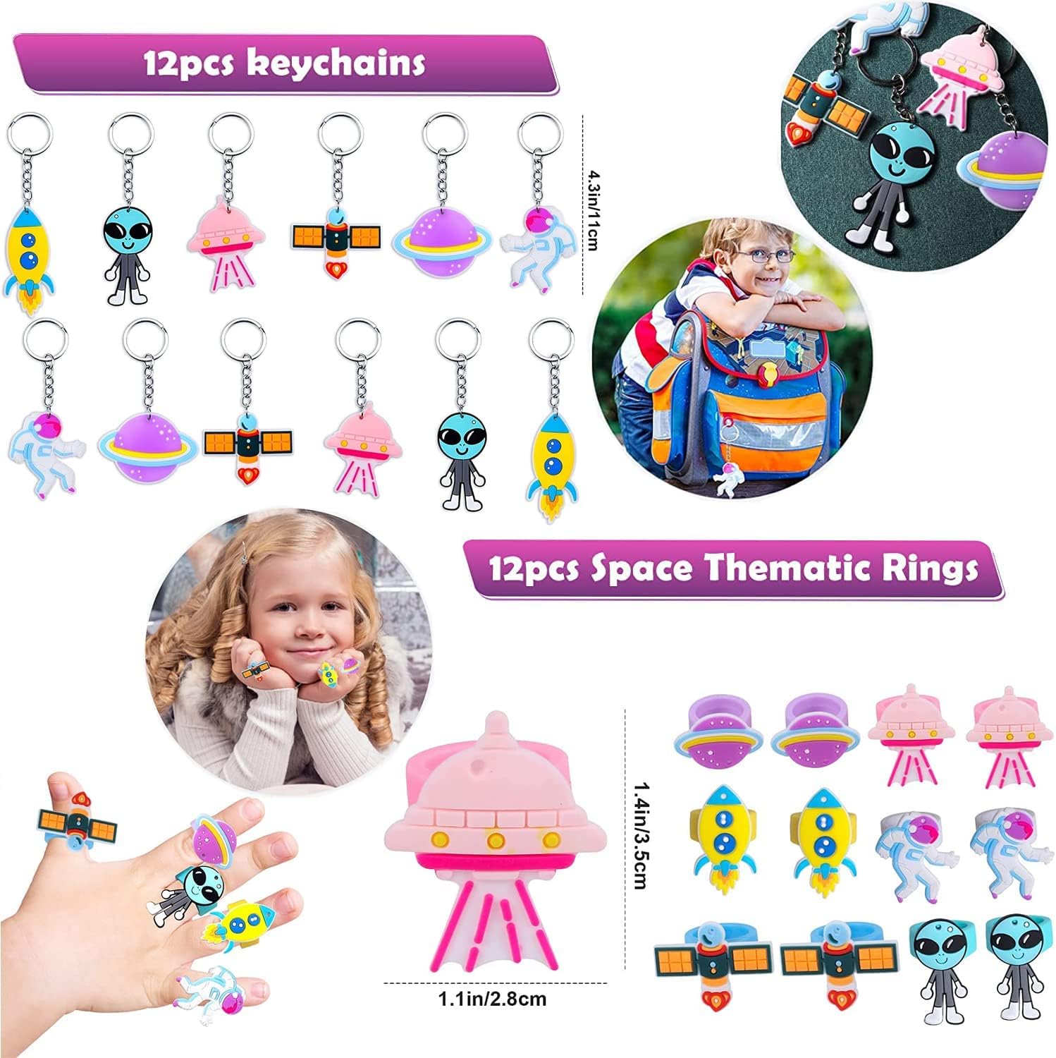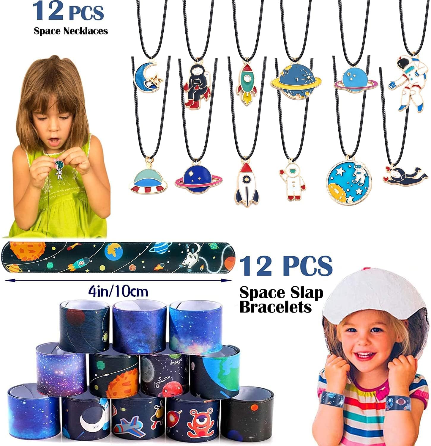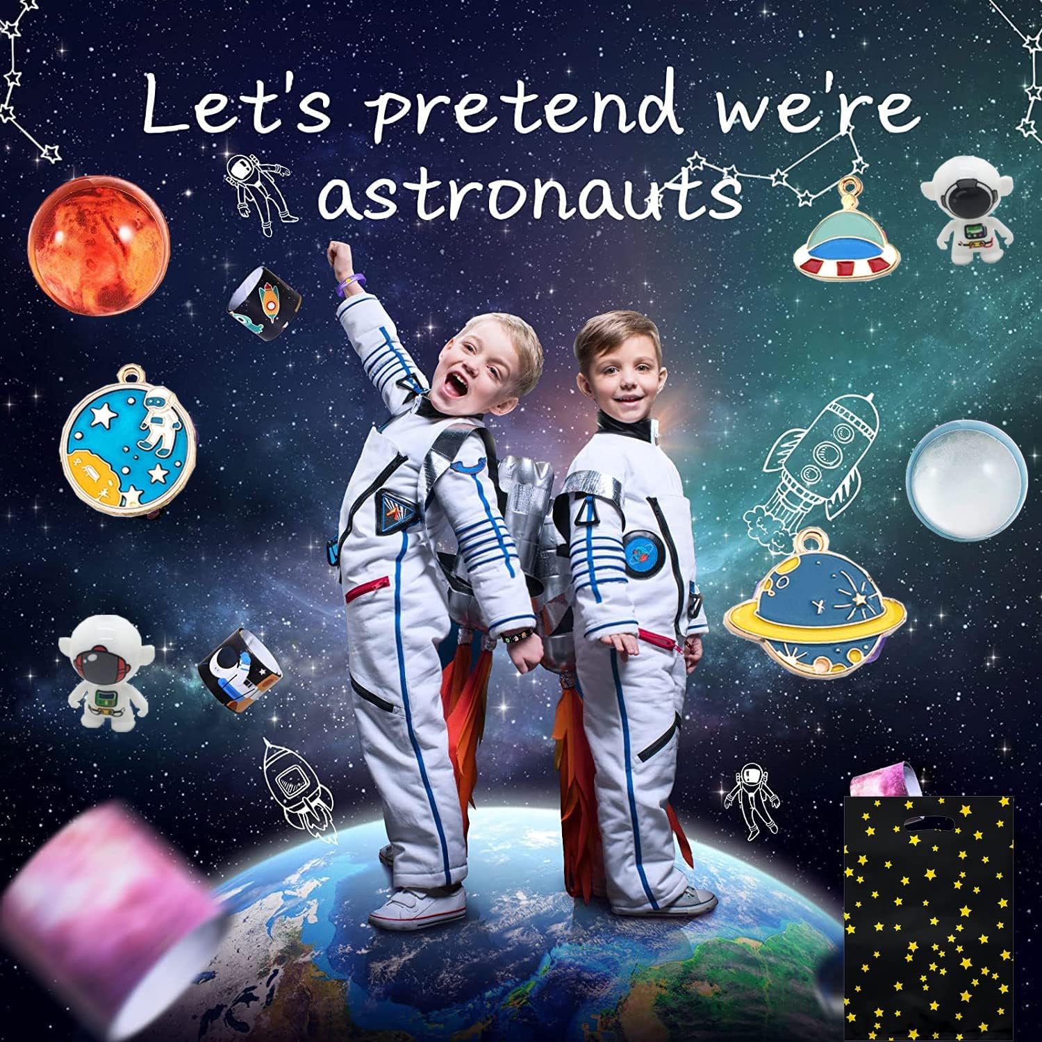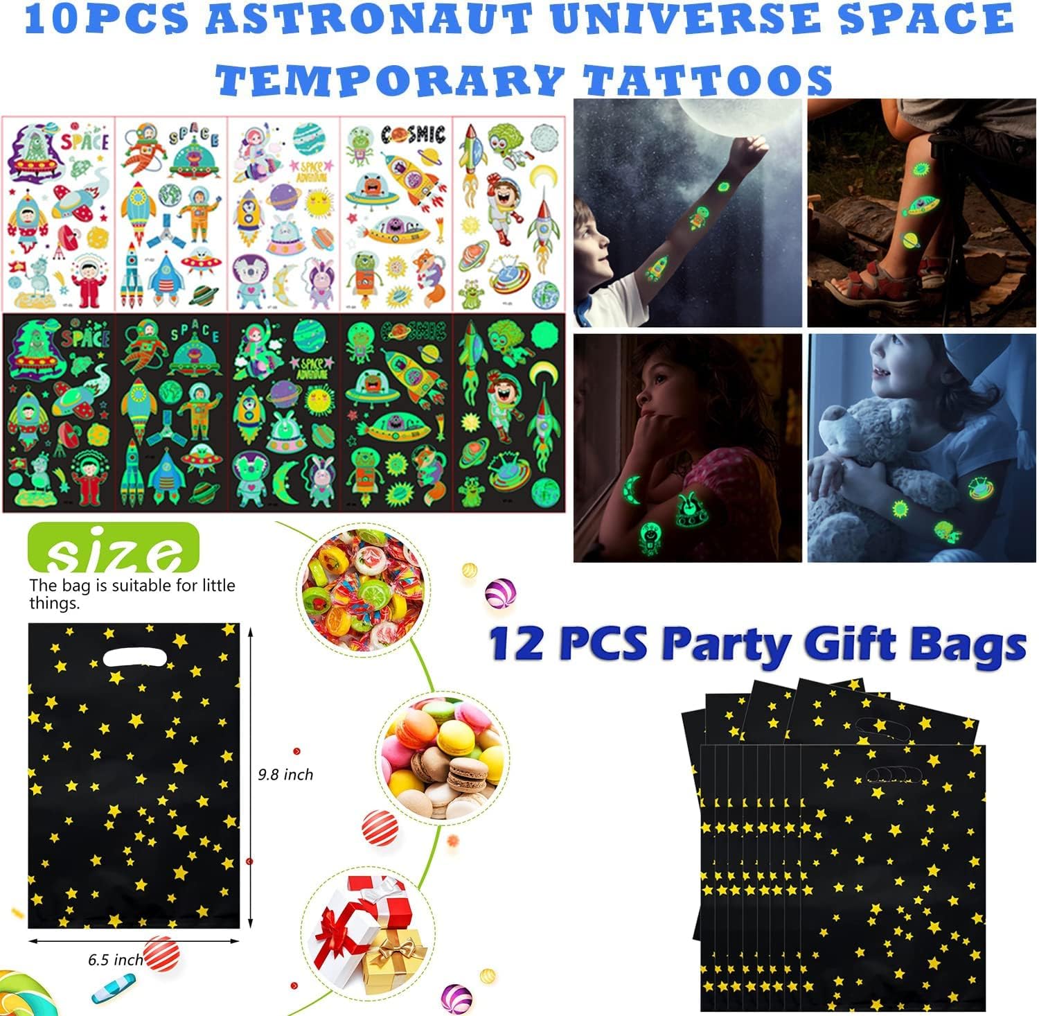 Borsa per feste spaziali: contiene 12 borse per feste spaziali, 12 produttori di rumori di scoppio, 12 braccialetti a scatto spaziali, 12 pezzi di catena spaziale pinata a razzo, 12 pezzi di giocattoli per bicchieri spaziali, 12 pezzi di portachiavi a razzo, 12 pezzi di anelli, 12 pezzi di palline rimbalzanti e 10 pezzi di tatuaggi spaziali, per un totale di 106 pezzi di regali per feste spaziali per bambini ragazzi ragazzi regali per sacchetti regalo per feste di compleanno spaziali. Divertente giocattolo spaziale: gli adesivi luminosi del tatuaggio possono continuare a brillare nella notte oscura, il sole, la luna, gli astronauti, gli alieni, i razzi spaziali e altri motivi su ogni tatuaggio sono vividi e belli. La bellissima borsa regalo viene utilizzata per conservare piccoli regali e aggiungere mistero alla tua festa. Il portachiavi può essere appeso alla borsa dei bambini, i ragazzi e le ragazze lo adoreranno. Materiale di alta qualità: il nostro giocattolo spaziale di sicurezza all'aperto è realizzato con materiali sicuri e innocui. Interessante giocattolo per feste a tema spaziale che attira l'attenzione dei bambini e li porta più divertenti alla festa spaziale, le bomboniere spaziali rendono la tua festa un grande successo. Divertente giocattolo spaziale: l'astronauta elastico è un giocattolo antistress. I bambini possono girare e tirare questi astronauti come preferiscono. I bambini possono giocare con braccialetti schiaffo e palline rimbalzanti spaziali, i bambini devono amare questi giocattoli divertenti e fantastici! per contenere piccoli regali che aggiungono mistero alla tua festa. Dopo la festa i bambini potranno portare con sé i regali. Ottimo regalo per i tuoi bambini: i nostri set per feste spaziali sono la migliore scelta regalo per ragazzi e ragazze. Perfetto per bomboniere, bomboniere, regali di Natale, regali di Halloween, regali di Pasqua, premi in classe, premi di giochi e così via. I tuoi bambini potranno condividere anche con i loro amici, sarà un ponte di amicizia tra bambini!