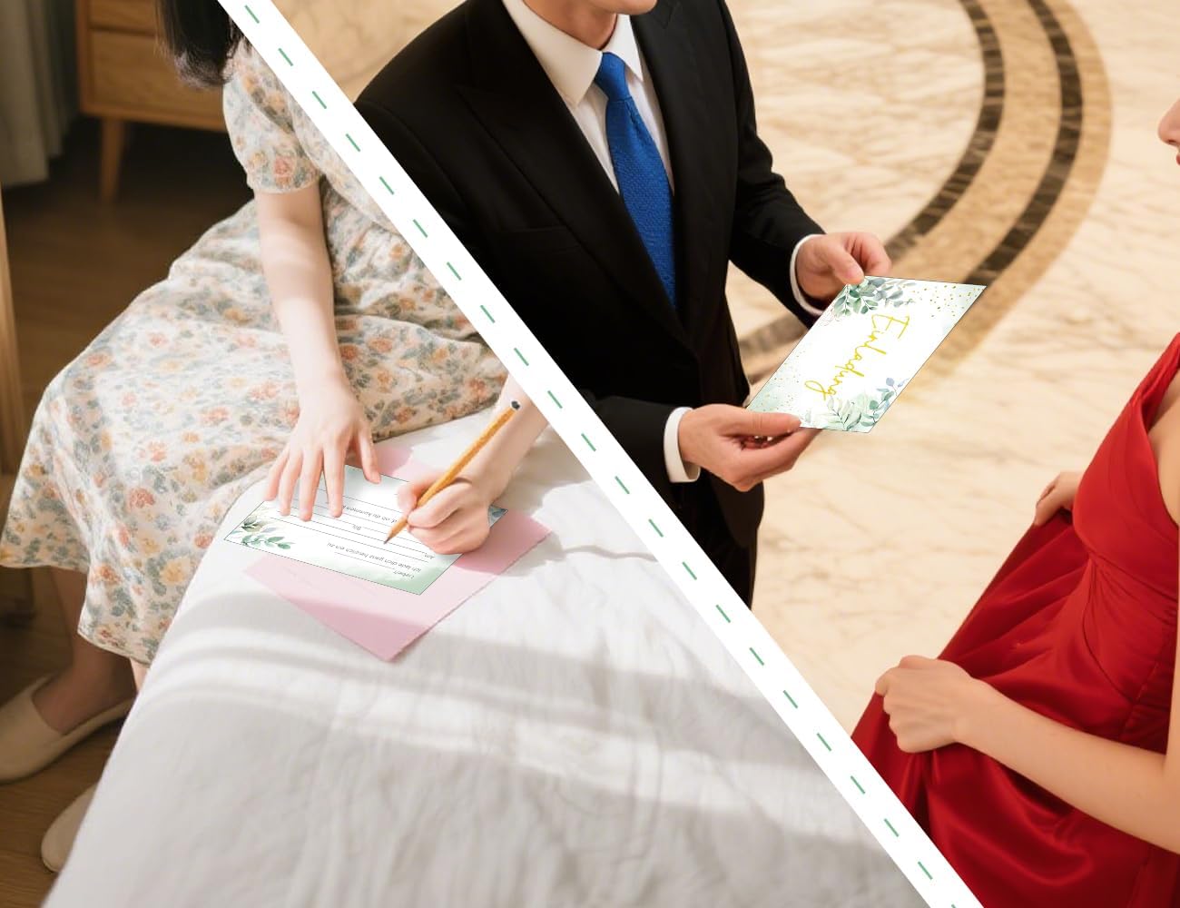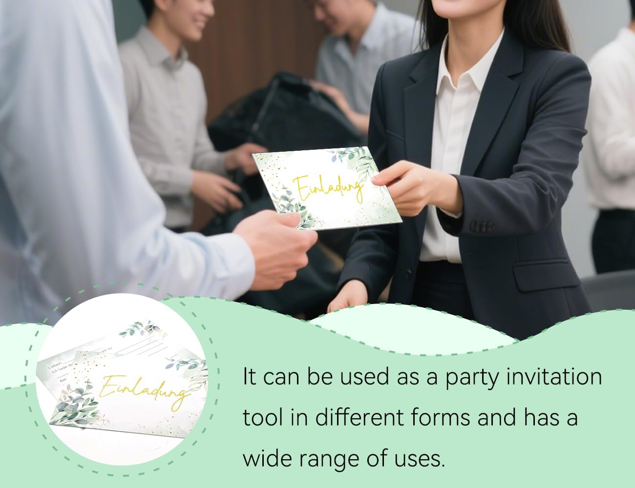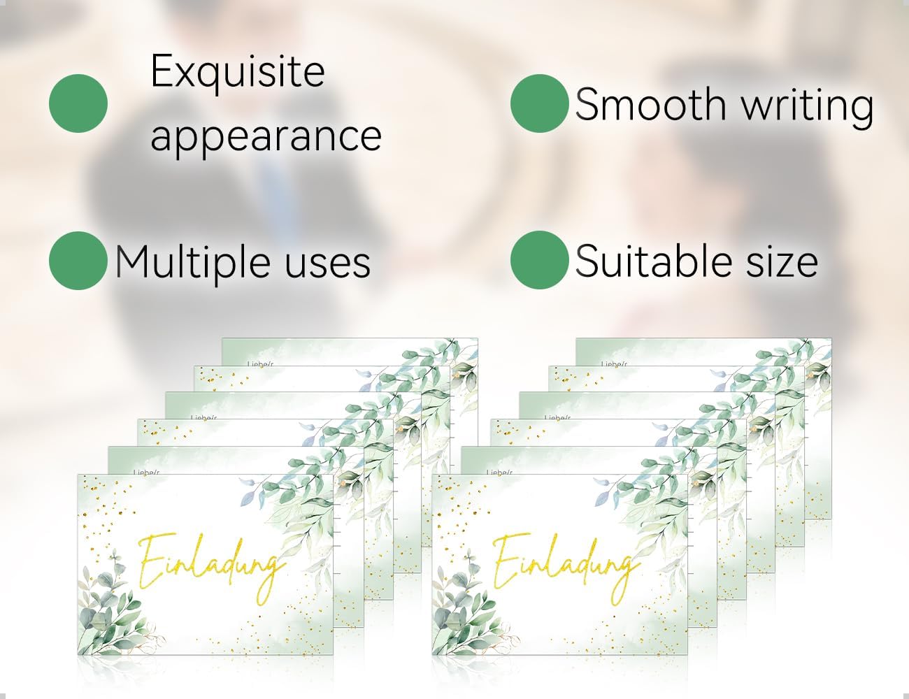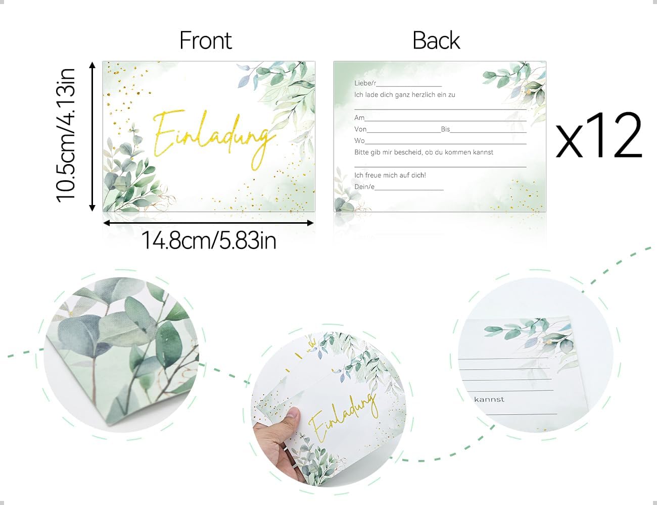[Contenuto del set]:Questo set contiene 12 biglietti d'invito,una quantità generosa per inviti a diverso occasioni.diverso biglietto d'invito è splendidamente progettato e aggiunge uno stile e un tocco unici [Caratteristiche del design]:Questi biglietti d'invito colpiscono per il loro delicato motivo a foglia verde con dettagli dorati.Il carattere è semplice e sobrio e diverso invito ha dimensioni moderate, il che lo rende facile da trasportare e riporre [Proprietà del materiale]:Questi biglietti d'invito sono realizzati in carta rigida e offrono una consistenza e una sensazione piacevoli al tatto.La superficie liscia dei biglietti è perfetta per scrivere e decorare,esaltando dettagli e stampe intricati [Funzione e applicazione]:Questi biglietti d'invito sono adatti per feste di compleanno,matrimoni,comunioni,cresime e altro ancora.Compila i dettagli sul retro per estendere il tuo caloroso invito [Ampiamente usato]:Questi biglietti d'invito sono ideali per cerimonie,eventi e riunioni di lavoro.Offrono un modo elegante e personalizzato per invitare amici e familiari a occasioni importanti