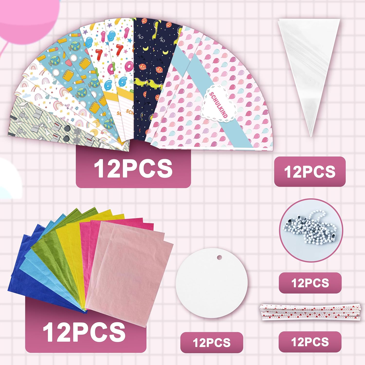 🎨【Contenuto della confezione】12 fogli di carta per scolaretti a forma di ventaglio (6 modelli x 2), 12 sacchetti di cellophane trasparente con laccio, 12 fogli di carta da regalo decorativi, 12 biglietti da appendere con nome scrivibile. Tutto l'occorrente per creare un cono scolastico personalizzato! 🌟【Design unico】I nostri zaini scolastici sono decorati con graziosi motivi come unicorni, razzi e arcobaleni. Con il cartello bianco puoi scrivere il nome del bambino. – perfetto per creare attesa per il primo giorno di scuola! 🌿 【Materiale di alta qualità】 Gli zaini per la scuola sono realizzati in cartone robusto ed ecologico, mentre i sacchetti di cellophane sono realizzati in materiale OPP resistente agli strappi. Sicuro, resistente e ideale per dolci o piccole sorprese. ✂ 【Istruzioni semplici per il bricolage】 Etichetta lo zaino con il nome del bambino, attaccalo con gli adesivi inclusi, riempilo di regali e sigillalo con il sacchetto di cellophane. Un bellissimo cono di zucchero può essere creato in pochi passaggi! 🎉【Versatile】Perfetto come regalo per la prima scuola, decorazione per la festa del rientro a scuola o come dolce sorpresa per i bambini dell'asilo. Rendi indimenticabile il grande giorno con un cono scolastico personalizzato!