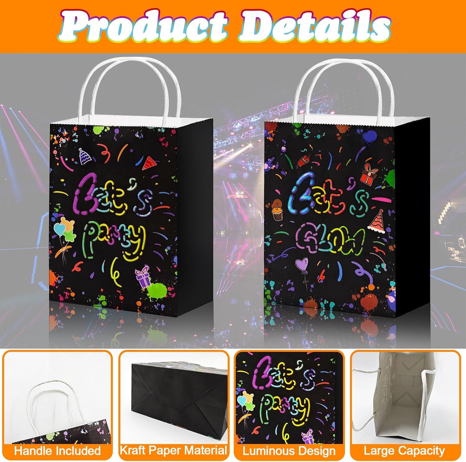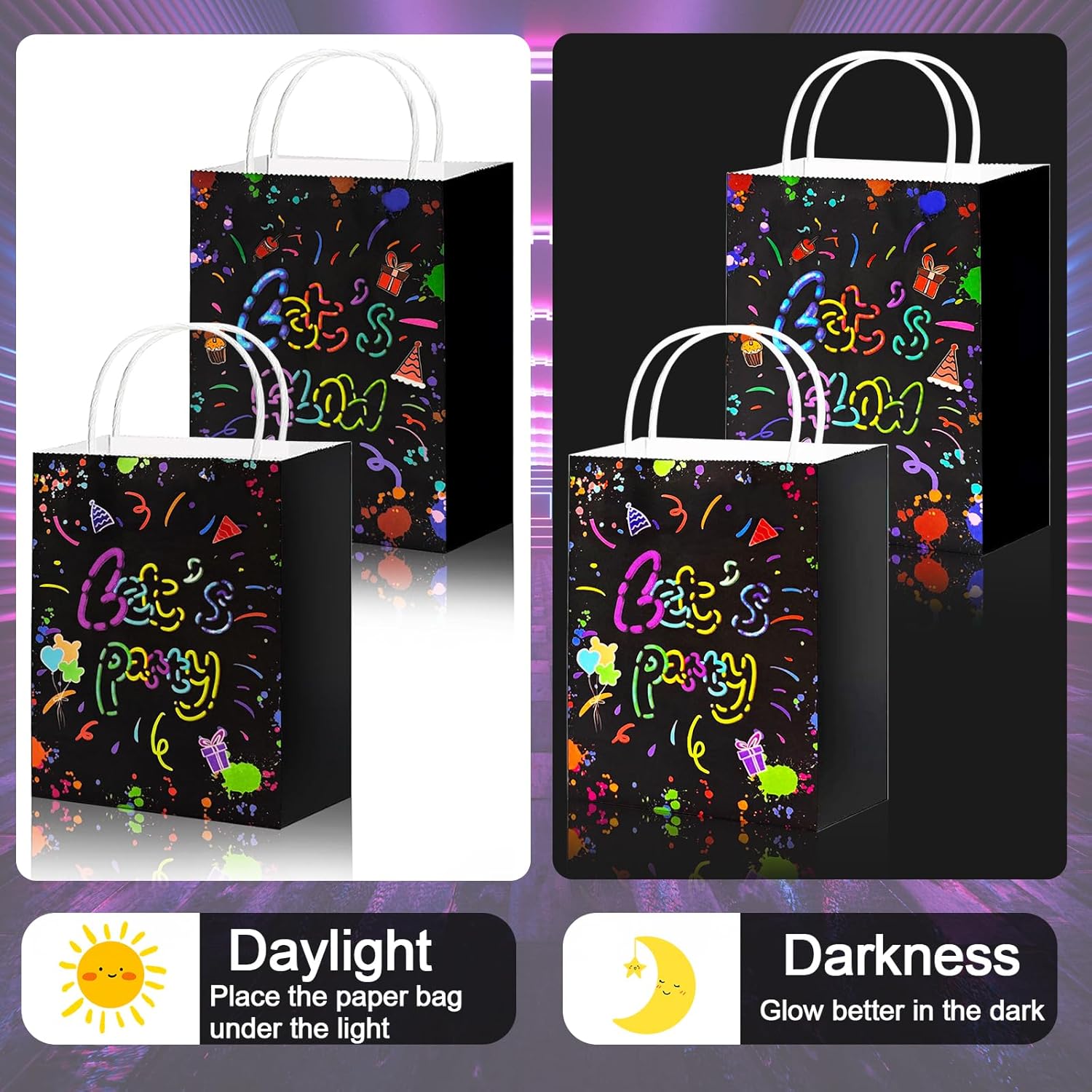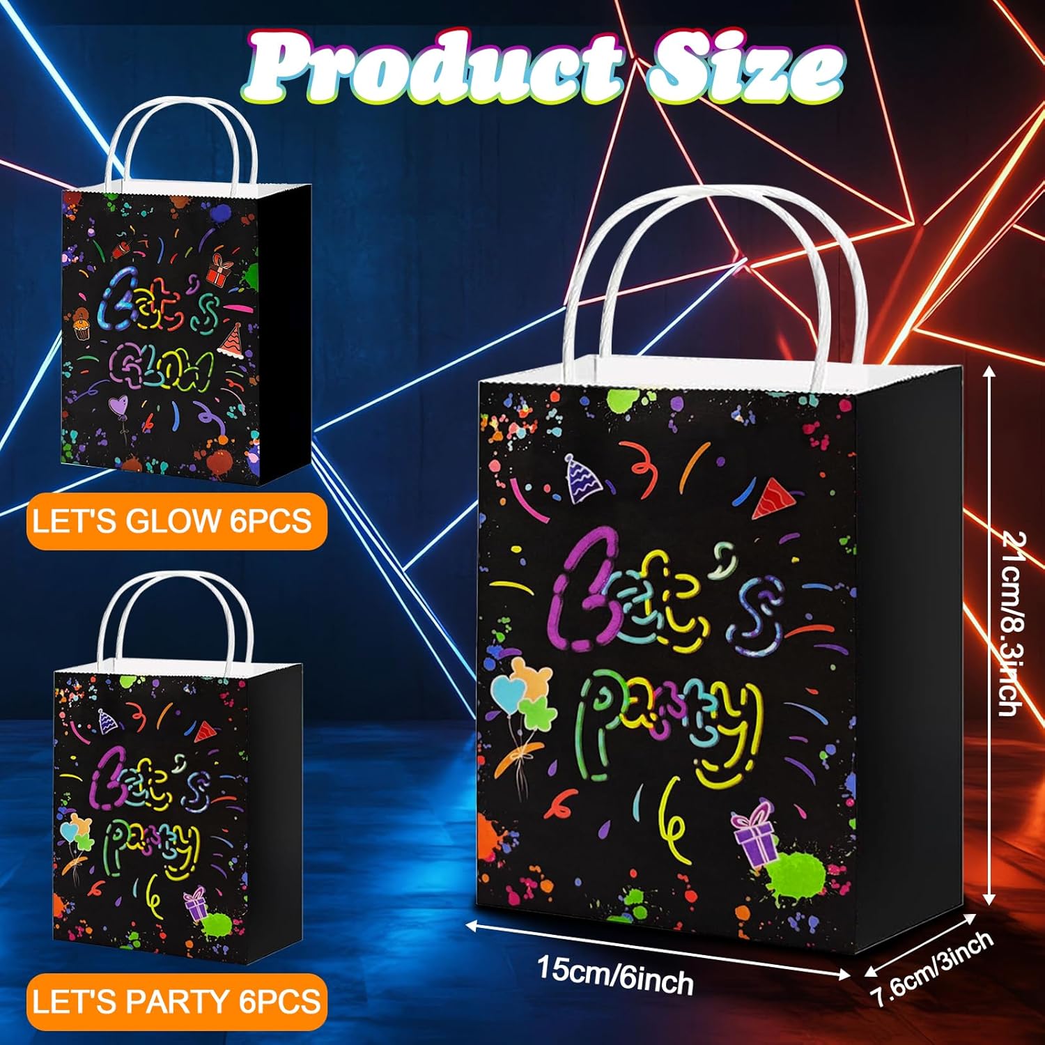 【Imposta contenuto】Riceverai 6 sacchetti di carta kraft con tema LETS GLOW e 6 sacchetti di carta kraft con motivo LETS PARTY per soddisfare le esigenze di diverse occasioni, adatti a feste di compleanno, festival, matrimoni e riunioni e molte altre occasioni. 【Materiale di alta qualità】 I sacchetti di carta per feste sono realizzati in materiale di carta kraft di alta qualità, atossico e innocuo, resistente e durevole, con forte capacità portante, non facile da strappare, riutilizzabile. 【Design luminoso】 L'esclusivo effetto fosforescente dei sacchetti di carta per feste per bambini emette una morbida luce fluorescente al buio, creando una fantastica atmosfera di festa, attirando l'attenzione dell'intera stanza e rendendo la confezione regalo più creativa. 【Capacità extra grande】 Ogni sacchetto di carta kraft misura 15 x 7,6 x 21 cm (6 x 3 x 8,3 pollici), molto spazio per caramelle, snack, piccoli regali, giocattoli, ecc. per soddisfare una varietà di esigenze di contenimento. Facile da usare: il sacchetto di carta che si illumina al buio è pieghevole e può essere montato rapidamente senza attrezzi. Dotato di una robusta maniglia per il trasporto in carta, facile da trasportare, non facile da rompere, adatta per adulti e bambini, facile da trasportare.