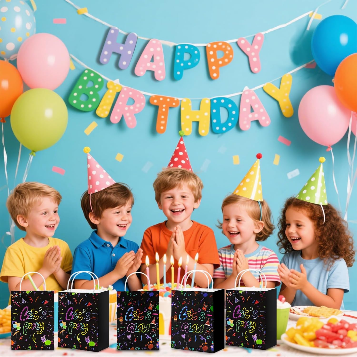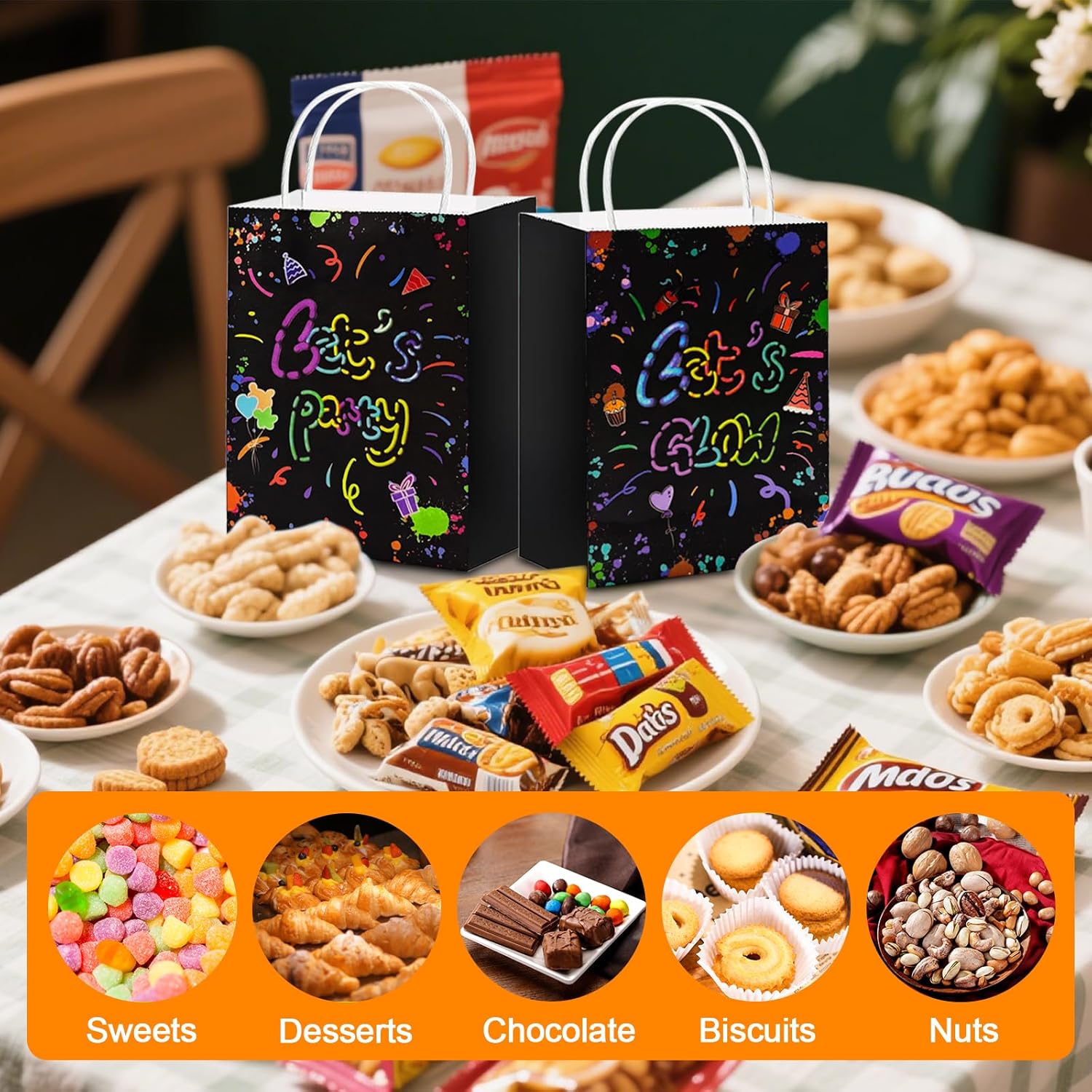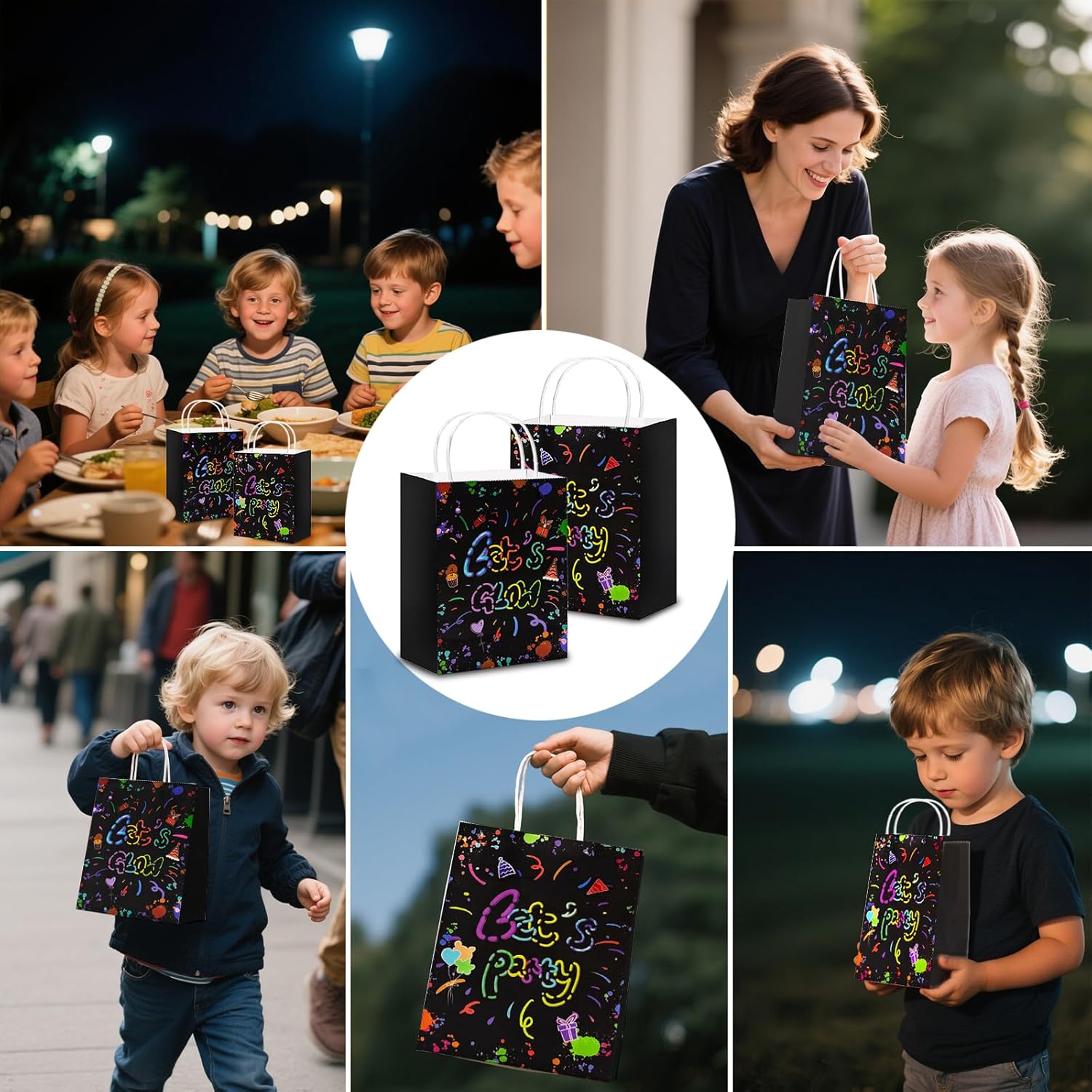 【Imposta contenuto】Riceverai 6 sacchetti di carta kraft con tema LETS GLOW e 6 sacchetti di carta kraft con motivo LETS PARTY per soddisfare le esigenze di diverse occasioni, adatti a feste di compleanno, festival, matrimoni e riunioni e molte altre occasioni. 【Materiale di alta qualità】 I sacchetti di carta per feste sono realizzati in materiale di carta kraft di alta qualità, atossico e innocuo, resistente e durevole, con forte capacità portante, non facile da strappare, riutilizzabile. 【Design luminoso】 L'esclusivo effetto fosforescente dei sacchetti di carta per feste per bambini emette una morbida luce fluorescente al buio, creando una fantastica atmosfera di festa, attirando l'attenzione dell'intera stanza e rendendo la confezione regalo più creativa. 【Capacità extra grande】 Ogni sacchetto di carta kraft misura 15 x 7,6 x 21 cm (6 x 3 x 8,3 pollici), molto spazio per caramelle, snack, piccoli regali, giocattoli, ecc. per soddisfare una varietà di esigenze di contenimento. Facile da usare: il sacchetto di carta che si illumina al buio è pieghevole e può essere montato rapidamente senza attrezzi. Dotato di una robusta maniglia per il trasporto in carta, facile da trasportare, non facile da rompere, adatta per adulti e bambini, facile da trasportare.