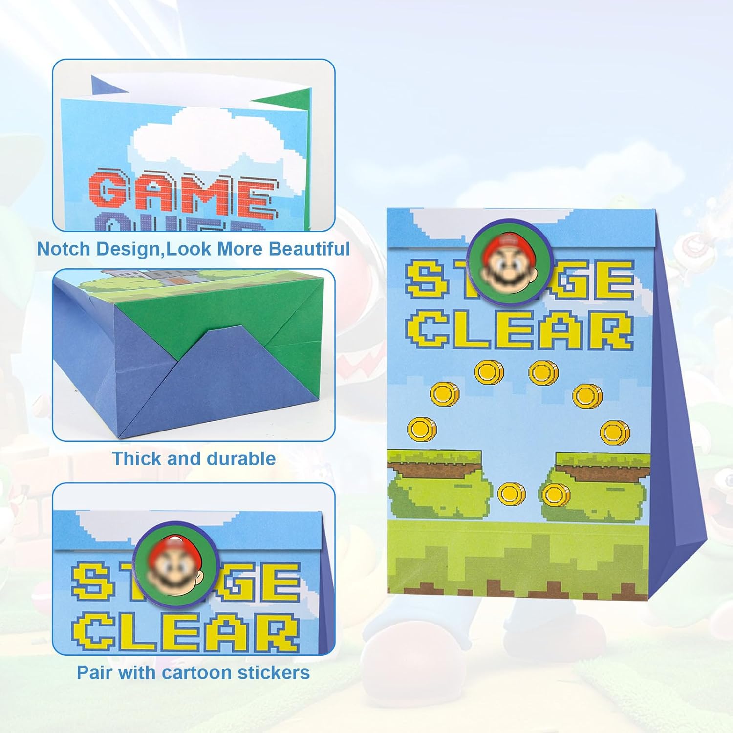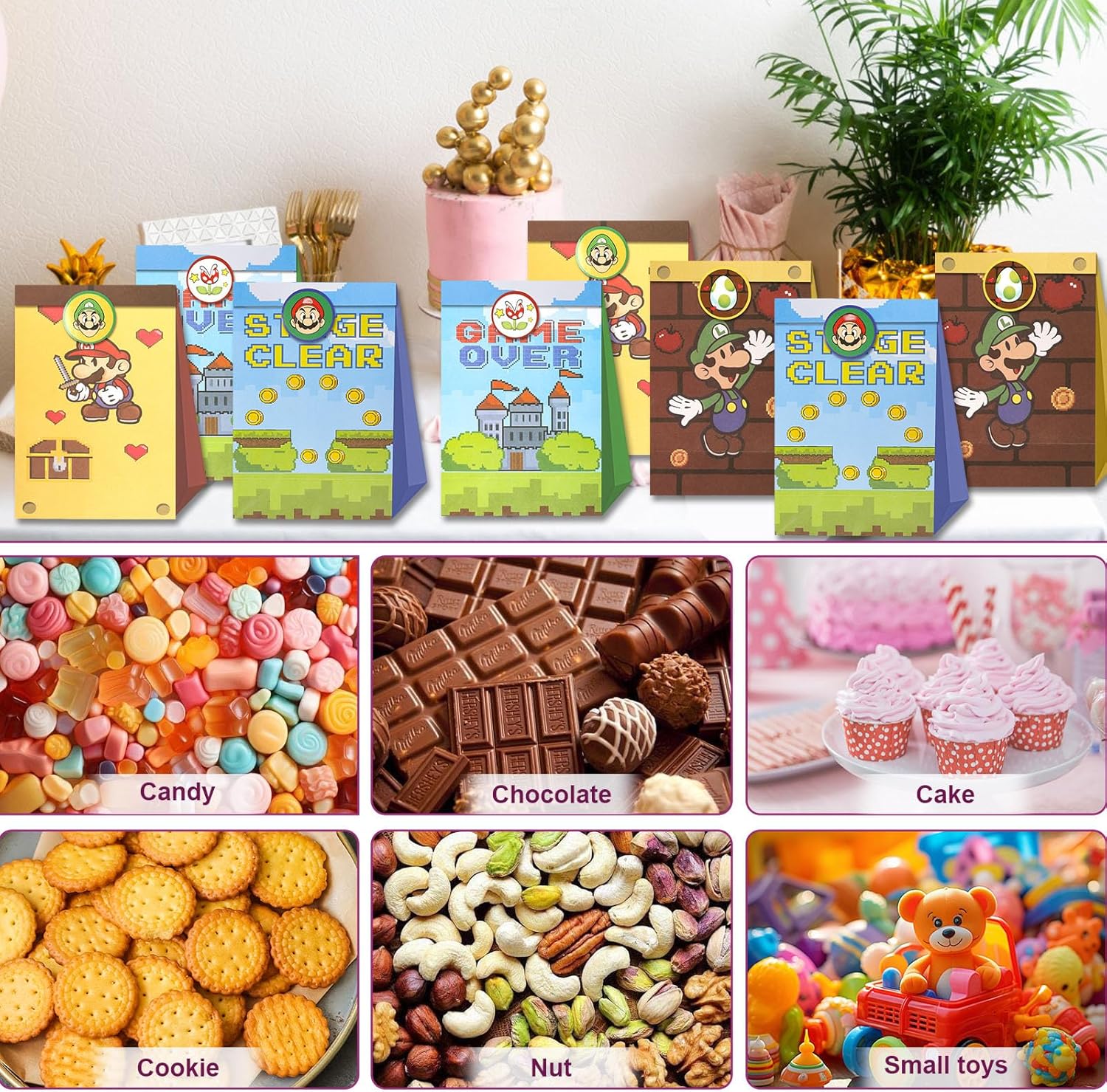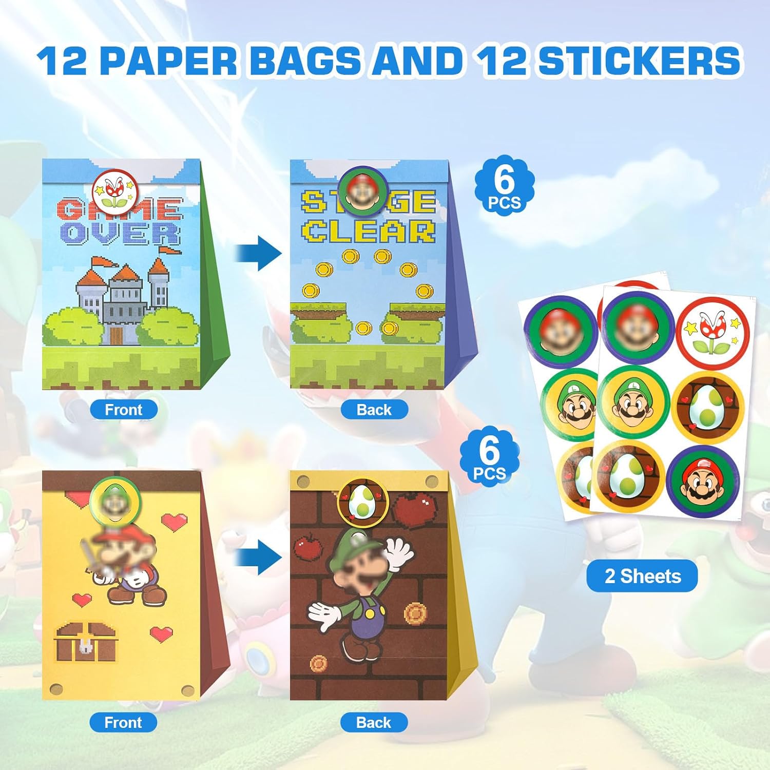 【Sacchetti regalo】Il set di sacchetti di carta kraft comprende 12 sacchetti di carta + 12 adesivi; I sacchetti di carta sono disponibili in 2 stili diversi, ciascuno con 2 modelli, ideali per confezionare dolci per feste, biscotti, articoli vari, ecc. I sacchetti di carta hanno una dimensione di 21 x 12 x 7 cm, sono leggeri, facili da trasportare e riutilizzabili più volte. 【Include 12 adesivi】 Gli adesivi aiutano a sigillare il sacchetto regalo in modo che le caramelle non cadano, facilitano il trasporto dei bambini e allo stesso tempo aggiungono più eccitazione quando si disimballano i regali, stimolando l'interesse dei bambini. 【Bellissimi motivi】 I sacchetti di carta sono stampati su entrambi i lati con diversi motivi di cartoni animati, colorati e stampati in alta risoluzione. Sono molto apprezzati dai bambini e sono ideali per decorare le feste di compleanno dei bambini. 【Ampi usi】 I sacchetti regalo di compleanno sono ottimi per conservare caramelle, biscotti, piccoli giocattoli, regali, ecc. Possono essere utilizzati anche per feste a tema, feste di compleanno, premi di classe, matrimoni, Natale e altre occasioni.