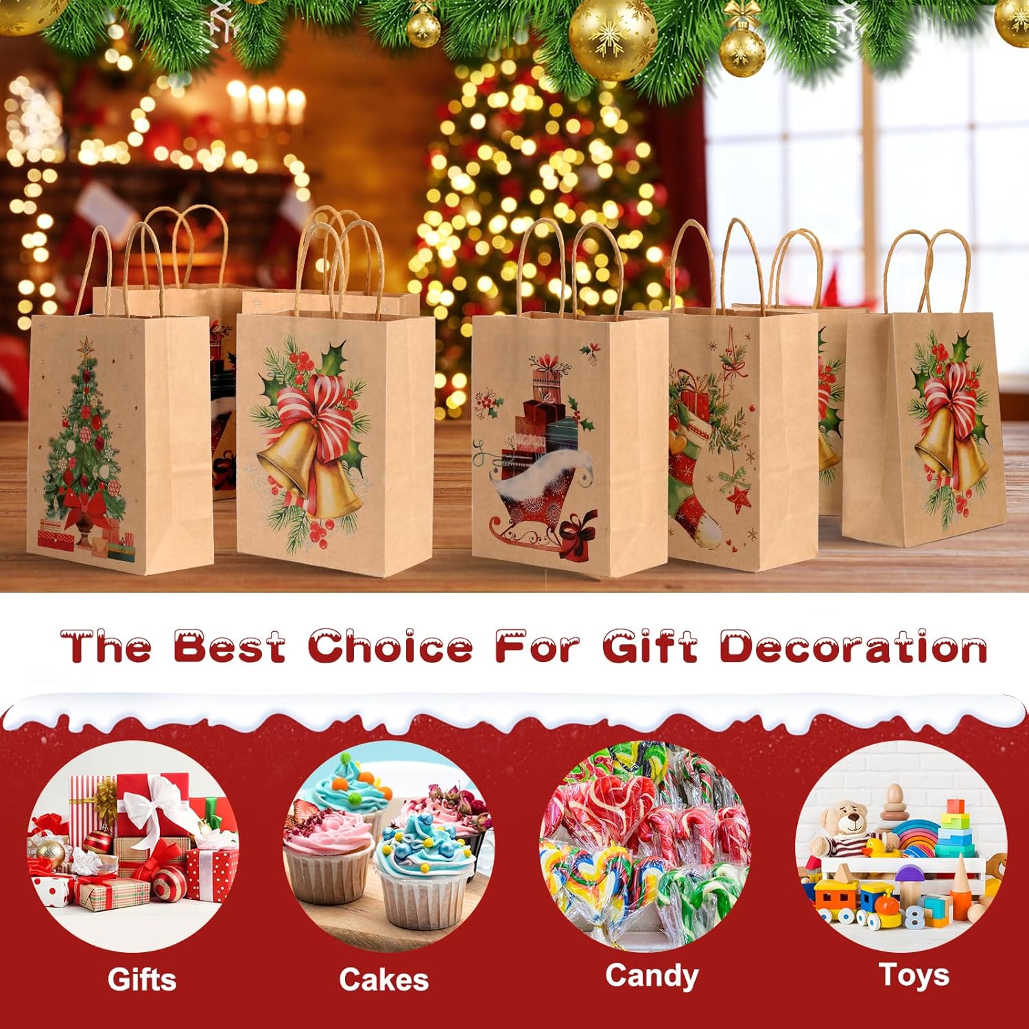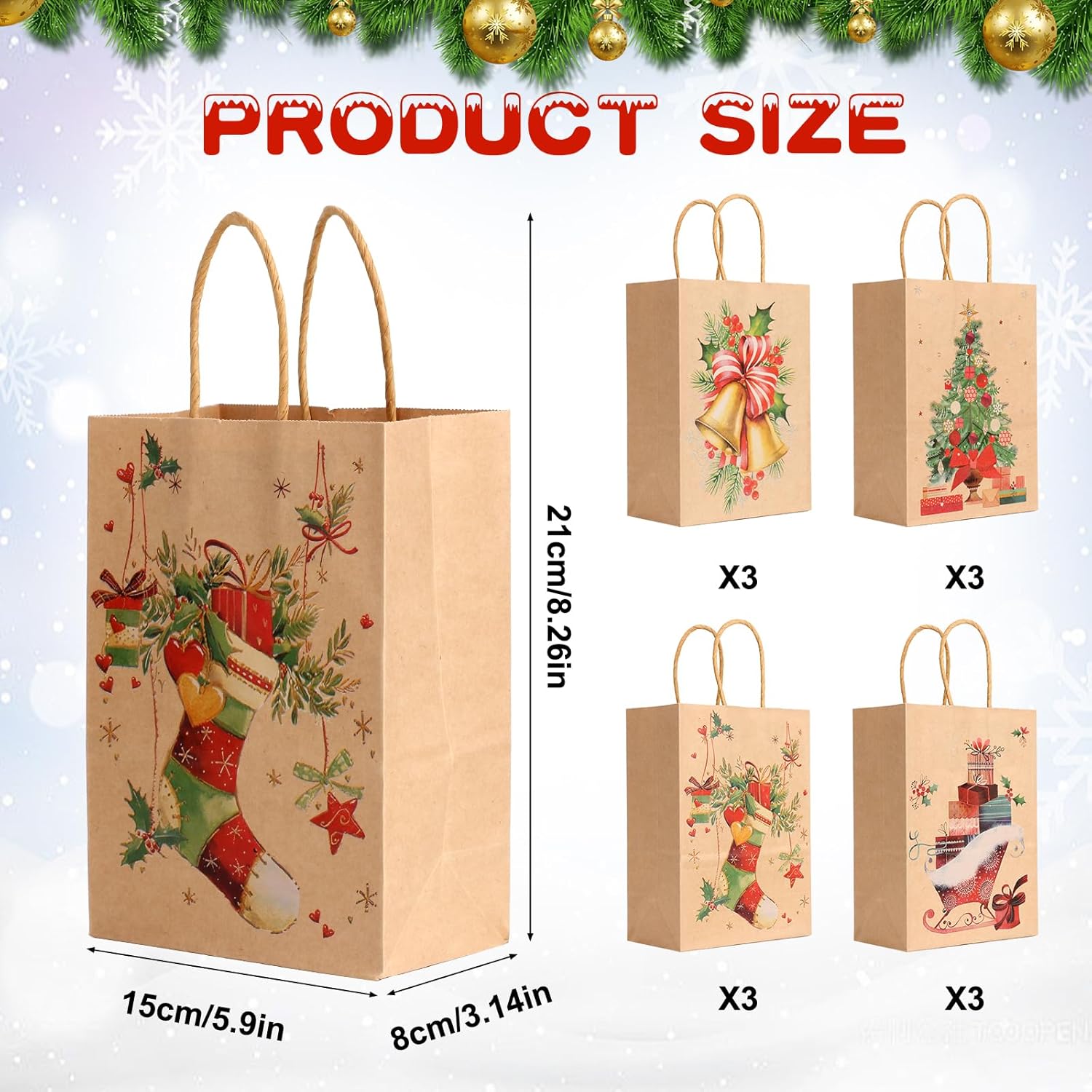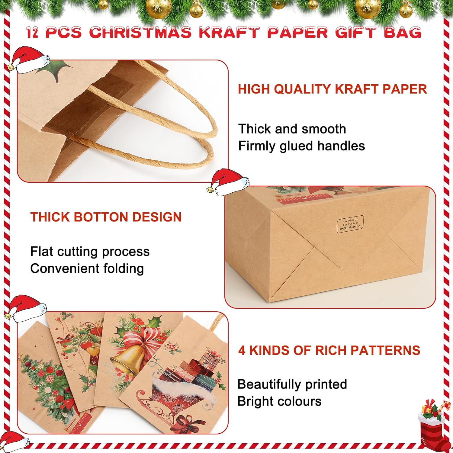 【Sacchetti natalizi in carta kraft da 12 pezzi】 Include 12 sacchetti natalizi con 4 motivi di albero di Natale, calzini natalizi, campanelli e slitta, 3 pezzi per ciascun modello. Gli elementi classici natalizi e i colori vivaci possono facilmente creare una forte atmosfera natalizia, sufficiente a soddisfare una varietà di esigenze. 【Sacchetto di carta Kraft medio】 Questo sacchetto di carta natalizio misura circa 21 x 15 x 8 cm/8,26 x 5,9 x 3,14 pollici (esclusa l'altezza del manico) e ha una capacità di peso da 1 a 3 kg. È perfetto per regali o bomboniere di piccole e medie dimensioni, può contenere snack, regali, ecc. Per portare gioia alla tua famiglia, ai tuoi amici, ecc. Inoltre, il sacchetto di carta ha una stampa con motivi chiari, colori brillanti, facile da pulire e sicuro per i bambini. Puoi usarli in sostituzione dei sacchetti di plastica puzzolenti. 【Design della maniglia】 Ogni borsa regalo di Natale ha una maniglia robusta per poterla trasportare. Le maniglie sono incollate con colla di alta qualità, non facile da rompere, riducendo il rischio di rottura. I sacchetti di carta sono facili da aprire e piegare, basta piegare questi sacchetti regalo e conservarli per un uso futuro. 【Ampiamente usato】 Questi sacchetti regalo di Natale sono perfetti per decorazioni natalizie, celebrazioni, compleanni, feste e altro ancora. Sono ideali per confezionare regali, caramelle, cioccolatini, ecc. Queste borse dall'aspetto elegante e dal design unico possono rendere i tuoi regali più squisiti e attraenti e stupiranno i tuoi amici.