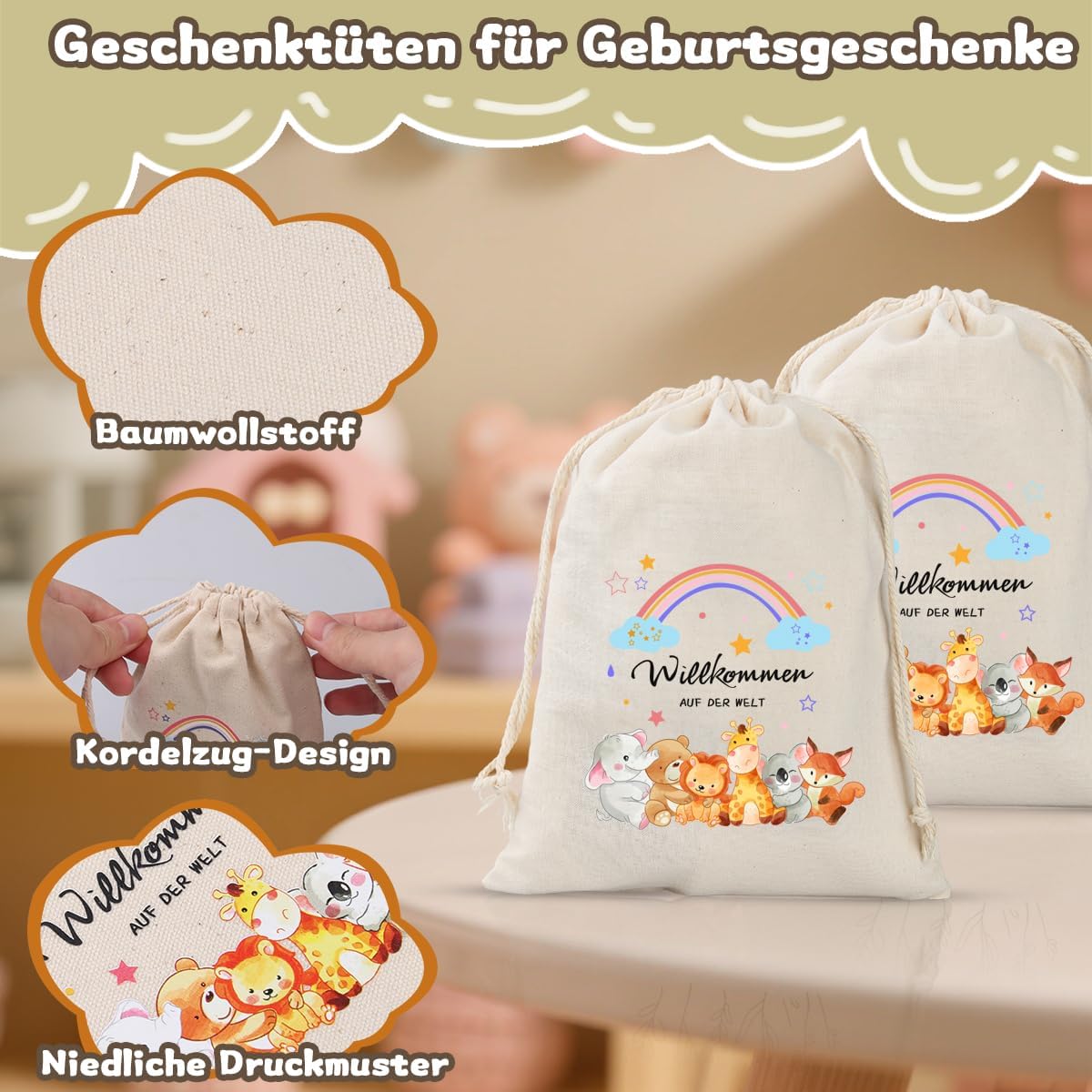 🎁【Sacchetti regalo in cotone】 12 sacchetti in tessuto (17 x 13 cm) con coulisse sono la confezione regalo ideale per la nascita di maschi e femmine. Questi sacchetti regalo per la nascita sono realizzati in materiale di cotone, facili da pulire e riutilizzabili. 🐘 【Design amorevole】 Questo piccolo sacchetto regalo con simpatici animali, motivi arcobaleno e la scritta "Benvenuti nel mondo" lo rende il regalo ideale per un bambino o un regalo per il battesimo. 👶【Regali di nascita】Questi sacchetti di cotone sono il regalo di congratulazioni ideale per neo genitori, amici, parenti, familiari e vicini. Che si tratti di baby shower, baby shower, battesimo o come regalo di ringraziamento per gli ospiti, questi versatili sacchetti regalo sono la scelta perfetta. 🛍️ 【Pratico e versatile】 Borsa in tessuto con coulisse per riempire con dolci, regali in contanti, gioielli, piccoli giocattoli o piccoli oggetti. Grazie alla coulisse, il contenuto di questi sacchetti in tessuto rimane ben chiuso, rendendoli ideali per confezionare i regali di nascita. 🎨【Confezione regalo creativa fai da te】I sacchetti regalo nascita offrono infinite possibilità di pittura, stampa o ricamo e sono quindi perfetti per regali personalizzati per bambini.
