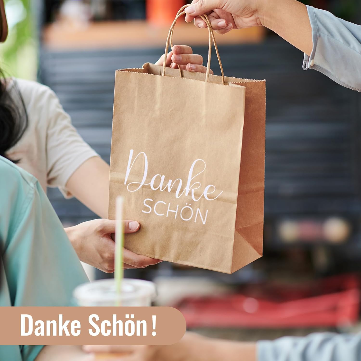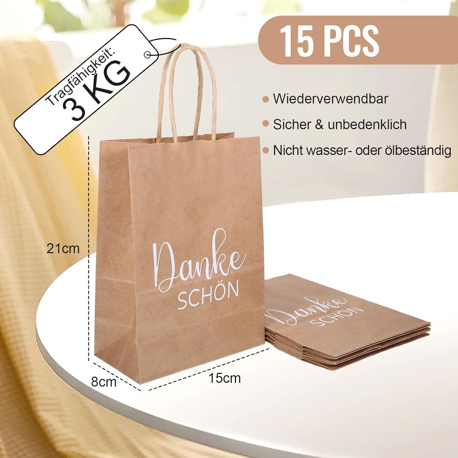 Set di alta qualità: questo set di sacchetti regalo è composto da 15 piccoli sacchetti di carta con manici (21 × 15 × 8 cm), ideali come sacchetti per feste di compleanno per bambini o per celebrazioni di ogni tipo. I robusti sacchetti di carta con manici sono perfetti come regalo per il battesimo o come souvenir festivo. Messaggio sincero con un cuore: su ogni borsa c'è l'impronta amorevole "Grazie SCHÖN", che esprime in modo affascinante il tuo apprezzamento - ideale per un piccolo regalo di ringraziamento ad amici, ospiti o come regalo per i dipendenti per occasioni speciali Qualità robusta e sostenibilità: i piccoli sacchetti di carta sono realizzati in carta kraft spessa, con fondo e manici rinforzati - saldamente incollati e resistenti agli strappi. Questo li rende ideali per un regalo a un collega o un regalo di squadra di lunga durata. Pratiche e generose nel volume: nonostante le dimensioni compatte, le piccole borse offrono spazio sufficiente per dolci, snack o articoli cosmetici. Sia come piccolo regalo per i colleghi o come regalo di ringraziamento, possono essere utilizzati in modo flessibile (questi sacchetti non sono resistenti all'olio e non sono adatti per conservare biscotti e alimenti non confezionati). Versatile per ogni occasione: sia come borsa per il compleanno dei bambini, come piccolo regalo di ringraziamento per i colleghi o come regalo per il battesimo, queste borse sono adatte per ogni occasione. Sono un regalo riconoscente per i dipendenti e arricchiscono ogni evento con un tocco personale
