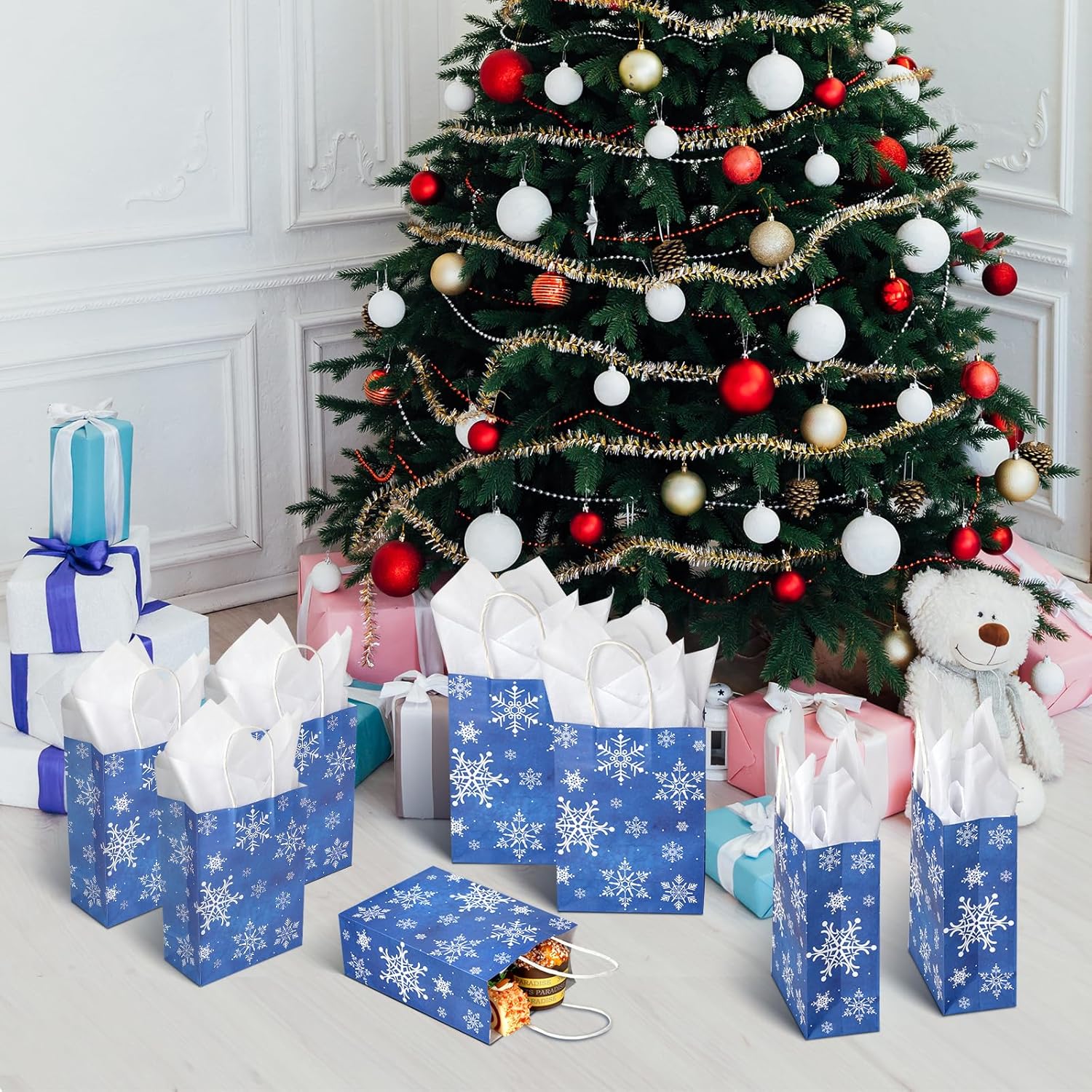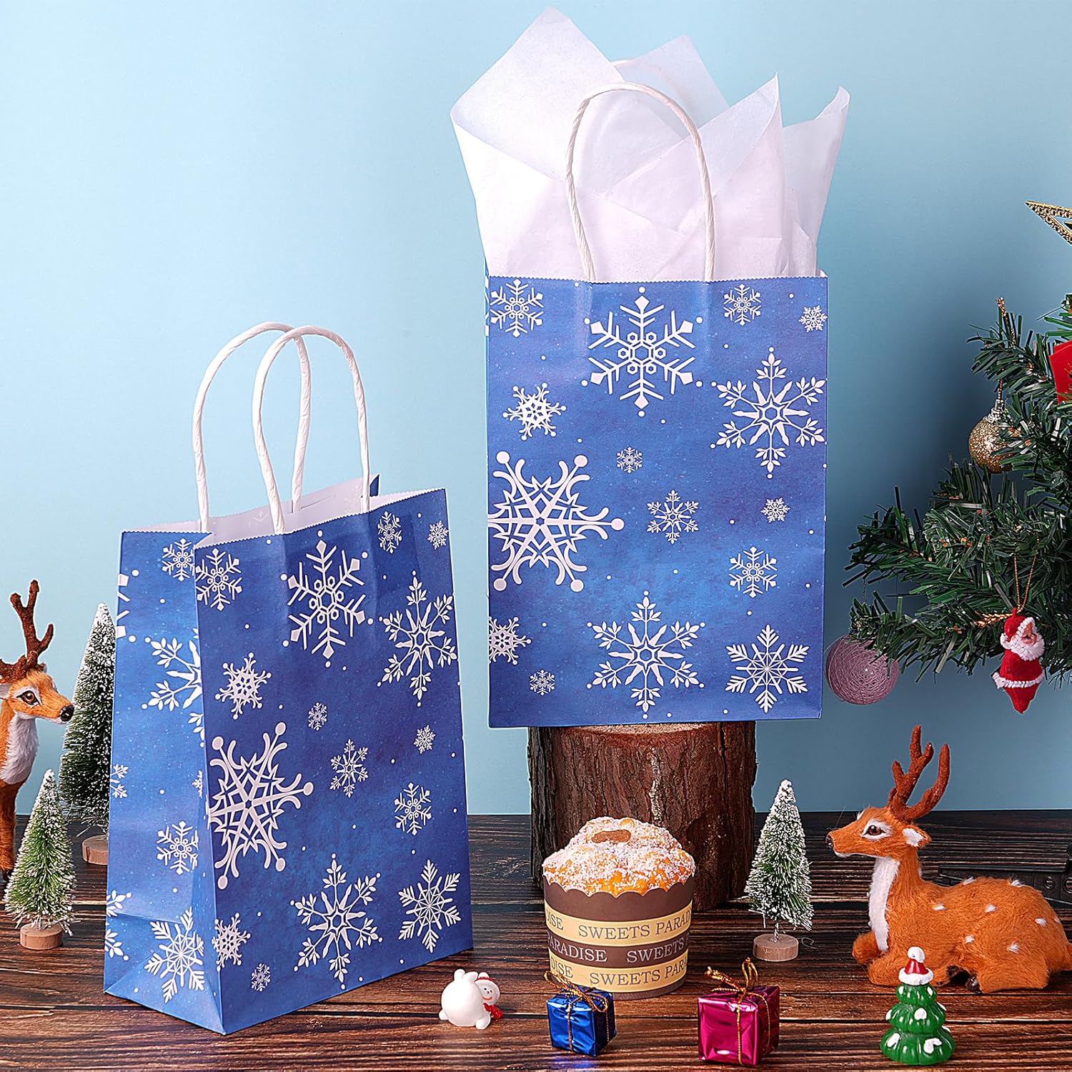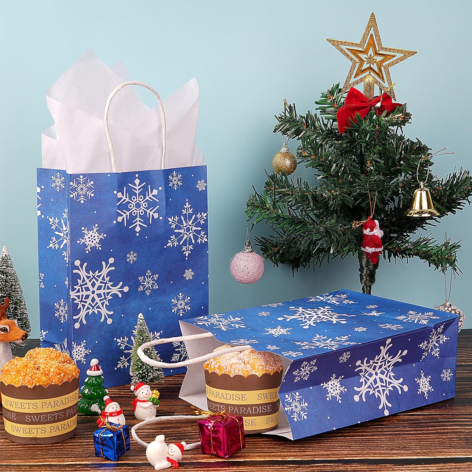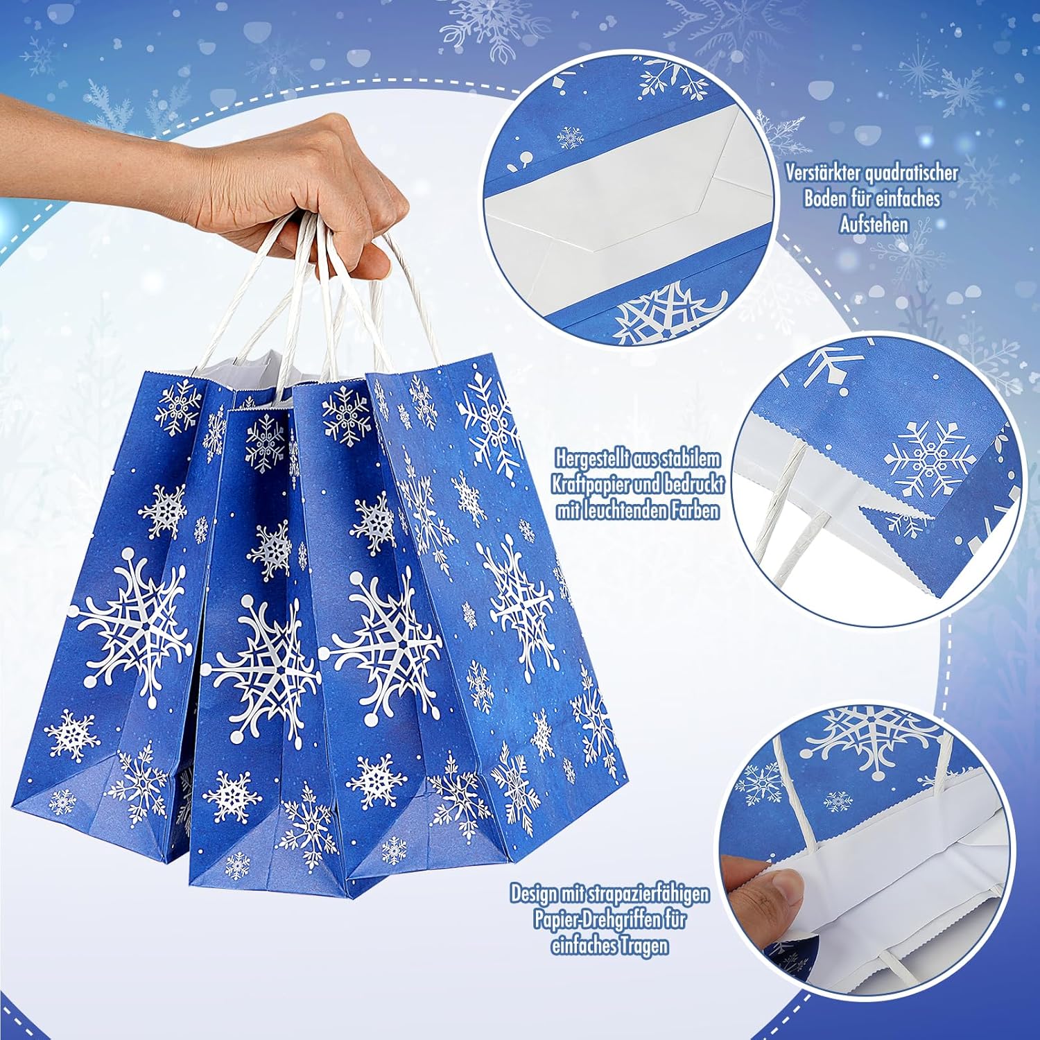 Il pacchetto include: 16 sacchetti regalo con fiocchi di neve in carta Kraft con manici in carta, dotati di 16 carte veline bianche per decorazioni, stampati fronte-retro con motivi di fiocchi di neve bianchi su sfondo blu, sufficienti per l'inverno, le vacanze di Natale. Grandi dimensioni: ogni sacchetto per le feste di Natale misura 22 x 16 x 8 cm, che può contenere vari oggetti come regali, giocattoli, caramelle e così via. Puoi riempire queste borse con amore e inviarle come regali alla tua famiglia e ai tuoi amici. Materiale durevole: realizzato in carta kraft bianca spessa di alta qualità con manici di carta ben costruiti. La base piatta e solida può reggere facilmente, ideale per chiunque possa trasportare e riutilizzare. Design con motivo a fiocco di neve: questi sacchetti di caramelle di Buon Natale sono progettati con fiocchi di neve bianchi su sfondo blu. Potete utilizzare la carta velina per decorare. Sono carini e creano un'atmosfera da festa di Natale invernale, attirano l'attenzione e rendono la tua festa impressionante. Ampia applicazione: questi resistenti sacchetti per feste con fiocchi di neve in carta kraft possono essere utilizzati come confezioni regalo per molte occasioni, come feste di Natale, feste di Capodanno, feste di compleanno, feste di matrimonio come sacchettini per bomboniere. Possono essere utilizzati per piccoli regali come regali, dolcetti, biscotti, caramelle, snack, premi, cioccolatini e altro ancora