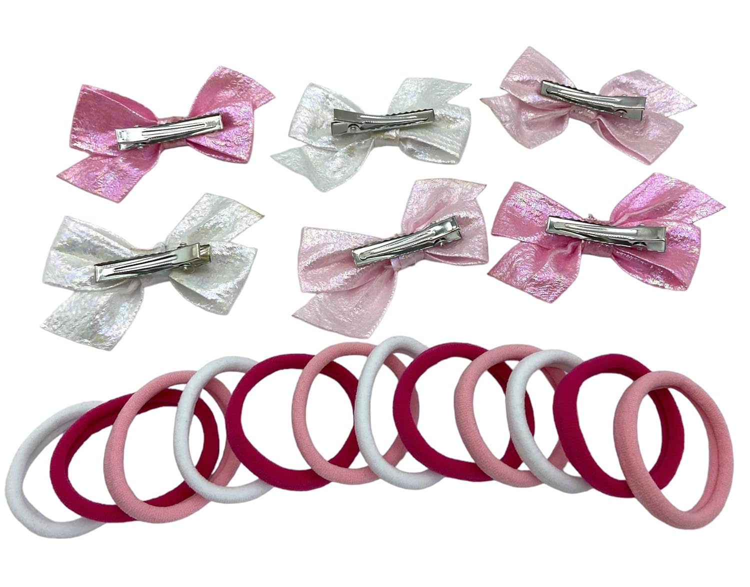 Confezione da 18 accessori per capelli per bambina Ogni confezione contiene 6 fiocchi e 12 morbidi elastici per capelli infiniti Ideale per tutti i tipi di capelli: robusti fermagli a becco in metallo sui fiocchi ed elastici per capelli morbidissimi ed elastici. Dimensioni del fiocco: 7 cm.