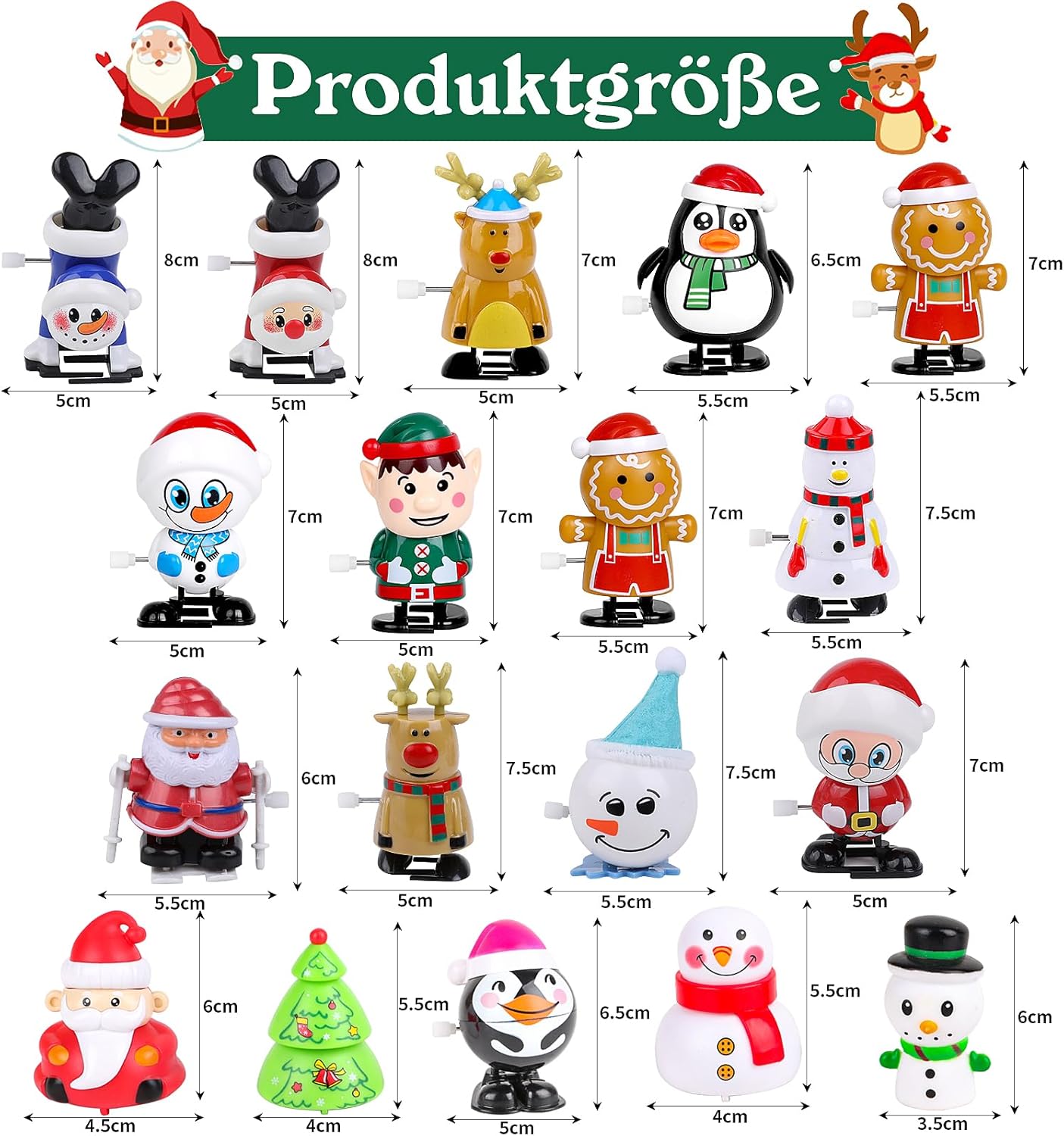 Contenuto della confezione: Totale 18 diversi tipi di giocattoli a orologeria a tema natalizio, i tuoi bambini possono condividere questi giocattoli a orologeria con gli amici. Alimentato da molle metalliche: giocattoli a carica, alimentati da una molla metallica che viene messa in tensione ruotando, classici giochi semplici e divertenti, i bambini lo adoreranno e giocheranno a lungo. Design: i giocattoli natalizi a carica includono Babbo Natale, alce, albero di Natale, omino di pan di zenzero, pupazzo di neve e altri personaggi dei cartoni animati che sono divertenti ma non spaventosi. I nostri giocattoli a carica possono eseguire varie azioni, come camminare, scuotere la testa, girare. Materiale: questi giocattoli natalizi a carica sono realizzati in plastica sicura ed ecologica, sono anallergici, non tossici e completamente sicuri per i bambini. Buon Natale: i giocattoli di Natale non sono solo giocattoli, ma anche un mezzo per trasmettere emozioni. Durante le vacanze impegnative, competere con i bambini in una gara di giocattoli primaverili è senza dubbio una calda interazione genitore-figlio. Queste semplici attività possono rafforzare il legame emotivo tra te e tuo figlio e trascorrere insieme un Natale indimenticabile.