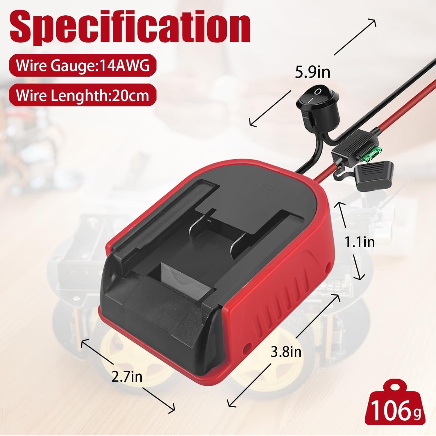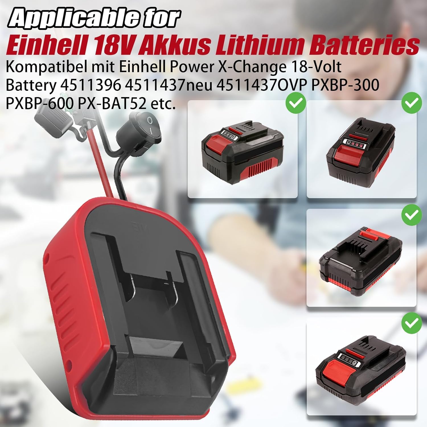 [Compatibile con batterie Einhell] Questo adattatore per batteria è compatibile con batterie Einhell 18V Power X Change [Adattatore fai da te versatile] L'adattatore fai da te per convertire le batterie in utensili elettrici viene fornito con due cavi resistenti al calore con calibro 14 e sicurezza 30 A. Puoi usarlo per aggiornare robot fatti in casa, ruote motrici, giocattoli telecomandati, bici elettriche, saldatrici portatili e altri strumenti. Gli usi dell'adattatore sono diversi e soddisfano le diverse esigenze del fai-da-te [Materiale di alta qualità] L'adattatore della batteria è realizzato in materiale ABS ecologico con funzione anticorrosione, protezione dall'umidità e dagli urti ed è adatto per uso interno ed esterno. Adattatore di alimentazione wireless autoassemblante con due cavi in silicone nero e rosso (14 AWG) [Facile da usare e rimuovere] Basta inserire l'alimentatore nello slot designato, premere l'adattatore e assicurarsi che blocchi saldamente la batteria. Per rimuovere l'adattatore dalla batteria, premere verso il basso la fibbia della batteria e rimuoverla. [Incluso] La nostra confezione include due adattatori Power Wheels con portafusibili, fusibili da 30 A e terminali di collegamento (Nota: batteria non inclusa)