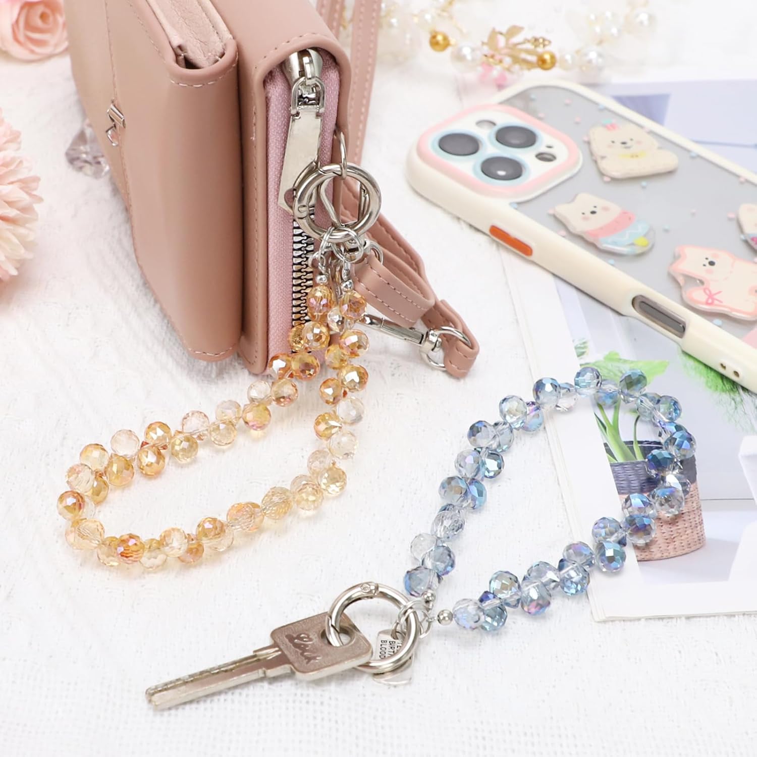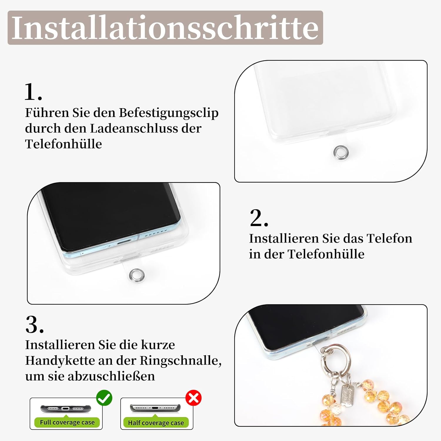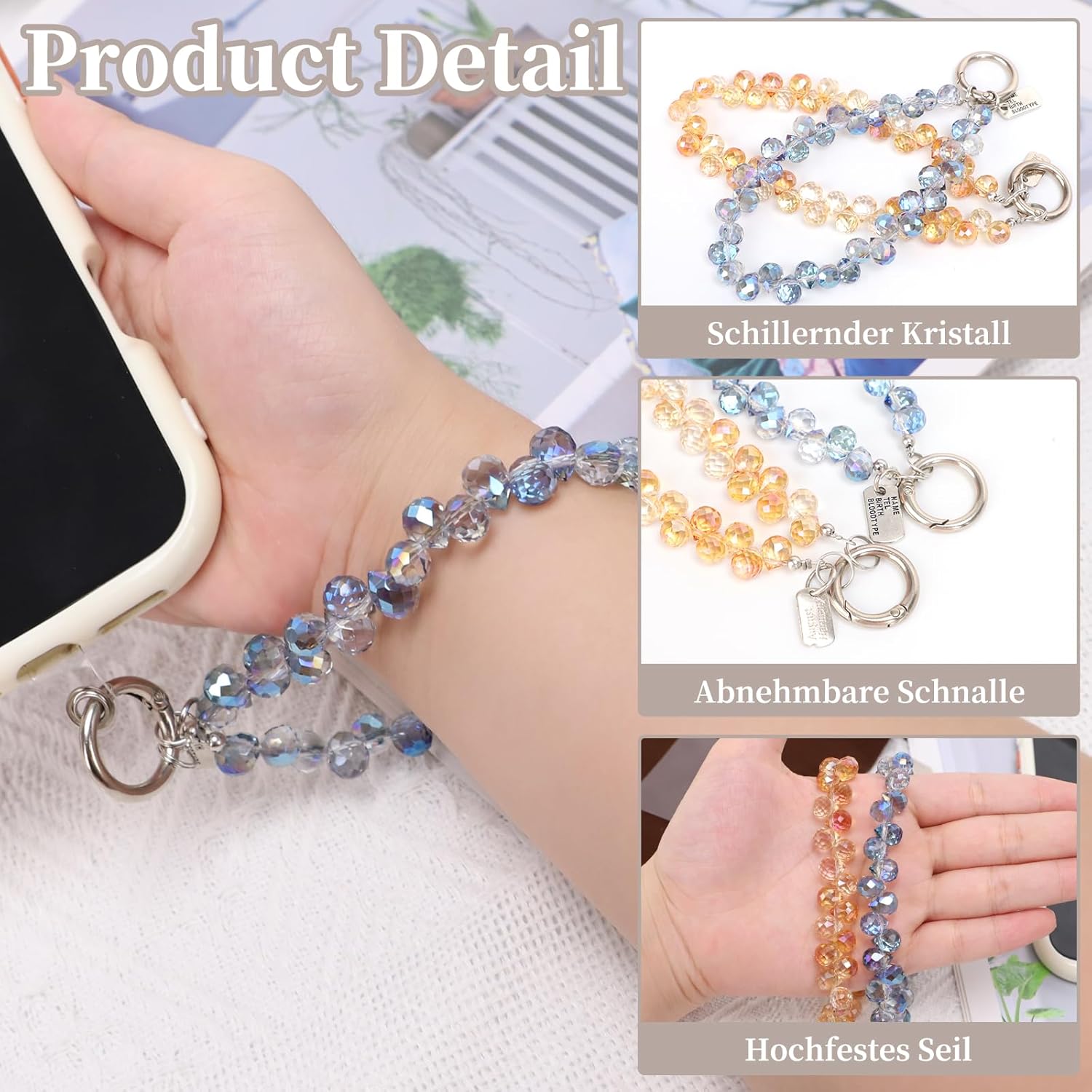 Immaginate: aprite la vostra borsa e invece di grovigli di cavi caotici accoglie la collana scintillante – si trasforma in un attimo da accessorio da polso a un elegante ciondolo per telefono Perfetto per voi se si viaggia la collana per cellulare da appendere è pratica e di lunga durata (28 cm di lunghezza). Cari 2 design invece di uno possiedono segreto del materiale: ✓ Clip in lega di zinco (inossidabile!) ✓ Perline in acrilico trasparente ✓ Filo di nylon spesso 0,3 cm. Perché vi piacerà: non cercherete mai più. Il moschettone si aggancia in pochi secondi ai passanti per cintura, alle custodie del telefono o alla tua borsa preferita. E se una clip dovesse diminuire, 4 clip di ricambio sono il vostro backup! → Elegante e pratico = il tuo nuovo eroe quotidiano!