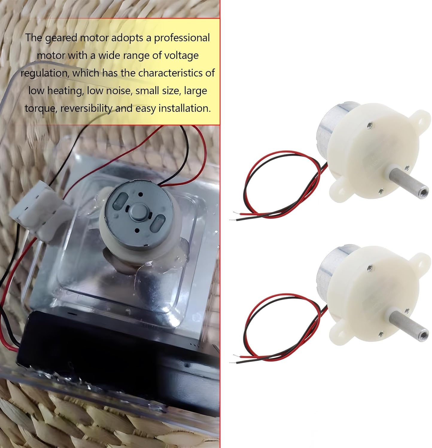 Costruzione durevole: realizzata con una robusta miscela di materiali plastici e metallici per una maggiore durata. Velocità variabile: tensione operativa di 6-9 V, offre velocità di 2,5-7,5 giri/min (a seconda della tensione). Dimensioni precise: diametro dell'albero 5 mm, lunghezza dell'albero esterno 16,3 mm e ca. Cavo di collegamento lungo 13 cm. Applicazioni versatili: perfette per giocattoli, illuminazione scenica, artigianato e espositori, garantendo un'ampia utilità. Installazione semplice: piccola, facile da trasportare e facile da installare.