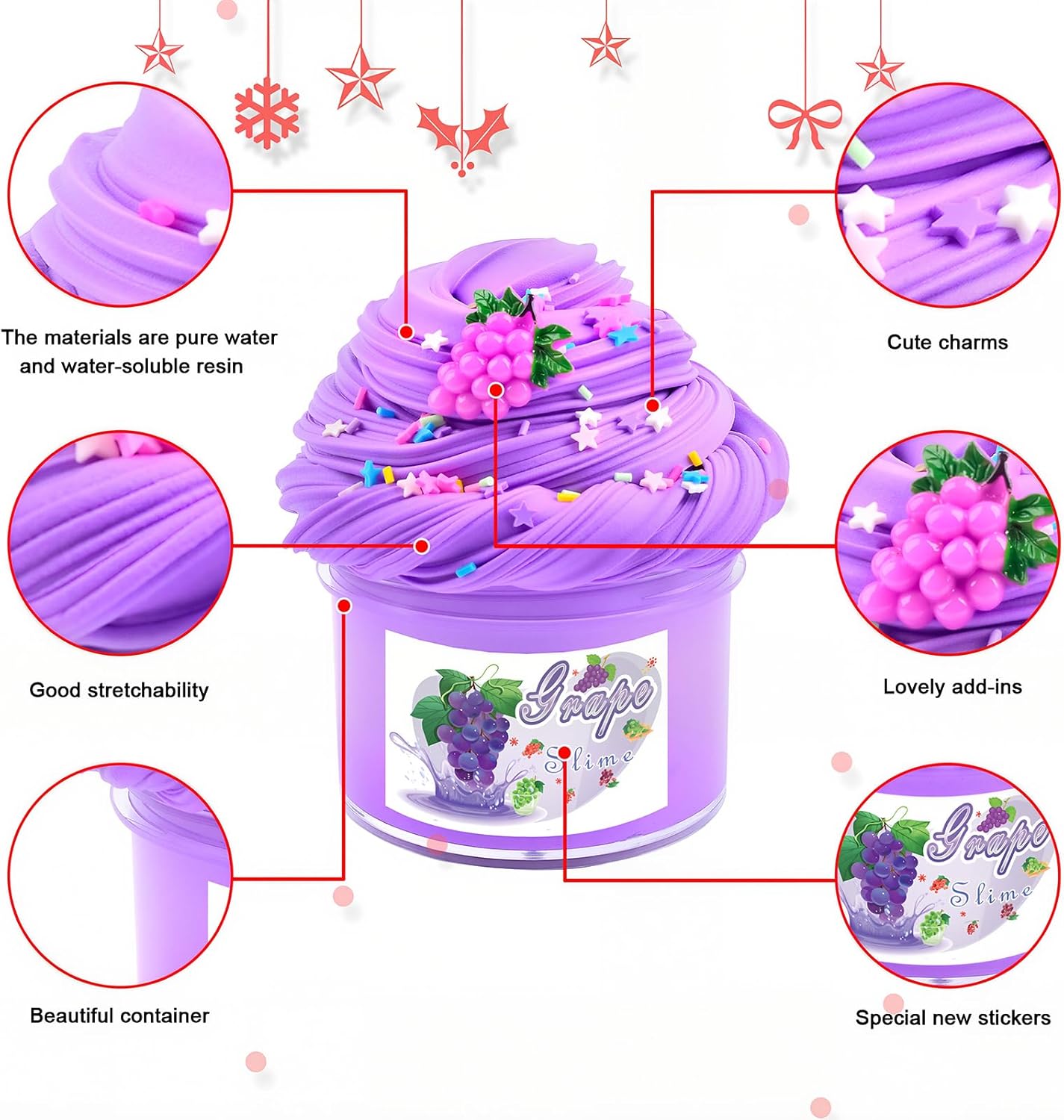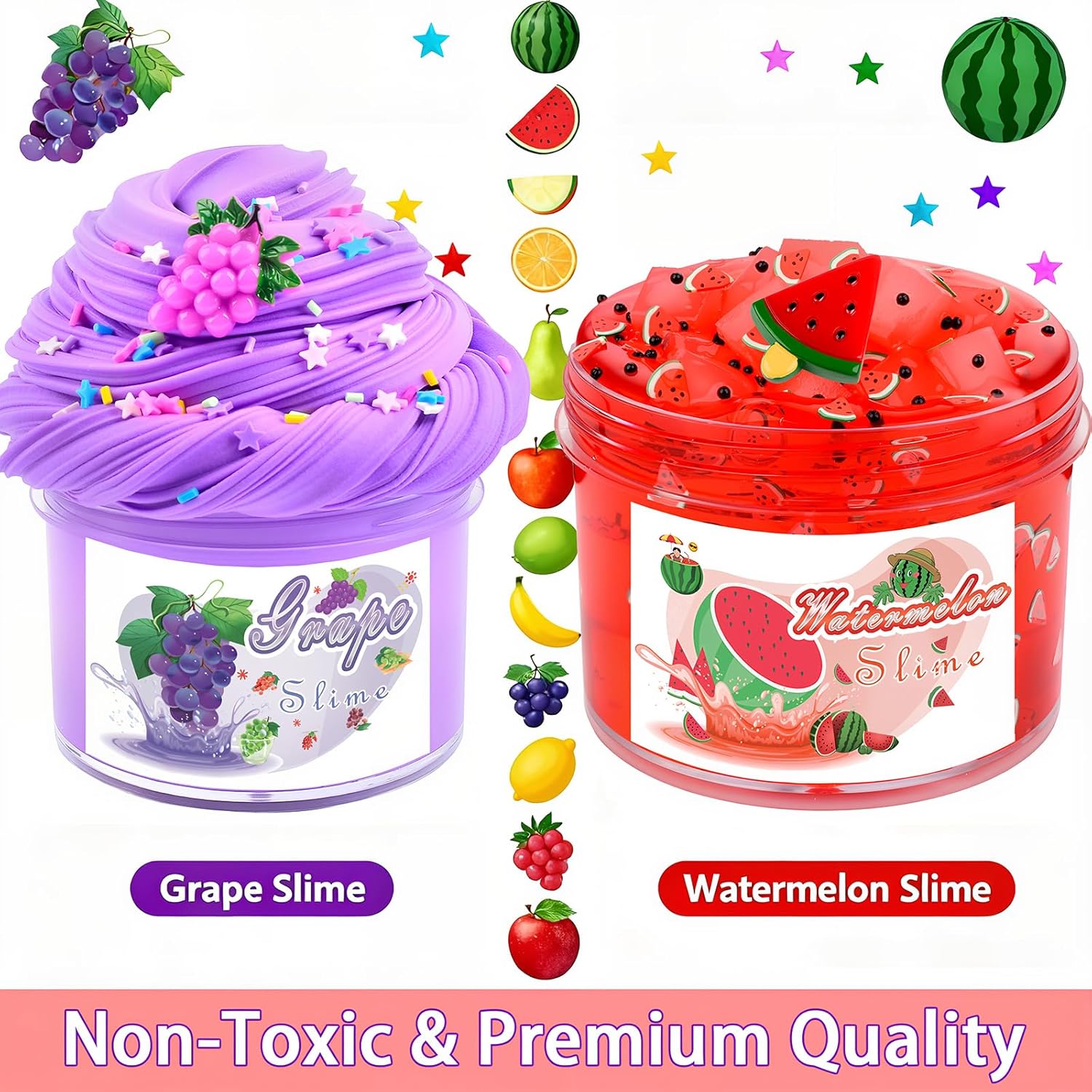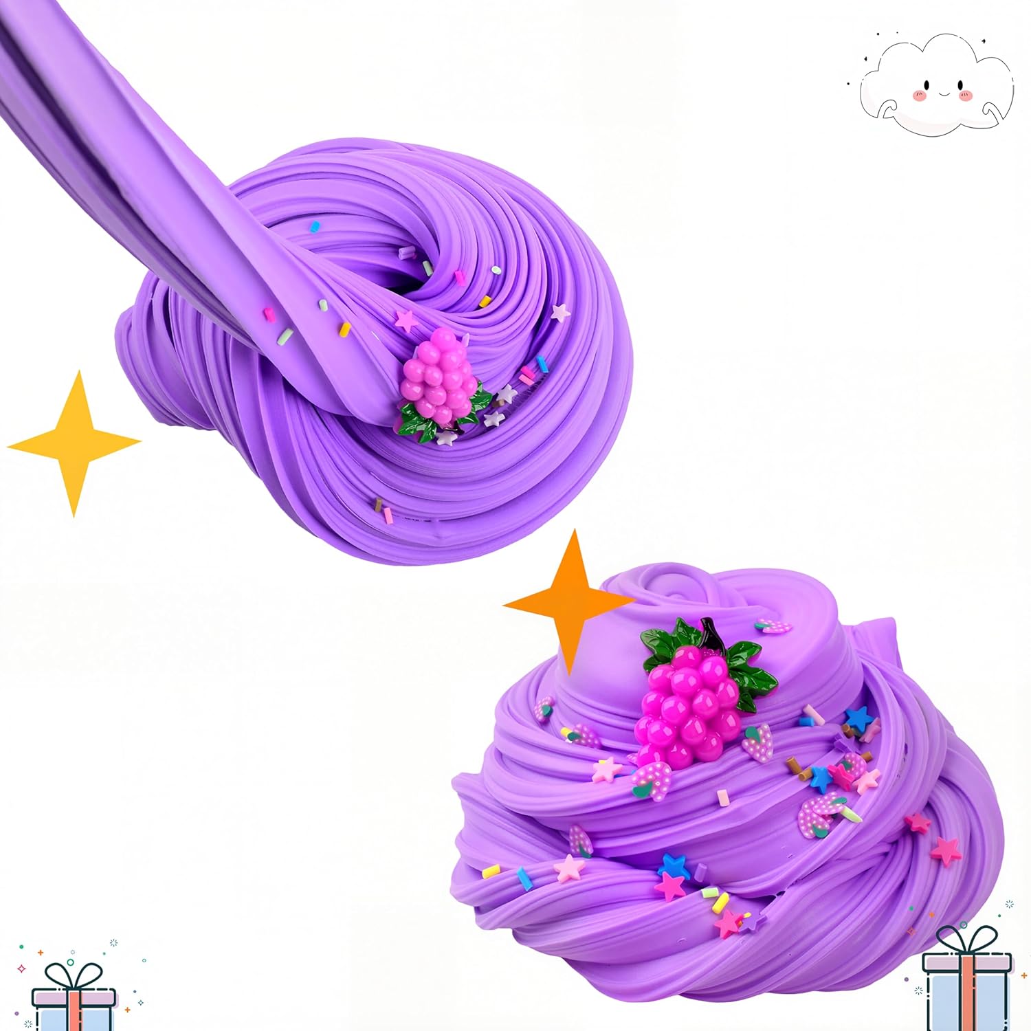 Contenuto della confezione: il kit da 2 pezzi di burro di frutta e slime trasparente è composto da 2 slime di grande capacità, con ciondoli a forma di uva, anguria e una confezione di coriandoli per uno di loro. Sicuro: lo slime di grande capacità è ASTM, certificato CPC realizzato con materiale ecologico. Non mangiare. Lavati le mani dopo aver giocato a melma. Non per bambini troppo piccoli. Morbido e antiaderente: lo slime super morbido non si attacca a mani, tappeti o pareti, facile da pulire. Si prega di rimettere lo slime nel contenitore quando non lo si utilizza. La melma si asciugherà se esposta all'aria per un periodo piuttosto lungo. Ottimo regalo: il kit per slime è molto adatto per i bambini. Il kit per la creazione di slime può sviluppare abilità pratiche e immaginazione dei bambini. Sollievo dallo stress: tira, piega, rotola e crea varie forme a piacimento. Tanti colori e opzioni, puoi fare alcuni giochi di melma molto interessanti per i bambini.Possono stare lontano dall'elettronica per molto tempo.