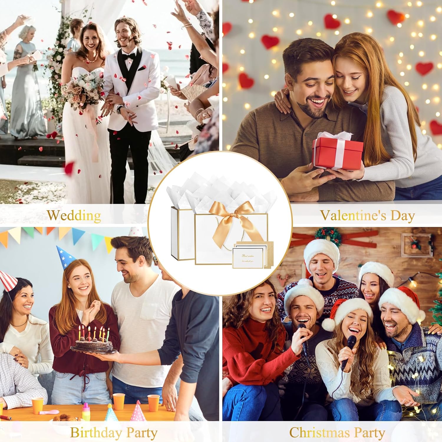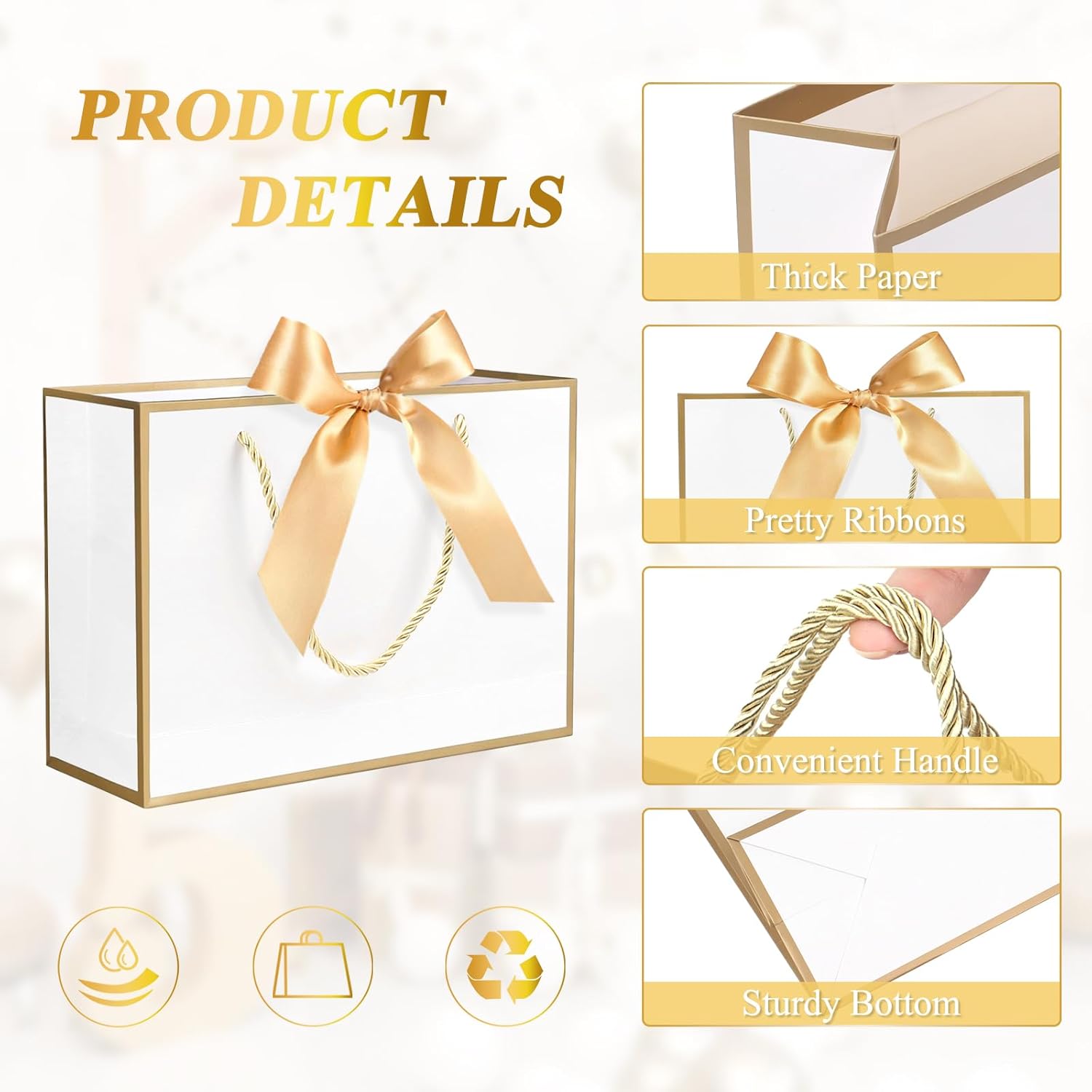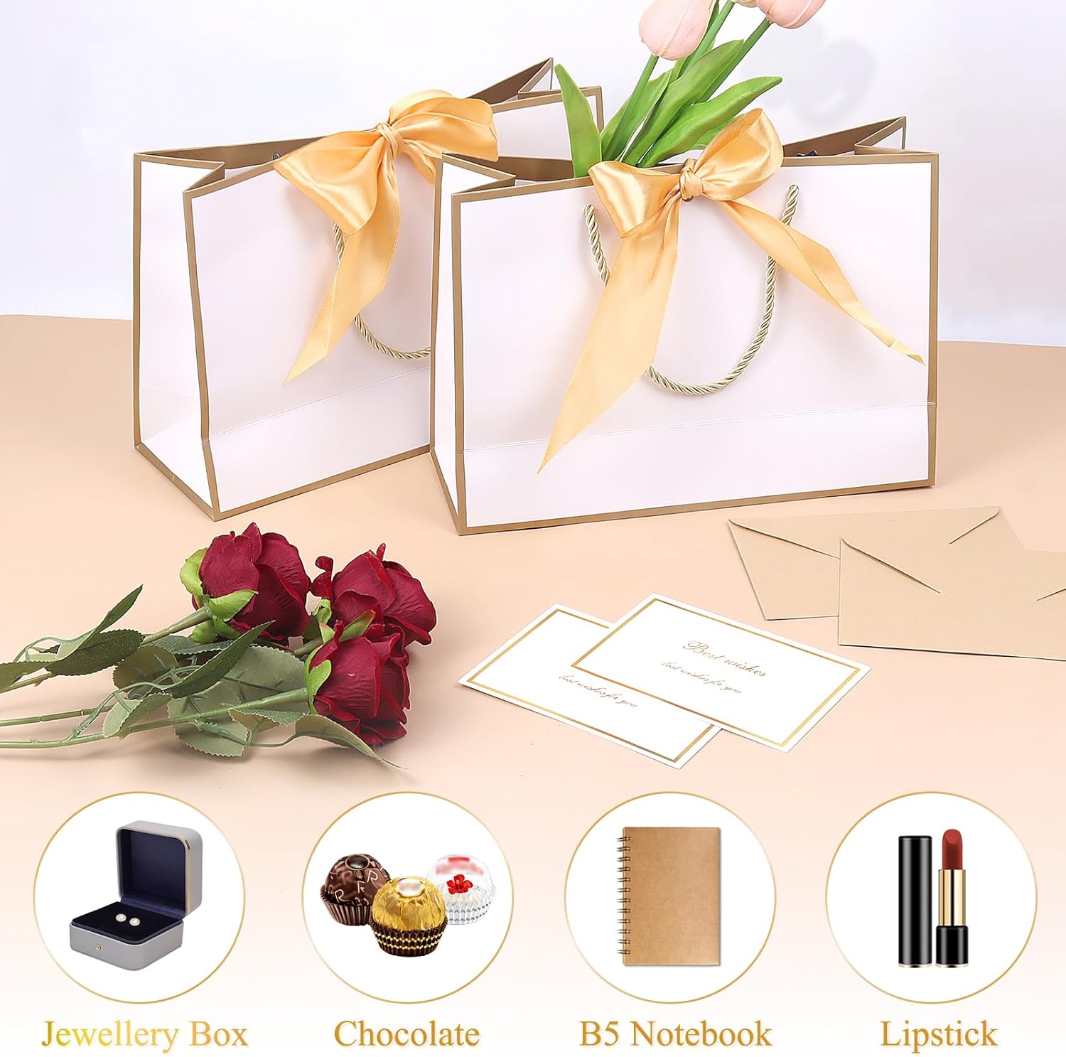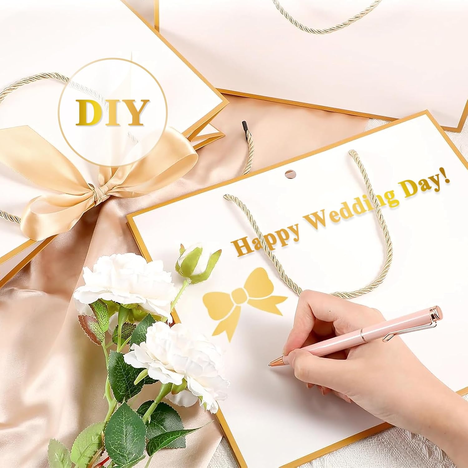 【Il prodotto include】Riceverai un set da 12 pezzi di sacchetti regalo con manici: 2 nastri, 2 buste, 2 sacchetti regalo, 2 biglietti di auguri, 4 carta velina. Il sacchetto di carta di compleanno con fiocco può essere decorato con vari fiori e congratulazioni e il destinatario sarà profondamente commosso. 【Materiale di alta qualità】 Realizzate in carta di alta qualità, le borse per feste da damigella d'onore sono atossiche e riciclabili. I sacchetti regalo hanno una buona fattura, una struttura stabile e non si rompono facilmente. 【Eleganti e attraenti】 I sacchetti di carta rosa con nastri con design a nastro sono semplici e alla moda, buste abbinate, biglietti di auguri, con carta velina decorano bellissimi bouquet e li rendono ancora più speciali. I sacchetti regalo con manico hanno un design dai colori puri, puoi disegnare dei bellissimi motivi e alcune parole per esprimere la tua opinione. Resistente e riutilizzabile: il fondo del sacchetto di carta per compleanno con fiocco è stato rinforzato per migliorare la durata e le corde dorate per la maniglia. Le borse per feste da damigella d'onore sono facili da piegare e riporre e possono essere riutilizzate a lungo. 【Versatile】 I sacchetti regalo hanno un aspetto rosa che rappresenta l'amore e il romanticismo, adatti a molte occasioni come matrimoni, feste, compleanni, ecc. I sacchetti di carta rosa con nastri sono perfetti anche per amici e parenti come regali decorativi, vestiti, libri, artigianato, ecc.