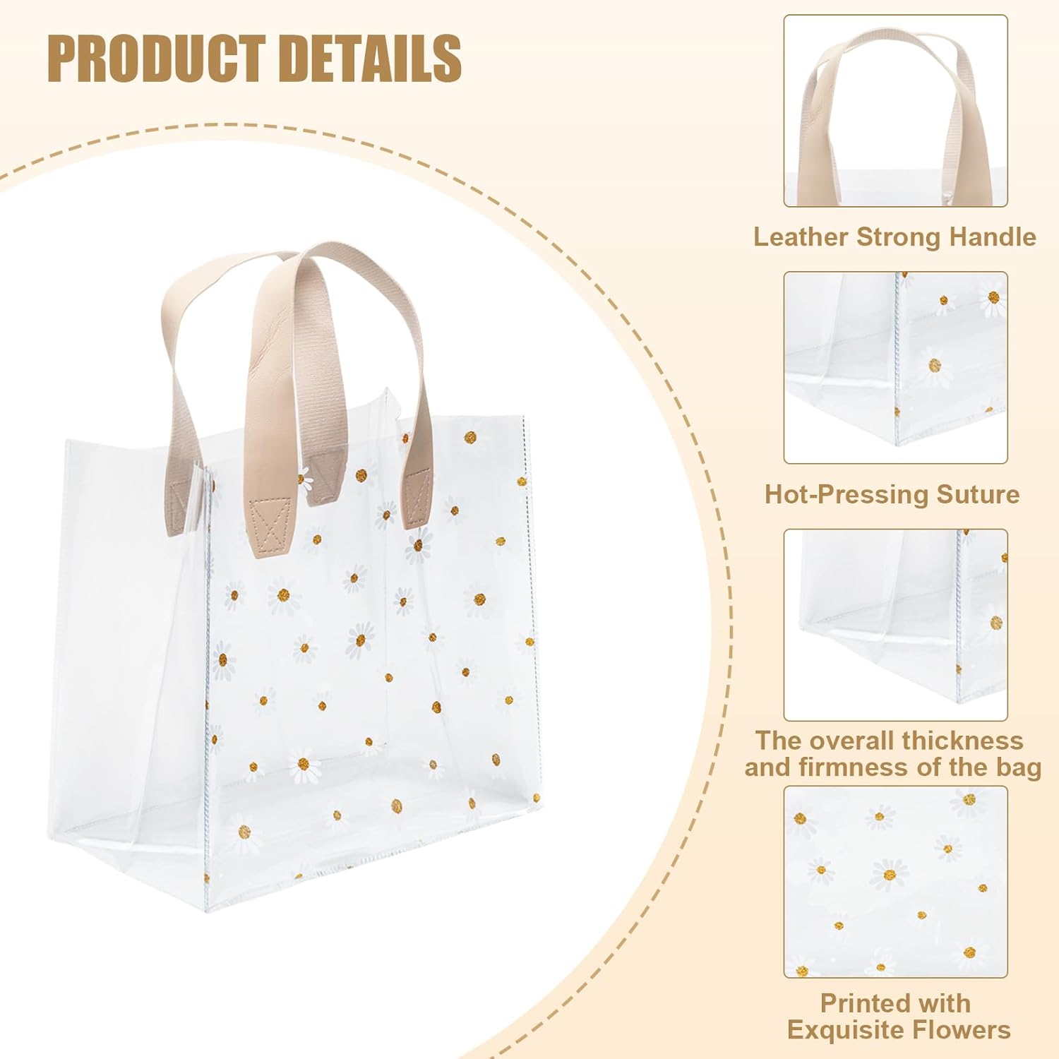 🌼【Qualità e durata premium】: Realizzata in PVC di alta qualità, questa borsa regalo trasparente è robusta, resistente agli strappi e durevole. L'impugnatura ampia e morbida offre una presa comoda per poterla trasportare facilmente senza affaticare le mani. 🎁【Design Spazioso e Pratico】: Con una capacità maggiore rispetto ai tradizionali sacchetti regalo, questa borsa può facilmente ospitare una varietà di regali, da prelibatezze a giocattoli di peluche. Perfetto per fare una bella sorpresa ai tuoi cari. ✨ 【Aspetto elegante e personalizzabile】: con un elegante design trasparente e manici color crema, questa borsa trasuda raffinatezza. Personalizzali semplicemente con nastri o ciondoli per esaltarne il fascino e rendere i tuoi regali ancora più memorabili. 🌸【Estetica affascinante e simbolica】: Decorata con un delicato motivo a margherite, questa borsa incarna l'innocenza e la bellezza da favola. Una scelta ideale per le occasioni speciali che ti permette di esprimere sentimenti caldi con stile. 🎀【Perfetto per ogni occasione】: che si tratti di compleanni, matrimoni, baby shower o celebrazioni festive, questi versatili sacchetti regalo valorizzeranno qualsiasi regalo. Ideale per confezionare snack, piccoli regali e bomboniere con un tocco di eleganza.
