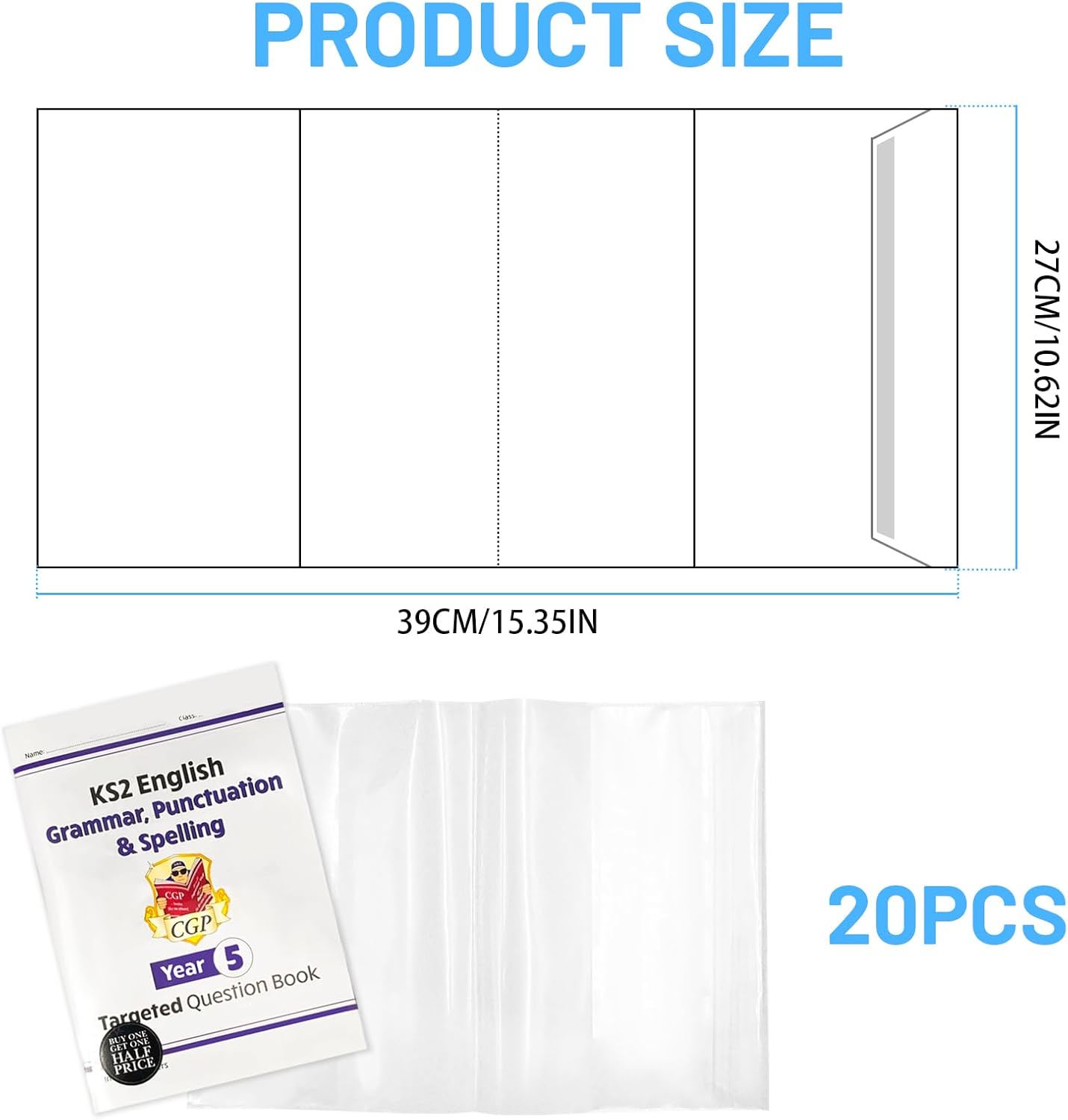 Set trasparente da 20 pezzi: questo set include 20 copertine per libri in plastica trasparente, per soddisfare le esigenze domestiche e scolastiche del Regno Unito: protegge quaderni per studenti primari/secondari, libri tascabili per la lettura a casa o cartelle di lavoro per l'università. Ogni copertura pesa 140 g, con un design sottile che si adatta facilmente agli zaini della scuola senza aggiungere ulteriore ingombro. Impermeabili e lavabili: realizzate in plastica resistente, queste copertine per libri sono impermeabili, proteggono i libri da fuoriuscite accidentali (ad esempio, acqua, latte) comuni nelle mense scolastiche del Regno Unito o nelle aree di studio domestiche. La superficie liscia è lavabile con un panno umido, rimuovendo facilmente segni di matita o sporco per mantenere i libri puliti. Dimensioni: misura 15,16 x 10,47 cm (convertito da 385 x 266 mm), le copertine si adattano a libri tascabili A4 piegati (21 x 29,5 cm, dimensioni standard del libro scolastico del Regno Unito). Una piccola tolleranza (2-3 mm) ai bordi accoglie le cuciture delle alette, garantendo una perfetta aderenza senza angoli allentati. Protezione da polvere e graffi: queste copertine in plastica creano una barriera contro la polvere (comune negli armadietti scolastici del Regno Unito o negli scaffali domestici) e graffi dalle cerniere delle borse. Aiutano a prolungare la vita dei libri, riducendo la necessità di sostituire frequentemente quaderni o libri tascabili usurati. Facile da applicare e riporre: il design piatto consente di avvolgere facilmente i libri, senza passaggi di piegatura complessi, adatto per gli studenti da utilizzare in modo indipendente. Quando non in uso, le coperture si impilano ordinatamente in cassetti o scatole (comuni nelle aule del Regno Unito), risparmiando spazio ed evitando disordine.