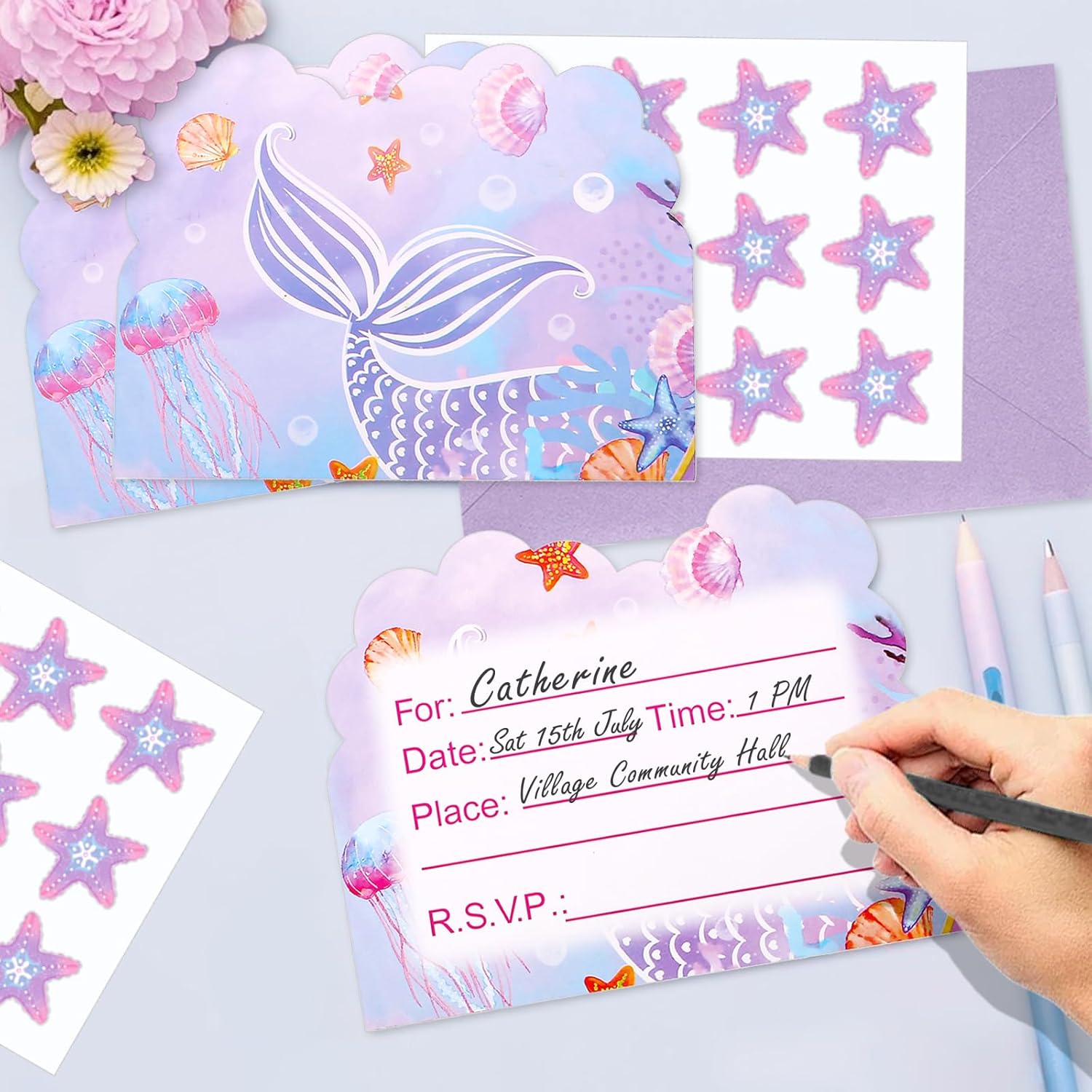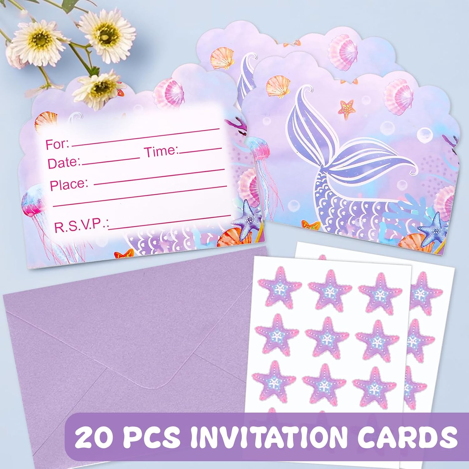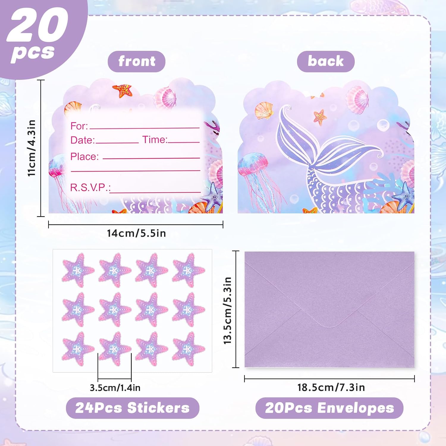 Design sirena: un invito per feste a sirena si adatta perfettamente alle feste a tema. I colori vivaci e il simpatico motivo esclusivo attirano bambini sia ragazze che ragazzi. Vai e invita i tuoi amici alla tua festa da sogno! Biglietto di invito di alta qualità: il biglietto stampato su entrambi i lati è realizzato in carta ecologica di alta qualità e il motivo è chiaro e vivace. Facile da scrivere con qualsiasi penna. Dimensioni adatte: confezione da 20 inviti per feste stampati su entrambi i lati (140 x 110 mm) con 20 buste (185 x 135 mm) e 24 adesivi (35 mm). Spazio sufficiente per scrivere i dettagli della festa, tra cui data, indirizzo e informazioni di risposta. Contenuto della confezione: la confezione contiene 20 biglietti di invito per feste a sirena e 20 buste, insieme a 24 adesivi a stella marina. Quantità sufficiente per invitare gli amici e organizzare una festa speciale. Molteplici occasioni: questo biglietto di invito può essere utilizzato in una varietà di occasioni come feste a tema, feste di compleanno, matrimoni, feste di scambio regalo, feste di laurea, feste a sorpresa ed eventi festivi.