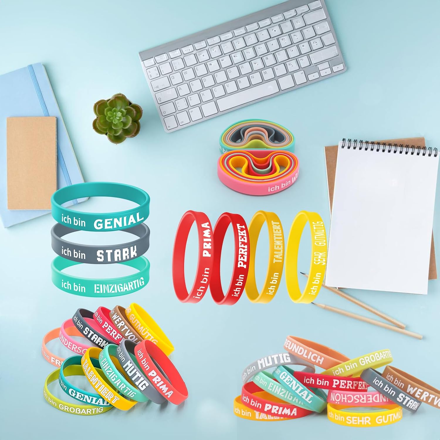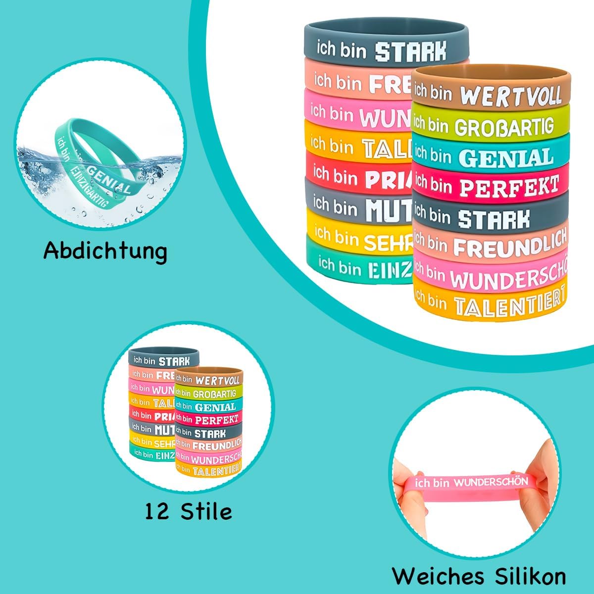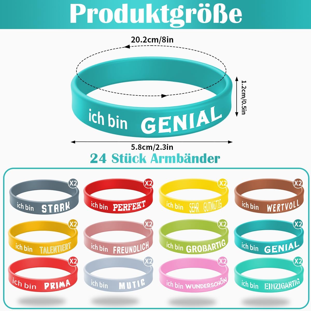 【Contenuto della confezione】Riceverai 24 braccialetti di gomma stimolanti in 12 stili. Ogni braccialetto contiene detti ispiratori tedeschi per motivarti a rimanere costante. Puoi mescolare e abbinare i braccialetti in silicone come preferisci o condividerli con la tua famiglia e i tuoi amici per far sentire loro il potere della motivazione. 【Materiale di alta qualità】 Il braccialetto in silicone personalizzato è realizzato in silicone di alta qualità, morbido e inodore, comodo da indossare. Il braccialetto ha una buona elasticità senza limitare i movimenti del polso. 【Proverbi motivazionali】 Il braccialetto in silicone è stampato con detti ispiratori chiari e facili da leggere. Non solo ha un bell'aspetto, ma promuove anche un atteggiamento positivo e sano nei confronti della vita. Questi detti possono rafforzare la tua motivazione interiore e guidarti coraggiosamente attraverso difficoltà e sfide. 【Ampiamente usato】 I braccialetti motivazionali tedeschi possono essere indossati in diversi ambienti, al lavoro, a scuola o all'aperto. Fungono da motivatore continuo e ti accompagnano attraverso la vita in modo positivo e stimolante. Questi braccialetti sono adatti a chiunque abbia bisogno di motivazione e ispirazione. 【Regalo ideale】 Questo braccialetto per bambini è un'idea regalo unica e significativa. È adatto sia per uso personale che come regalo per un amico. Può essere utilizzato anche come souvenir o bomboniera durante le feste dei bambini.