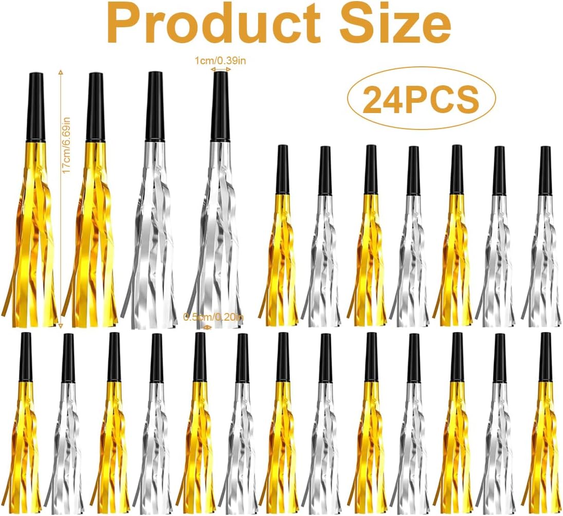 🎉La confezione include: questa confezione viene fornita con 24 pezzi di strass dorati metallizzati con frange per feste, quantità adeguata e colori classici per decorare vari tipi di feste. 🎉Creatore di rumore per feste: questi fischietti musicali possono vibrare furiosamente e rapidamente, utili per formare suoni interessanti e un effetto visivo gioioso, porteranno un'atmosfera divertente a feste di strada, giochi sportivi, eventi di riunione, attività scolastiche e molto altro ancora. 🎉Dimensioni: ogni fischietto per feste misura circa 10 x 170 mm, dimensioni adeguate che possono essere facilmente tenute dalla maggior parte dei bambini, leggere e portatili da portare con sé. 🎉Piacevole da suonare: le nappe in lamina di questi colpi musicali vibrano furiosamente e rapidamente, creando suoni interessanti e un effetto visivo gioioso, possono portare più divertimento a feste di strada, giochi sportivi, eventi di riunione, attività scolastiche e così via. 🎉Ampia gamma di applicazioni: i nostri divertenti rumorosi per feste possono produrre suoni divertenti e allegri e ravvivare l'atmosfera della festa, possono essere applicati per decorare feste per bambini, compleanni, baby shower, addio al nubilato, Capodanno, celebrazioni e altre feste.