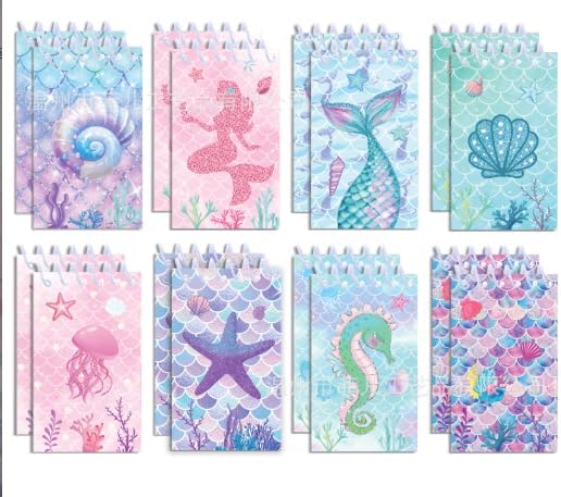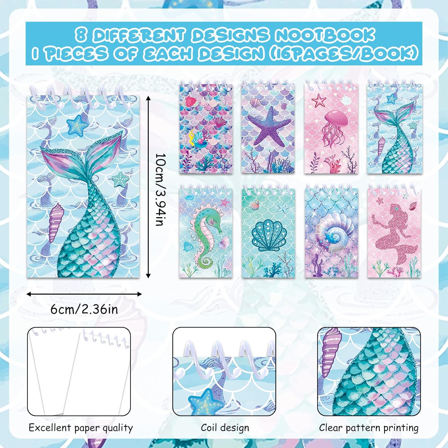 Mini quaderni con animali marini: questo mini quaderno contiene 8 diversi quaderni a spirale con disegni di sirene e 16 penne colorate a forma di sirena in quattro colori. Perfetto come regalo o bomboniera per qualsiasi festa a tema sirena. La carta spessa e di alta qualità garantisce un divertimento duraturo e rende il set un assoluto highlight per feste di compleanno, eventi scolastici o baby shower. Blocchi a spirale con design a sirena: ogni mini taccuino misura circa 6 x 10 cm, la penna 18 x 4 cm. Sono quindi leggeri e maneggevoli, scivolano in borse, zaini o borsette. I quaderni contengono 16 pagine bianche da scrivere o colorare, ideali per bambini creativi e piccole avventure, a casa, in viaggio o a scuola. REGALI PER FESTE A SIRENA DI QUALITÀ PREMIUM: Realizzati in carta robusta e spessa con robusti fili a spirale, i quaderni possono resistere a un uso frequente. Le penne a sirena sono progettate ergonomicamente e sono perfette per le mani dei più piccoli. In questo modo offrono un comfort di scrittura sicuro e piacevole, ideale come regalo per le feste o per la vita scolastica quotidiana. Disegni di sirene carini e vivaci: ogni taccuino presenta disegni di sirene colorati con scaglie, stelle marine, conchiglie, cavallucci marini e alghe. I mini quaderni con illustrazioni allegre e dettagliate portano il magico fascino sottomarino a ogni festa e fanno brillare gli occhi dei bambini con gli appassionati di sirene di tutte le età. PERFETTO PER TUTTE LE FESTE E I PREMI: Che si tratti di un compleanno con sirena, di un baby shower, di un premio scolastico o di una festa a tema marino, questo set è sempre adatto. La combinazione di 24 quaderni e penne è ideale come bomboniera, riempitivo per regali o piccola ricompensa che motiva ed entusiasma i bambini. Divertimento colorato per tutte le occasioni
