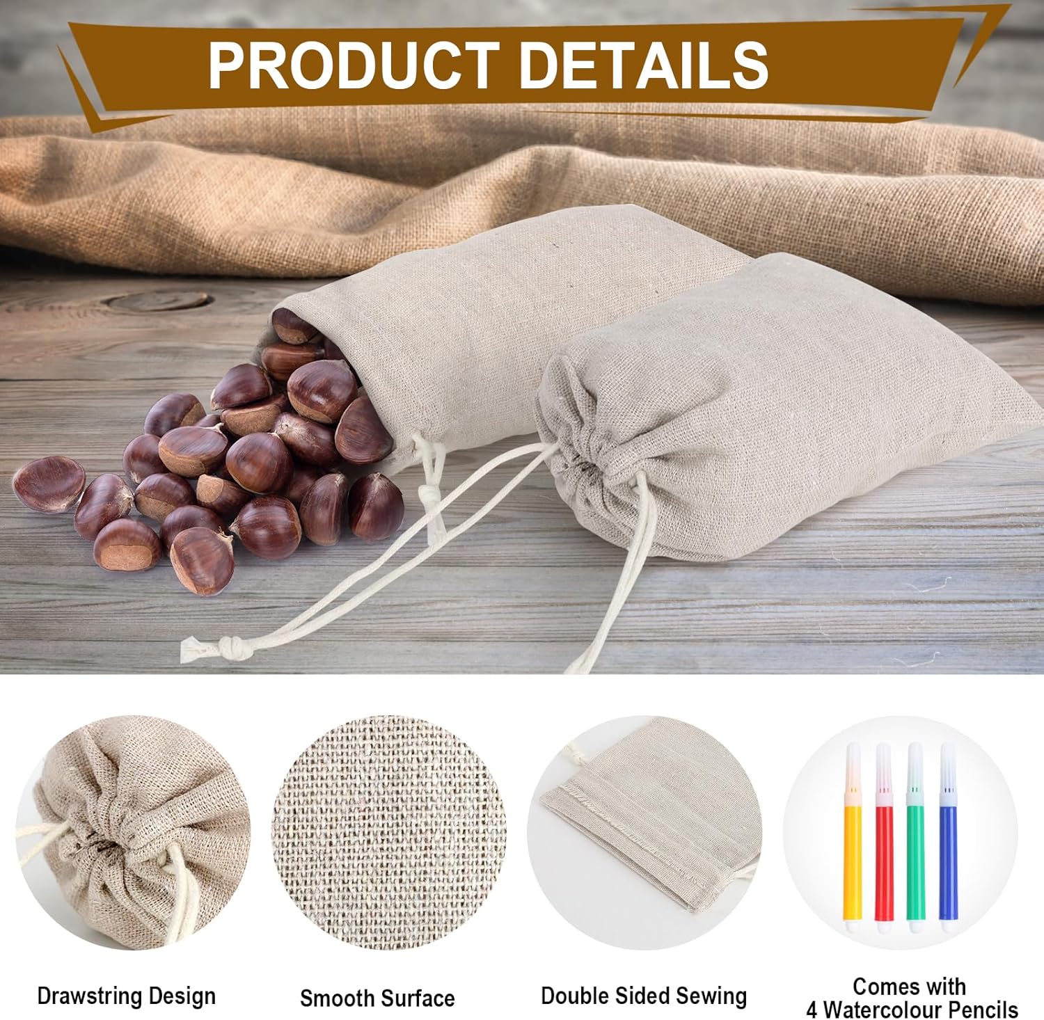 【Accessori pratici】 Questa confezione contiene 24 sacchetti di cotone, ogni sacchetto con cordoncino in cotone misura 10 x 8 cm e 4 penne ad acquerello di colori diversi. I piccoli sacchetti di iuta hanno una quantità sufficiente per l'uso quotidiano o la sostituzione, sono perfetti per riporre piccoli oggetti. 【Materiale naturale】 Il nostro sacchetto di riempimento in cotone è realizzato in cotone naturale di alta qualità, morbido e delicato nella consistenza, leggero e resistente, durevole, può sopportare una certa quantità di peso e tensione. Questa borsa regalo con coulisse ha una buona permeabilità all'aria e assorbimento dell'umidità e può mantenere asciutto il contenuto della borsa. 【Design con coulisse】La nostra borsa in tela di iuta ha un cordoncino che ti consente di aprire o chiudere la borsa con un solo tiro. Con il cordoncino, la dimensione di apertura della piccola borsa in tessuto può essere regolata in modo flessibile per evitare che gli oggetti cadano e garantire una conservazione sicura degli oggetti. 【Fai da te fatto a mano】 Le nostre borse in cotone possono essere realizzate a mano e puoi progettare modelli secondo le tue idee, rendendole un'opera d'arte personale. I bambini possono apprendere abilità artigianali e sviluppare abilità pratiche e creatività realizzando sacchetti di cotone da riempire. 【Ampia gamma di usi】 Questa piccola borsa di iuta può essere utilizzata come borsa per il trucco, borsetta, custodia, ecc. Per ordinare tutti i tipi di piccoli oggetti. La nostra borsa regalo con coulisse è adatta anche per varie festività e occasioni come San Valentino, Natale, Ringraziamento, Matrimoni, Capodanno, ecc.