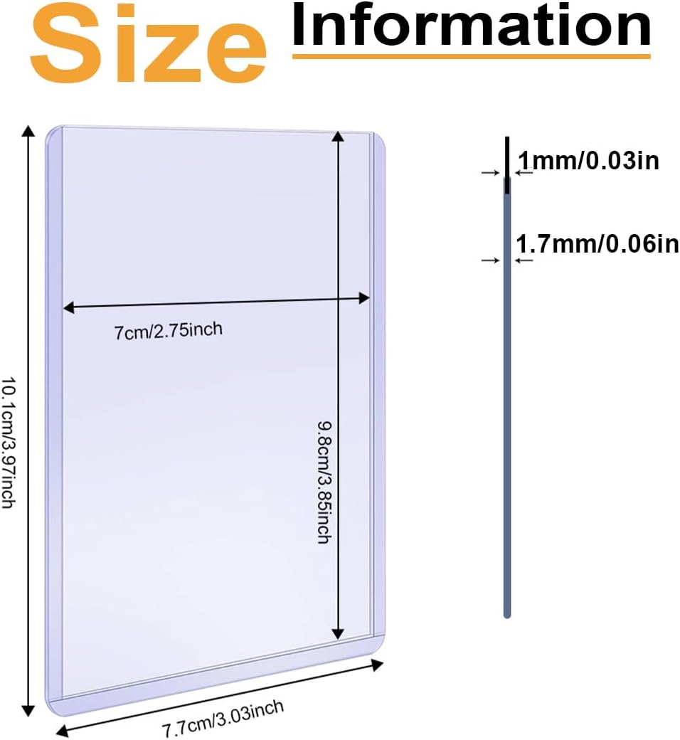 Materiale di alta qualità: le nostre custodie protettive per carte sono realizzate in materiale PP di alta qualità, inodore e altamente trasparente. Sono resistenti ai graffi, durevoli e offrono una protezione ottimale per le tue carte. Ideale per chi vuole mantenere le proprie carte collezionabili in condizioni ottimali Facile da usare: grazie al design aperto, le carte possono essere inserite e rimosse facilmente senza piegare gli angoli. La maggiore trasparenza ti consente di organizzare e ammirare le tue carte senza doverle estrarre Protezione contro lo sporco: le nostre custodie proteggono efficacemente da polvere, macchie e graffi. Mantengono i tuoi biglietti da visita puliti e intatti, impedendone il danneggiamento o lo sbiadimento. Perfetto per la conservazione a lungo termine delle tue carte Compatibilità versatile: queste custodie protettive sono compatibili con tutte le carte di dimensioni standard, tra cui carte collezionabili, carte da gioco, carte sportive e molto altro. Ideale per Yu-Gi-Oh, carte magiche, poker e molti altri giochi di carte Set completo: la confezione contiene 50 bustine trasparenti per carte collezionabili che misurano 77 x 101 mm. La dimensione interna è 70 x 98 mm. Un regalo ideale per i collezionisti di carte, sia maschi che femmine, che vogliono proteggere la propria collezione