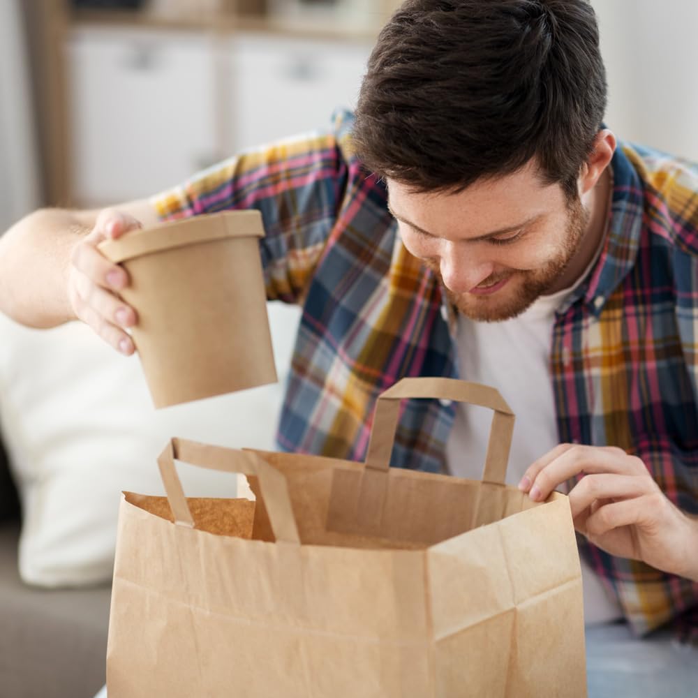CARTA KRAFT, CON MANICI PIATTI ALL'INTERNO: Realizzata in robusta carta kraft con robuste maniglie piatte per un trasporto comodo, ideale per lo shopping sostenibile. MOLTO STABILE, CAPACITÀ DI CARICO FINO A 3KG: La borsa è caratterizzata dalla sua elevata stabilità e può trasportare in sicurezza fino a 3 kg, perfetta per l'uso quotidiano. ECOLOGICO, RICICLABILE E COMPOSTABILE: realizzato con materiale ecologico che è riciclabile e compostabile, proteggendo così l'ambiente. FORMA ALTA E SOTTILE: il design dalla forma alta e sottile è pratico e poco ingombrante. SENZA STAMPA: La borsa arriva senza alcuna stampa, il che la rende versatile e adatta a varie applicazioni.