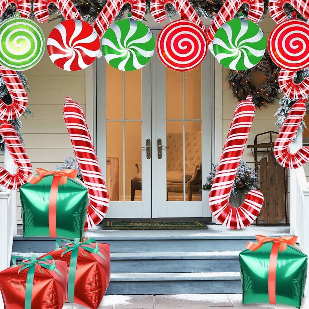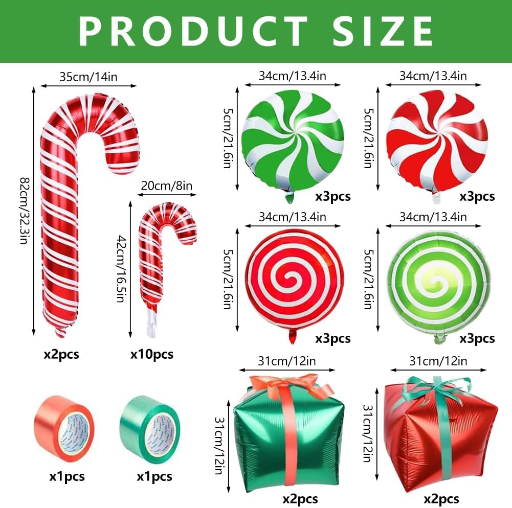 【Kit di palloncini natalizi assortiti】 Riceverai 28 pezzi di palloncini natalizi in diversi stili e dimensioni: 12 palloncini lecca-lecca gonfiabili da 34 cm, 4 palloncini in confezione regalo, 2 palloncini con bastoncino di zucchero da 82 cm, 10 palloncini con bastoncino di zucchero da 42 cm e 2 rotoli di nastri, quantità e stili sufficienti per arricchire la decorazione della tua festa di Natale. 【Decorazioni perfette per le feste di Natale】 I nostri palloncini per le feste di Natale sono disponibili nei classici colori natalizi rosso e verde, disegnati a forma di bastoncino di zucchero, lecca-lecca e scatole regalo, che sono meravigliose aggiunte alle decorazioni delle feste di Natale per aggiungere un'atmosfera natalizia alla tua festa. 【Materiale di alta qualità】 Questi palloncini in foil per feste di Natale sono realizzati in foglio di alluminio di alta qualità e materiale in lattice, che è durevole e più spesso, non tossico, non facile da rompere, ben sigillato per mantenere bene l'aria e l'elio. 【Ampie applicazioni】 I simpatici palloncini natalizi gonfiabili con bastoncini di zucchero sono la decorazione perfetta per feste di Natale, feste per bambini, centri commerciali, uffici, scuole, ecc. Puoi appendere questi palloncini natalizi al soffitto, alle pareti e alle finestre o usarli come decorazioni da tavola per le feste di Natale per rendere la tua festa più bella e romantica. Facile da usare: le decorazioni natalizie gonfiabili possono essere facilmente gonfiate con una cannuccia o una pompa. Questi robusti palloncini natalizi sono riutilizzabili, basta una cannuccia per far uscire l'aria e conservarli per il prossimo utilizzo. Si prega di non gonfiare troppo il palloncino. Una volta gonfiato il palloncino, evitare scottature, surriscaldamento, oggetti appuntiti e attriti eccessivi.