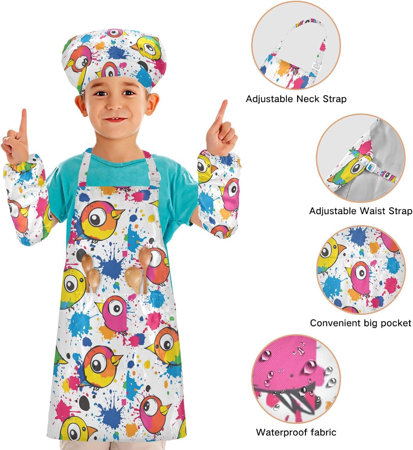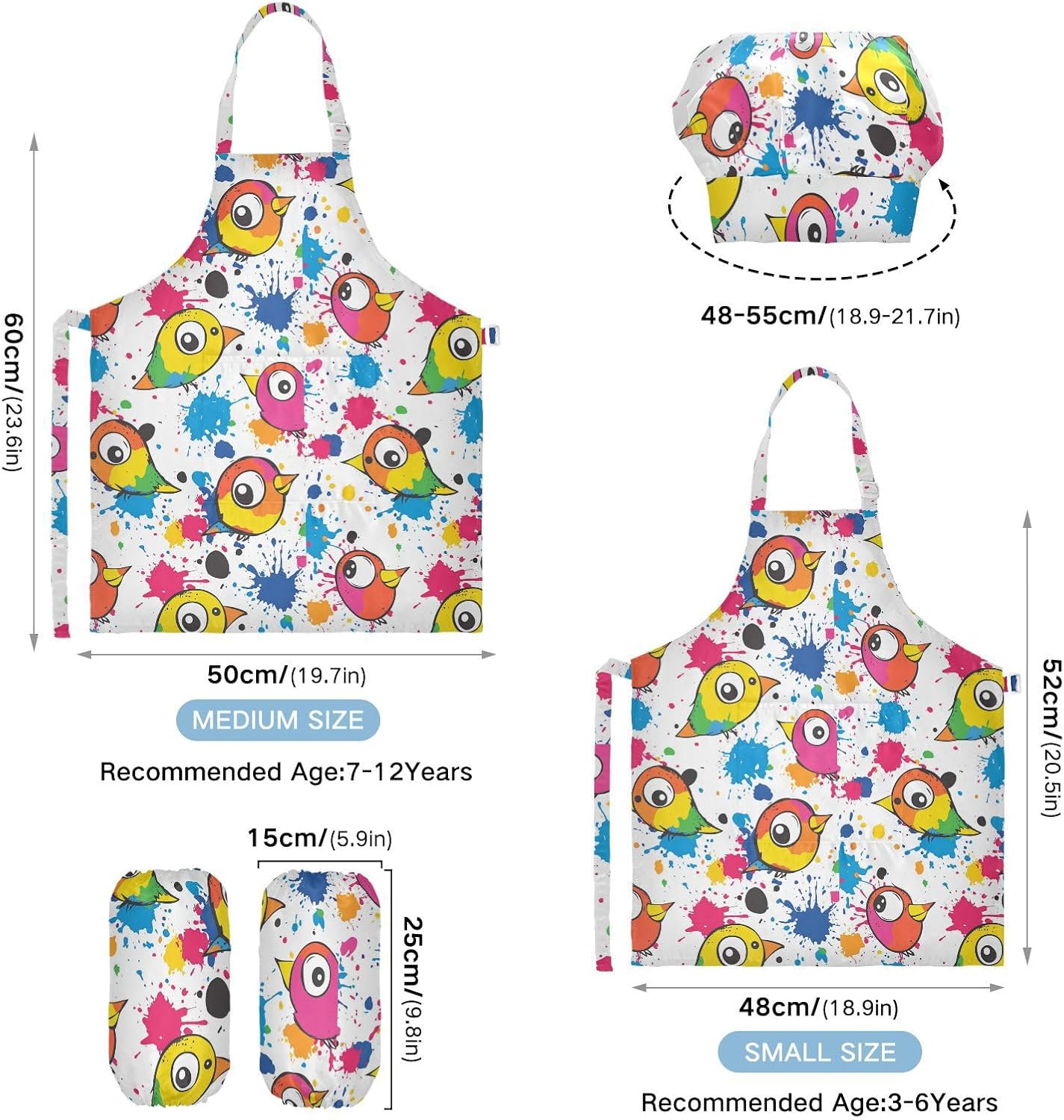 Taglia disponibile: S: 48 x 52 cm, per bambini dai 3 ai 6 anni. M: 50 x 59,7 cm, per bambini dai 7 ai 12 anni. Le taglie di cappelli e maniche condividono le stesse dimensioni. Cappello: 48-55 cm. Maniche: 15 x 24,9 cm. Materiale ecologico: il tessuto è impermeabile, leggero, accogliente, stampa adorabile alla moda, ecologico per la pelle dei bambini. Cinghia regolabile: il collo lungo e le cinghie in vita sono regolabili. È possibile regolare la cinghia in base alla lunghezza che i bambini si sentono a proprio agio per attività o vestirsi Inoltre, la cinghia regolabile può fornire abbastanza spazio per i bambini da indossare o togliere. Multiuso: i grembiuli per bambini non possono essere indossati per pittura, cucina, giardinaggio, lavaggio dei piatti, feste, arte, artigianato e attività scolastiche, ma anche per Natale, Ringraziamento, Halloween, San Patrizio, Capodanno, festa dei bambini, festival, vacanze, cene, compleanni e riunioni di famiglia. Contenuto della confezione: un grembiule impermeabile, un cappello da chef e due maniche. L'adorabile grembiule da chef per bambini può incoraggiarli a sviluppare le loro abilità di cucina, pittura, cottura, giardinaggio o altre abilità.