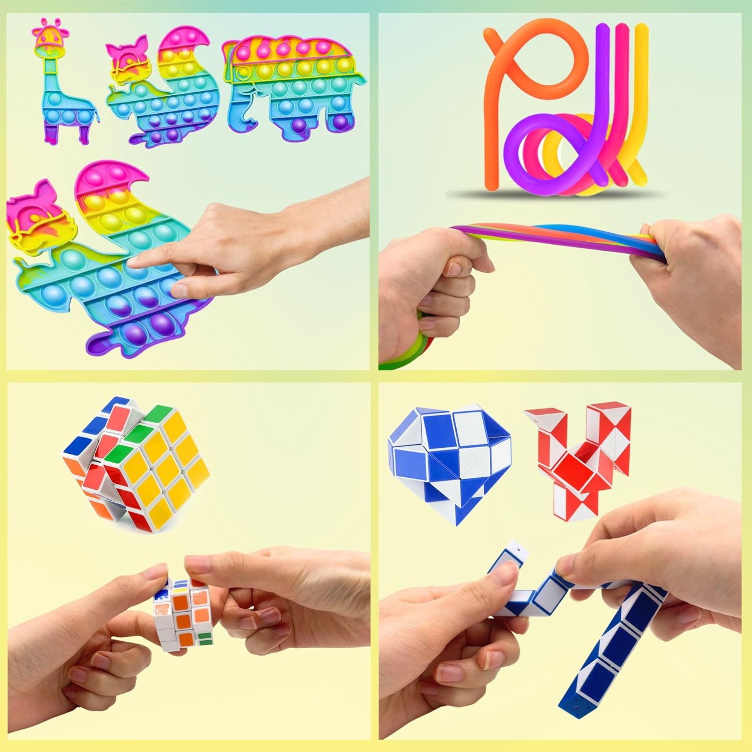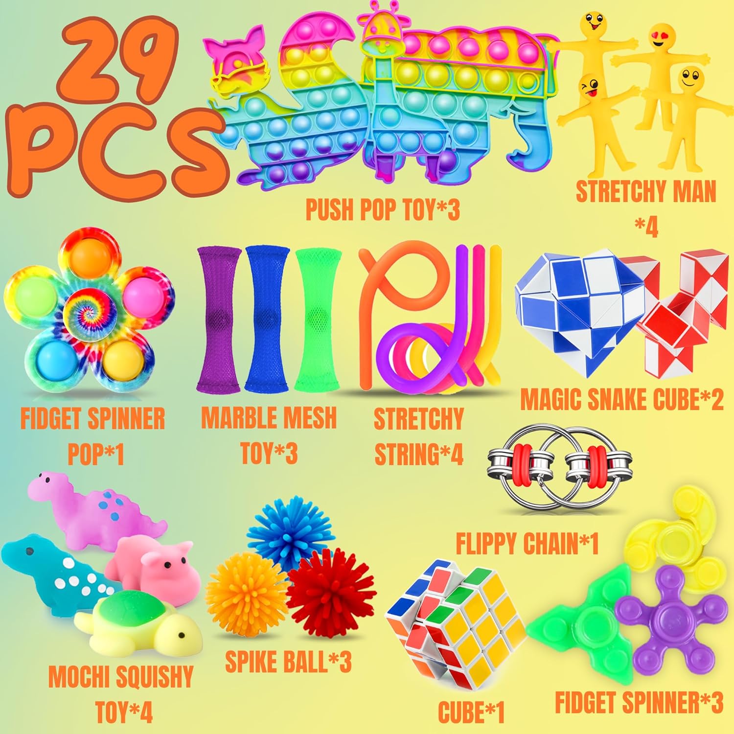 【Set completo di Peter Pan】 Il nostro set da gioco completo di Peter Pan contiene una varietà di giocattoli sensoriali per un divertimento senza fine e sollievo dallo stress. Include 3 giocattoli pop-up da spremere, 1 giocattolo pop-up di Peter Pan, 3 reti di palline, 4 corde rimbalzanti, 4 faccine rimbalzanti, 2 cubi serpente magico, 1 cubo magico, 4 giocattoli di peluche mochi, 1 catena altalena, 4 palline chiodate e 3 trottole di Peter Pan. 【Esperienza sensoriale coinvolgente】 Ogni giocattolo di questo set offre un'esperienza sensoriale unica che promuove l'attenzione, la concentrazione e il rilassamento. Dal soddisfacente "pop" dei giocattoli Push & Pop ai modelli ipnotici dei giocattoli Marble Mesh, i nostri giocattoli fidget forniscono una stimolazione tattile infinita. 【Allevia lo stress e l'ansia】 I nostri giocattoli irrequieti sono progettati per aiutare le persone di tutte le età ad alleviare lo stress e gestire l'ansia. Una varietà di giocattoli consente agli utenti di trovare il modo preferito per rilassarsi, aiutando a migliorare la concentrazione e a ridurre l'irrequietezza. 【Qualità e durata】 I nostri gadget sono realizzati con materiali durevoli e di alta qualità. Ogni giocattolo è realizzato con cura per garantire resistenza e divertimento duraturo. Sono anche portatili e perfetti per l'uso a casa, a scuola o in viaggio. Una scelta regalo perfetta: questo set di gadget è un regalo ideale per bambini e adulti. Che si tratti di un compleanno, di una vacanza o di un'occasione speciale, il nostro set offre un'ampia varietà di opzioni per intrattenere tutti. Goditi il gioco sensoriale e il relax quanto vuoi.