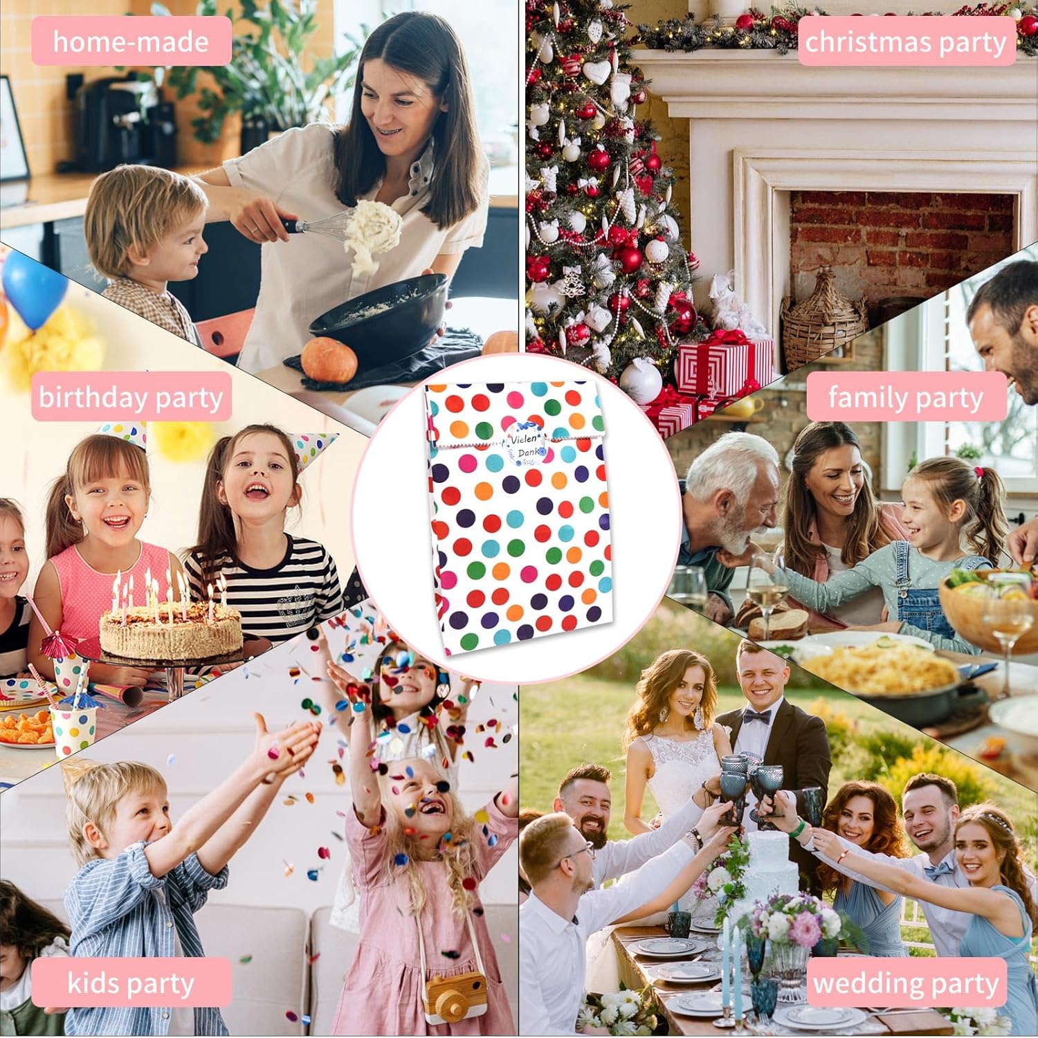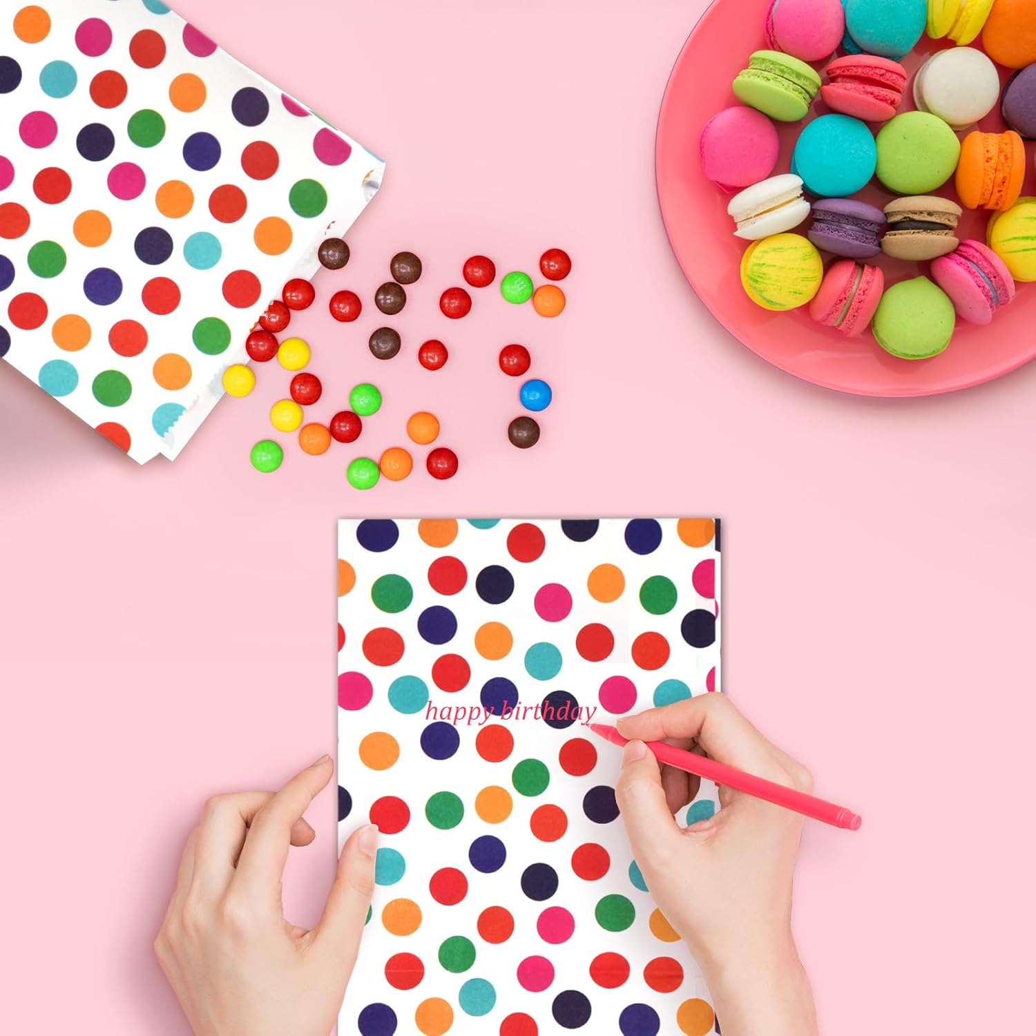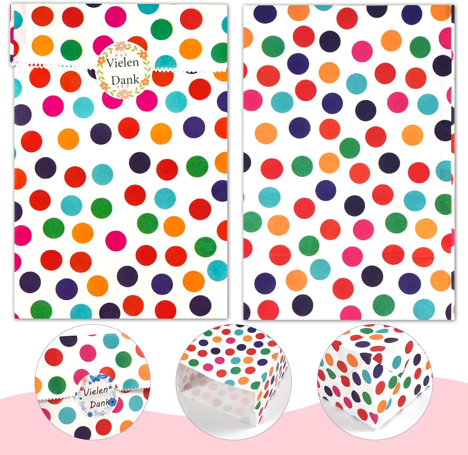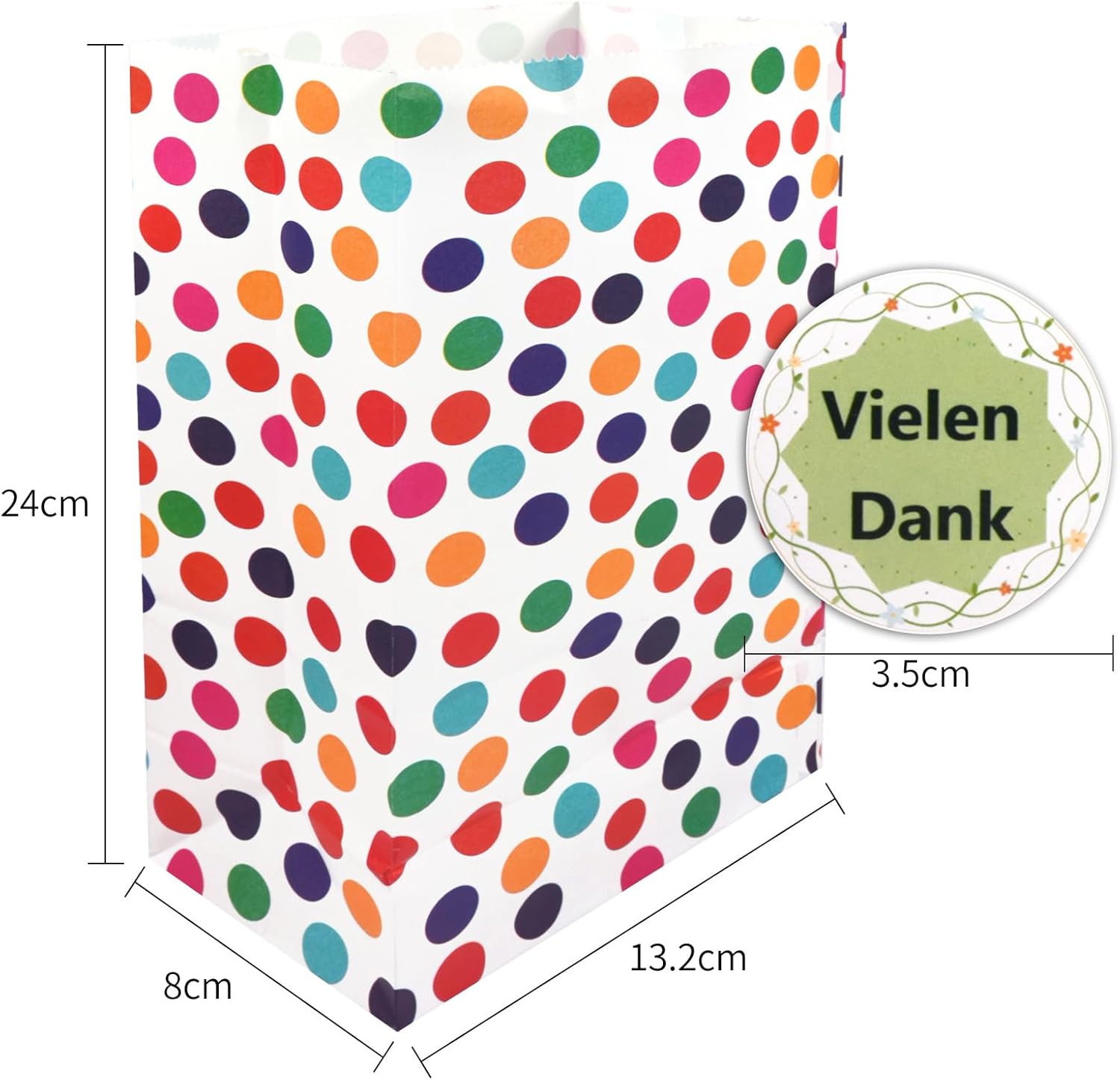 【Set di sacchetti di carta】 Questo set di sacchetti di carta per caramelle contiene 30 scatole regalo, ciascuna delle quali misura 24 cm x 13 cm x 8 cm. Le borse da festa sono basate sul bianco con punti arcobaleno, le borse di carta neon possono soddisfare le tue diverse occasioni e stati d'animo. contiene 30 adesivi "Grazie", gli adesivi hanno un diametro di 3,5 cm, dimensioni perfette per la chiusura della borsa e gli adesivi possono essere utilizzati anche come etichette. 【Materiale di alta qualità】 Le scatole regalo sono realizzate in buona carta kraft con una lunga durata, quindi il nostro prodotto è riutilizzabile, ecologico, inodore e sicuro per i tuoi usi, biodegradabile, riciclabile, pieghevole, che offre comodità per il trasporto e l'uso quotidiano. Multiuso: sacchetti per caramelle, sacchetti per biscotti, sacchetti per popcorn, sacchetti per panini, picnic, compleanni per bambini, negozi di alimentari, baby shower, addii al nubilato, matrimoni e feste per il tè, piccoli pacchetti di giocattoli, arti e mestieri, sacchetti per feste, centro commerciale come custodia per piccoli regali. Bello per conservare cibo, pane, panini, snack, biscotti, torte, popcorn, piccoli giocattoli. 【Ampie occasioni】 Può essere utilizzato come sacchetto regalo ed è adatto anche come sacchetto per la spazzatura usa e getta durante i viaggi, sacchetti per la cacca degli animali domestici, sacchetti per il vomito. I nostri sacchetti di carta sono perfetti per Natale, compleanno, Halloween, Ringraziamento, Pasqua, matrimonio, festa, barrette di cioccolato, sacchetti per calendari dell'Avvento e altre celebrazioni. Adatto anche per confezionare bomboniere, oggetti fatti in casa e piccole sorprese.,Buon design: il sacchetto di carta colorata ha un design con un bordo seghettato umanizzato che impedisce il taglio della mano. Il fondo è svasato in una forma quadrata, piatta e ordinata, solida e durevole nella capacità di carico e presenta una rientranza evidente per una facile piegatura. Stampati con motivo a pois per renderli assolutamente carini e accattivanti.
