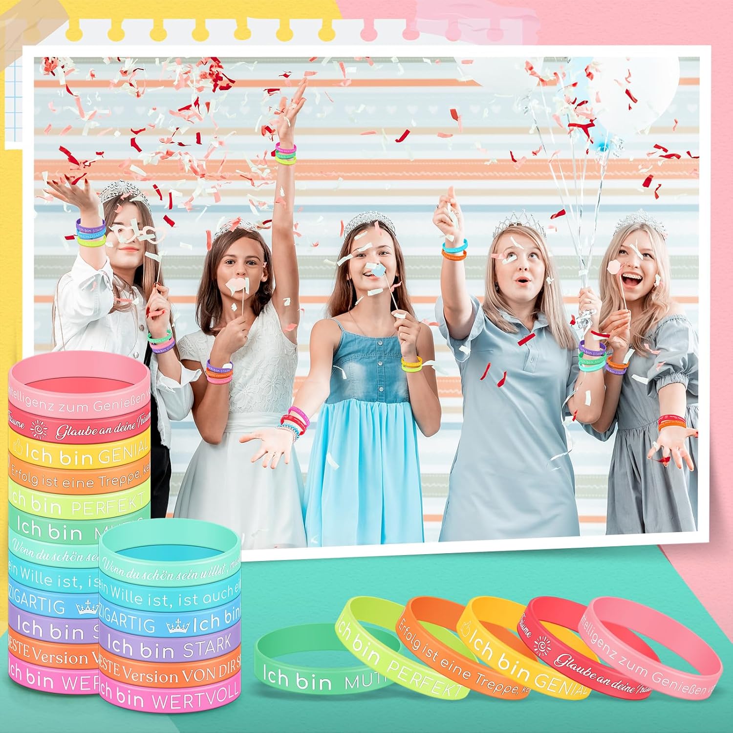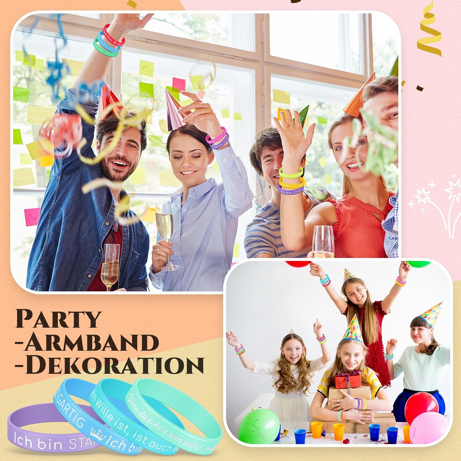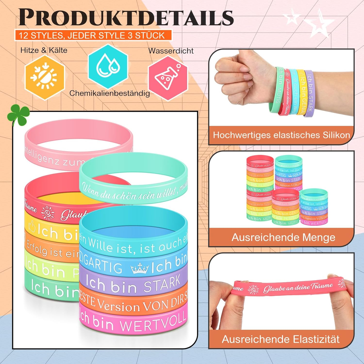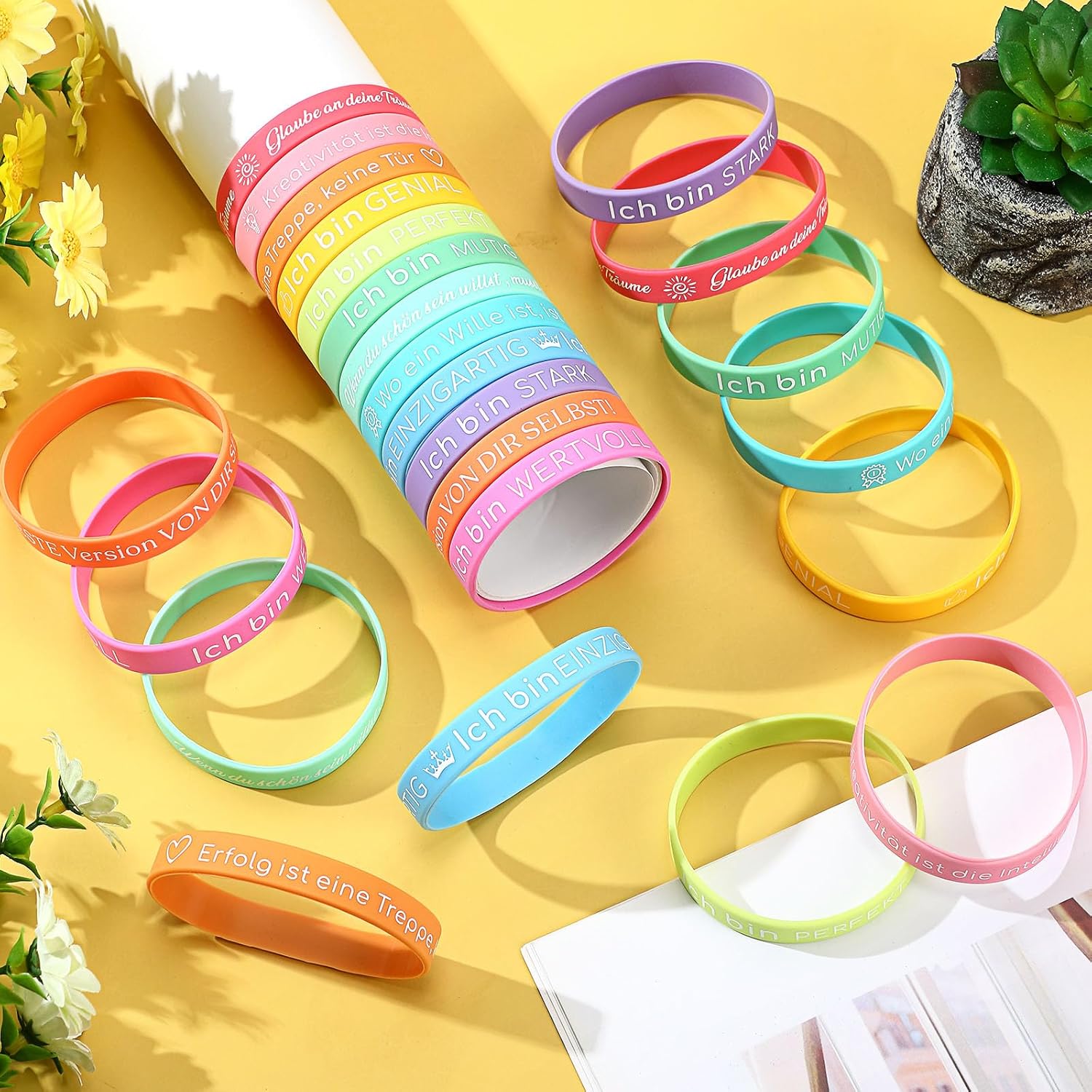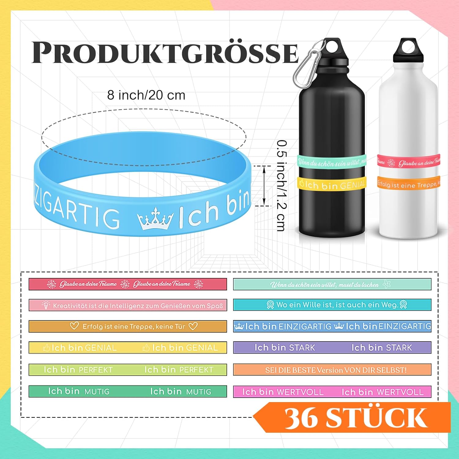 In quantità sufficiente: riceverai 36 braccialetti motivazionali tedeschi, ogni braccialetto è decorato con una citazione ispiratrice tedesca; In totale ci sono 12 citazioni classiche tedesche di cui 12 colori diversi, tre braccialetti per ogni colore; Questa quantità è sufficiente per uso personale o da condividere con familiari e amici per trasmettere loro il potere dell'ispirazione. REGALO SQUISITO: i braccialetti per adolescenti sono la nostra gamma di regali motivazionali; Sono stampati con citazioni ispiratrici e motivi raffinati, come [I am STRONG], [I am GREAT], [YOU CAN DO IT]; Questi braccialetti di incoraggiamento possono servire da incoraggiamento e motivazione nei momenti difficili; Non sono solo un accessorio pratico, ma anche un regalo ideale per mostrare affetto e cura. Durevoli e affidabili: questi braccialetti motivazionali in gomma sono realizzati in silicone di alta qualità, morbido, sicuro e durevole, adatto per un uso a lungo termine; Con una buona elasticità, possono espandersi liberamente e non limitare le attività del polso. Misura adatta: abbiamo progettato attentamente le dimensioni dei braccialetti in gomma ispirazionali con una circonferenza di 20 cm, una larghezza di 1,2 cm e uno spessore di 0,3 cm, rendendoli adatti alla maggior parte delle persone senza essere troppo ingombranti, sembrano grandi o troppo stretti; Si prega di controllare la taglia prima dell'acquisto per garantire una perfetta vestibilità al polso. Multiuso: questi braccialetti in silicone con scritta positiva sono regali ideali per studenti universitari, colleghi, appassionati di sport o membri del team; Sono anche ottimi premi per eventi sportivi, feste a tema, lauree, immatricolazioni o come premio di classe; Indipendentemente dall’occasione, possono esprimere energia positiva